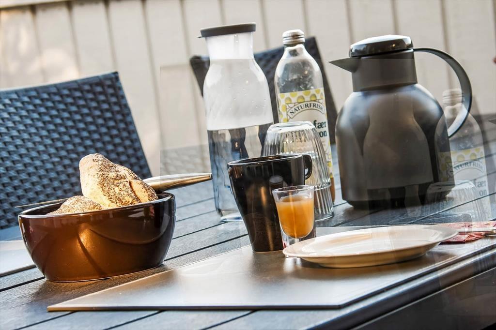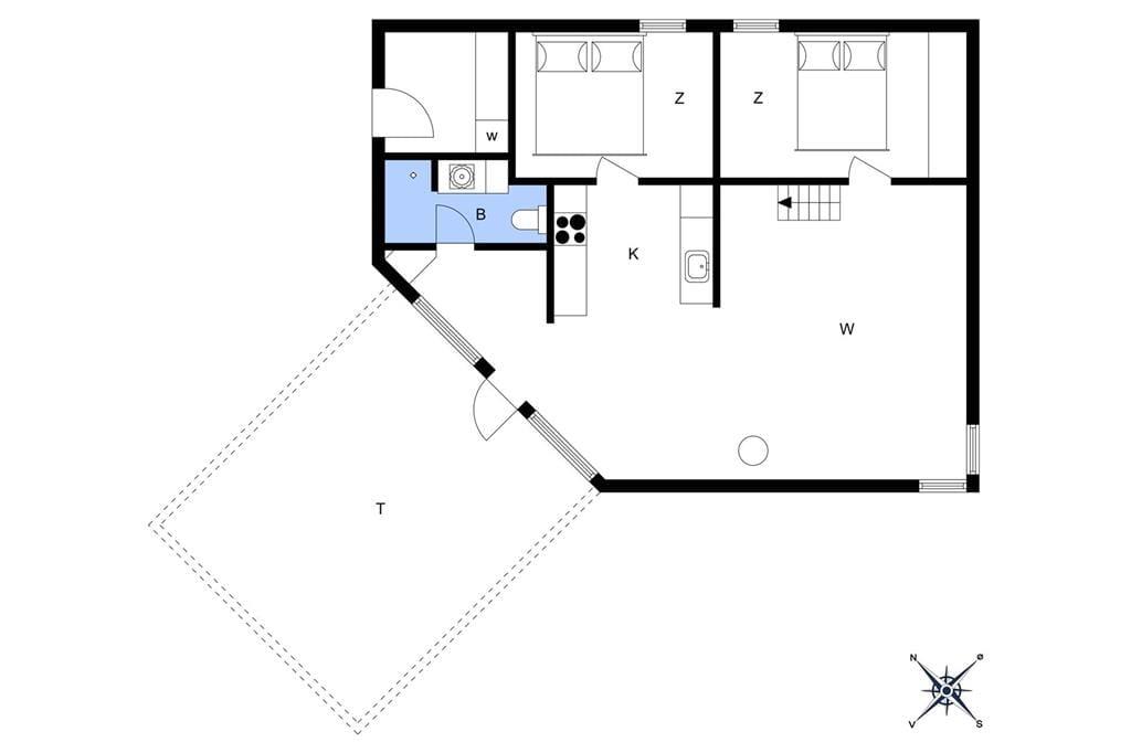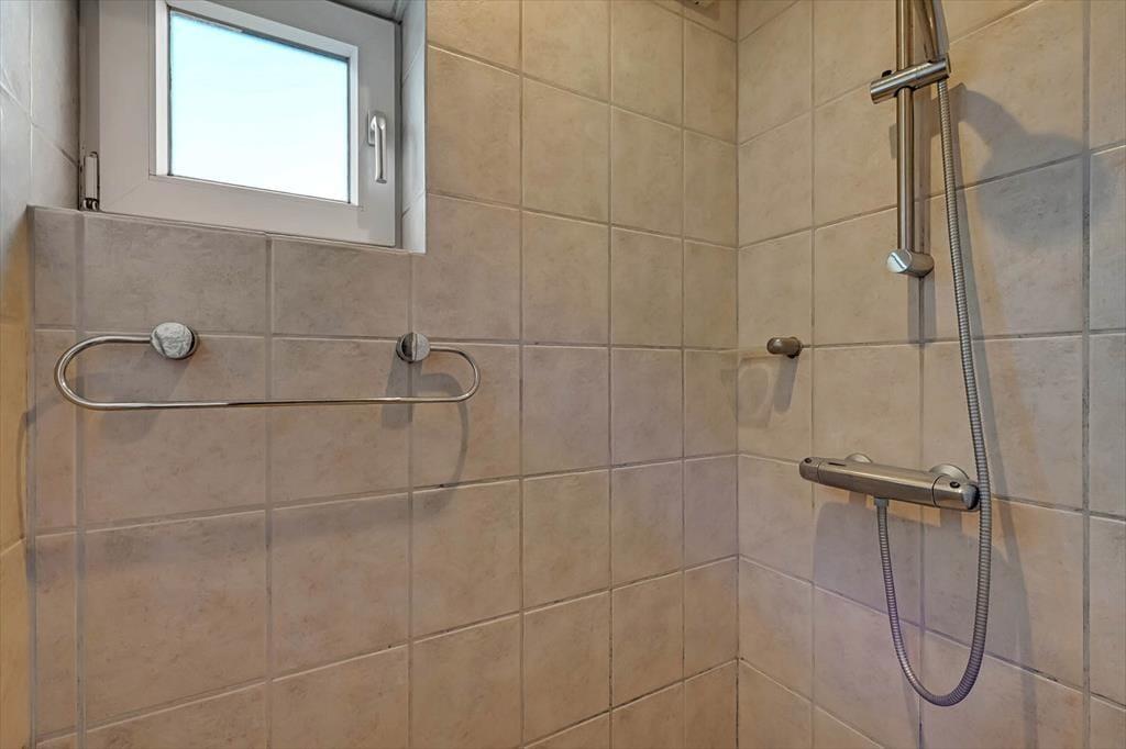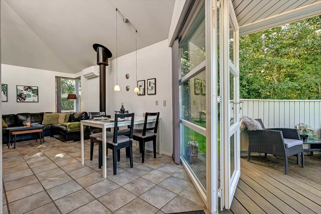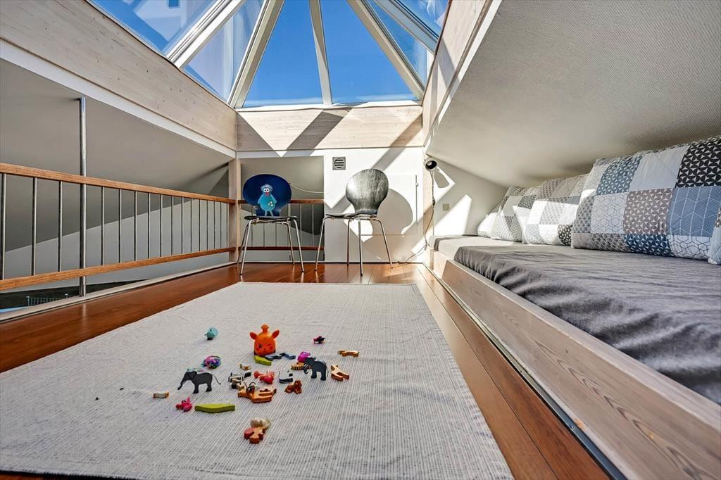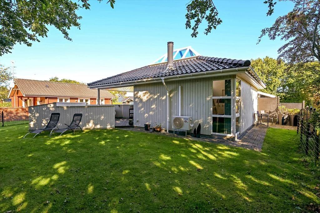 Feriehuset fra 2003 fremstår stadig morderne, det takket være grundig pleje og ordentligt vedligehold. Stilfuld indretning præger alle rum – også badeværelset og de to soveværelser, der er indrettet med henholdsvis en dobbeltseng og to enkeltsenge. Det mest bemærkelsesværdige rum er dog stuen, for den byder på en original indretning med åben køkkenafdeling, hems og skrå lofter, der går op til et rytterlys helt i toppen. Takket være den åbne planløsning får I glæde af ovenlyset, når I sidder i stuen nær brændeovnen, og hvis I lægger jer i hemsens niche med madrasser om aftenen, har I fri udsigt til stjernehimlen. Blandt de mere praktiske detaljer har I desuden adgang til et lille bryggers med vaskemaskine samt ekstra fryser og køleskab.