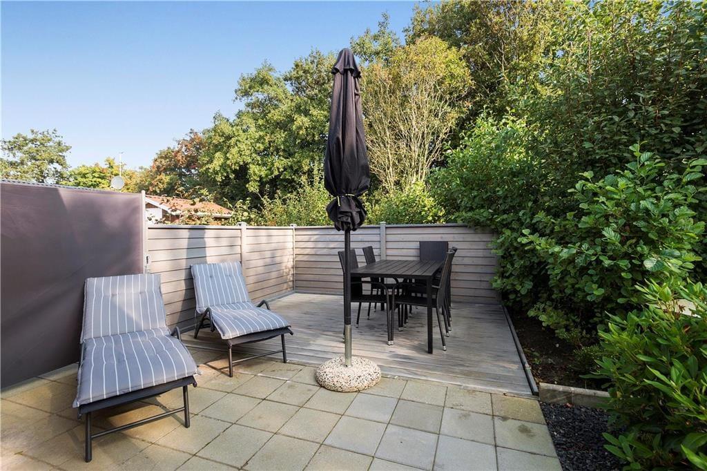 Er det udevejr, har I flere terrasseområder at vælge imellem: I kan både sidde syd og øst for huset, hvis ikke i foretrækker den dejligt afskærmede terrasse, der ligger i baghaven ved siden af en sandkasse.