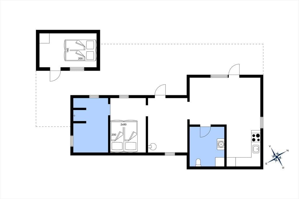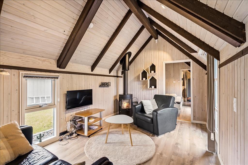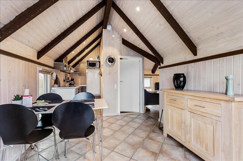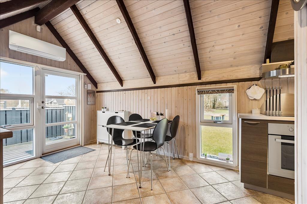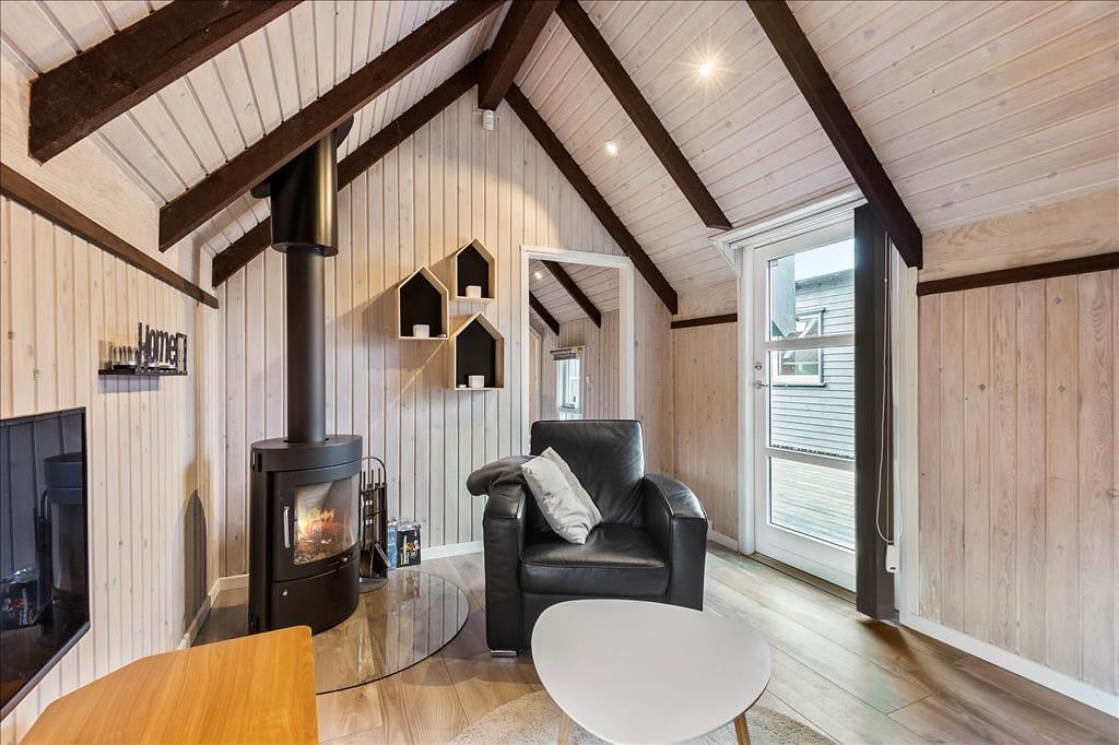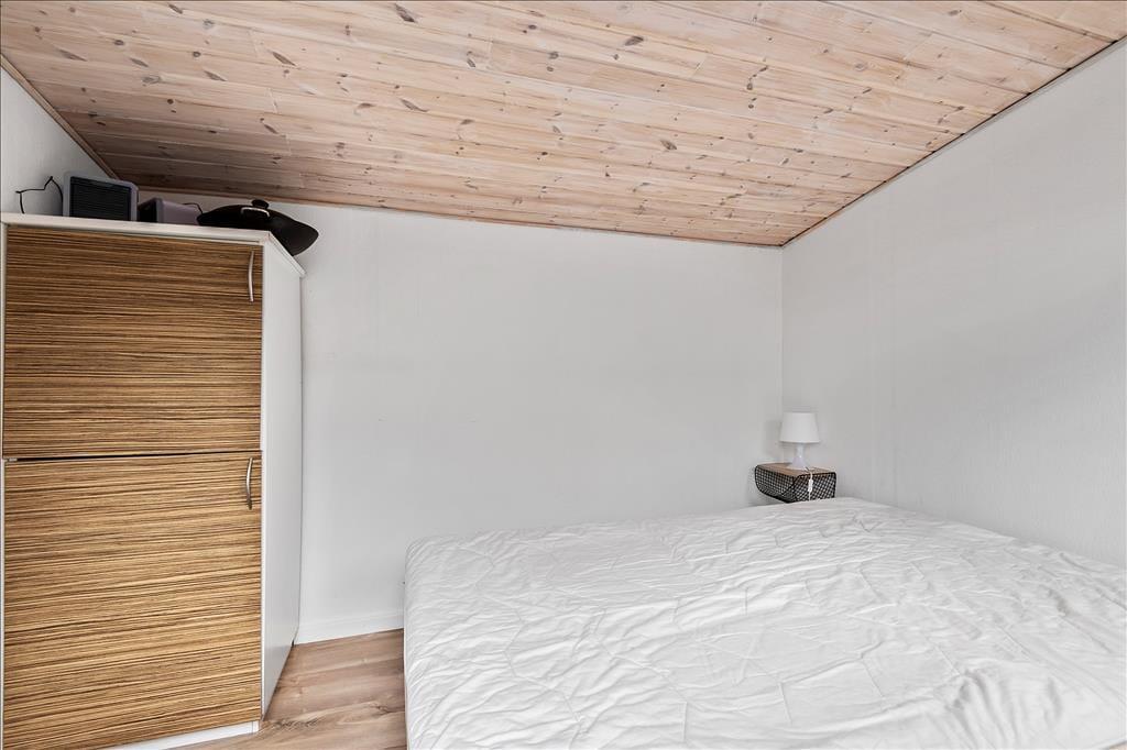 Huset er blevet renoveret i 2018, så det fremstår pænt og velholdt. De moderne møbler er både komfortable og kønne at kigge på, og så sørger kiploftet, brændeovnen og de lyse trælister på væggene for den helt rette sommerhusatmosfære, når I slapper af i sofaen eller deler et lækkert måltid omkring spisebordet. Et veludstyret køkken med spiseplads ligger i åben forbindelse med stuen, hvor brændeovnen står. Herfra har I adgang til et soveværelse med dobbeltseng, og for enden ligger et badeværelse med bruseniche. Toilettet ligger separat, og her i rummet er der både gulvvarme og vaskemaskine. Har I brug for ekstra sengepladser, kan I nemt skrå over terrassen til annekset, som også er indrettet med dobbeltseng.