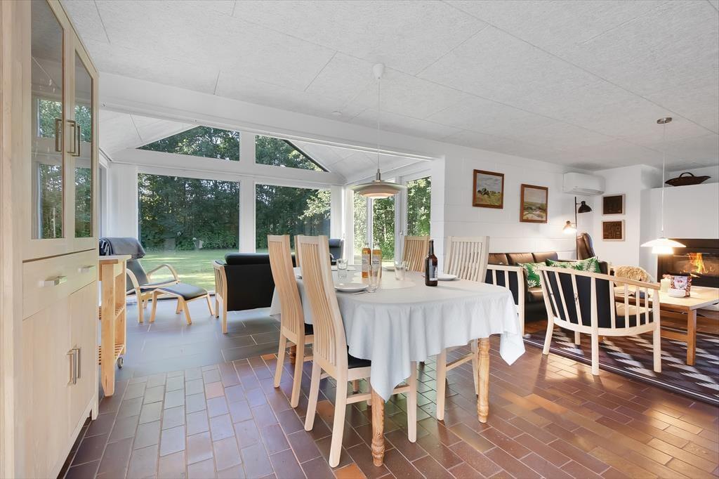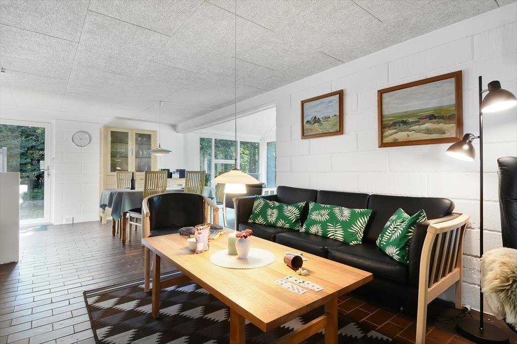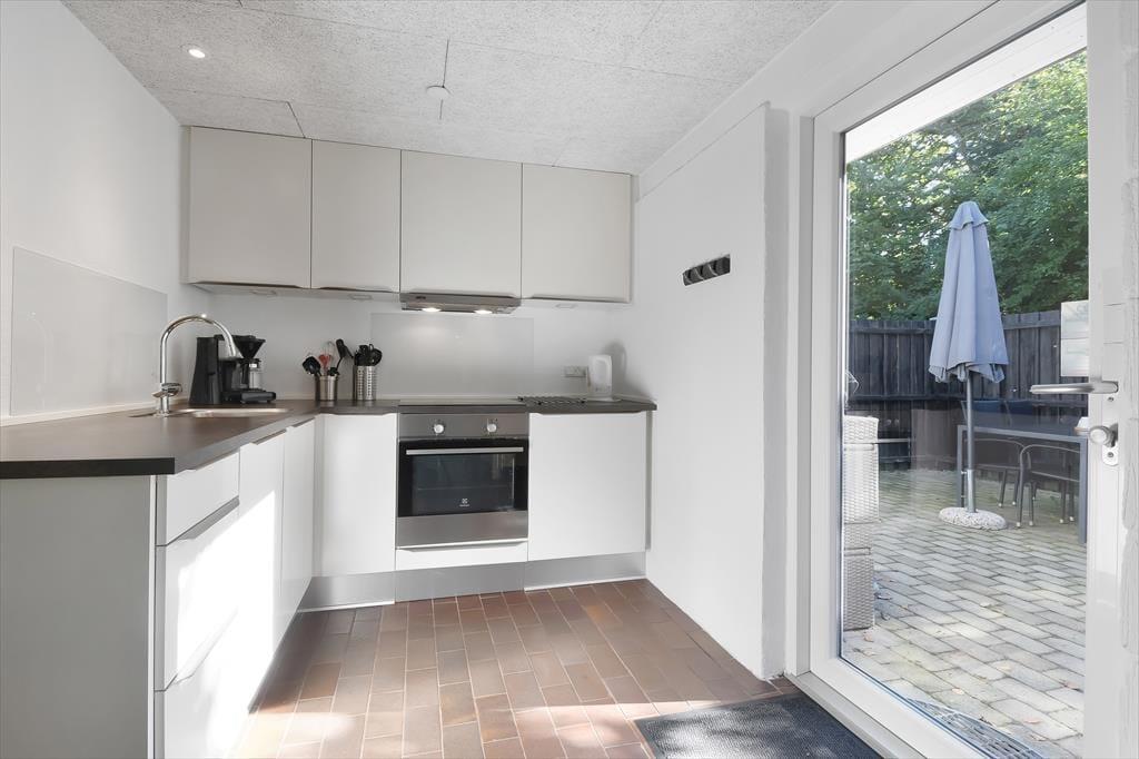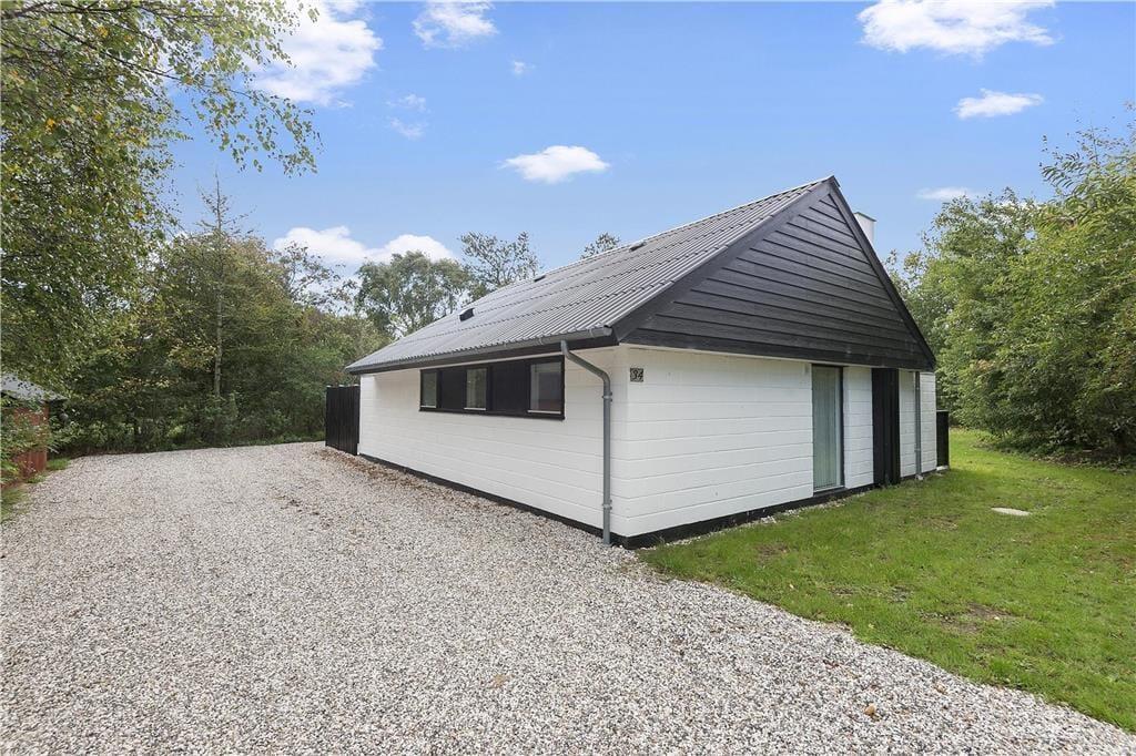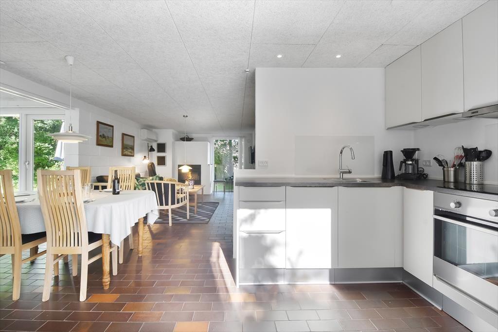Den skønne beliggenhed er bestemt ikke eneste kvalitet ved sommerhuset. Den gedigne ejendom er senest blevet renoveret i 2018, og det kan blandt andet ses i den moderne køkkenafdeling, der ligger i åben forbindelse med stuen. Her i stuen hører pejseindsatsen til de charmerende detaljer, og de store vinduespartier sørger for, at I får glæde af det gode lysindfald og udsigten til den grønne have, når I hygger jer indenfor i varmen. Er det ved at være sengetid, kan I skiftes til at børste tænder på badeværelset, inden I går til ro på de to soveværelser, der er indrettet med henholdsvis en dobbeltseng og to enkeltsenge. Har I brug for at vaske tøj eller fryse fisk fra fisketuren ned, har I for øvrigt adgang til et udhus med både vaskemaskine og kummefryser.