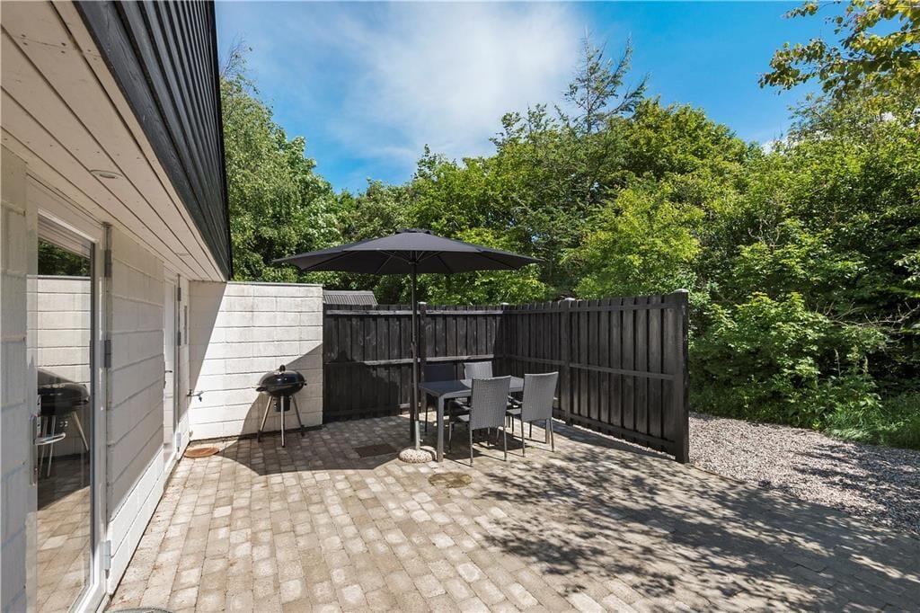 Fra stuen kan I træde direkte ud på en sydvendt terrasse og videre ud på havens grønne græsplæne, der omkranses af tæt og varieret randbeplantning. Ved husets hovedindgang er der anlagt endnu en fliseterrasse, og her sørger plankeværket for læ, så I kan nyde sol og ugeneret sommerliv i fulde drag.