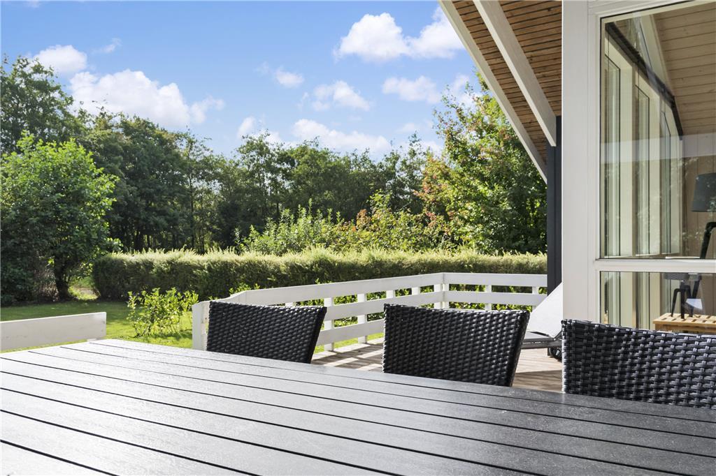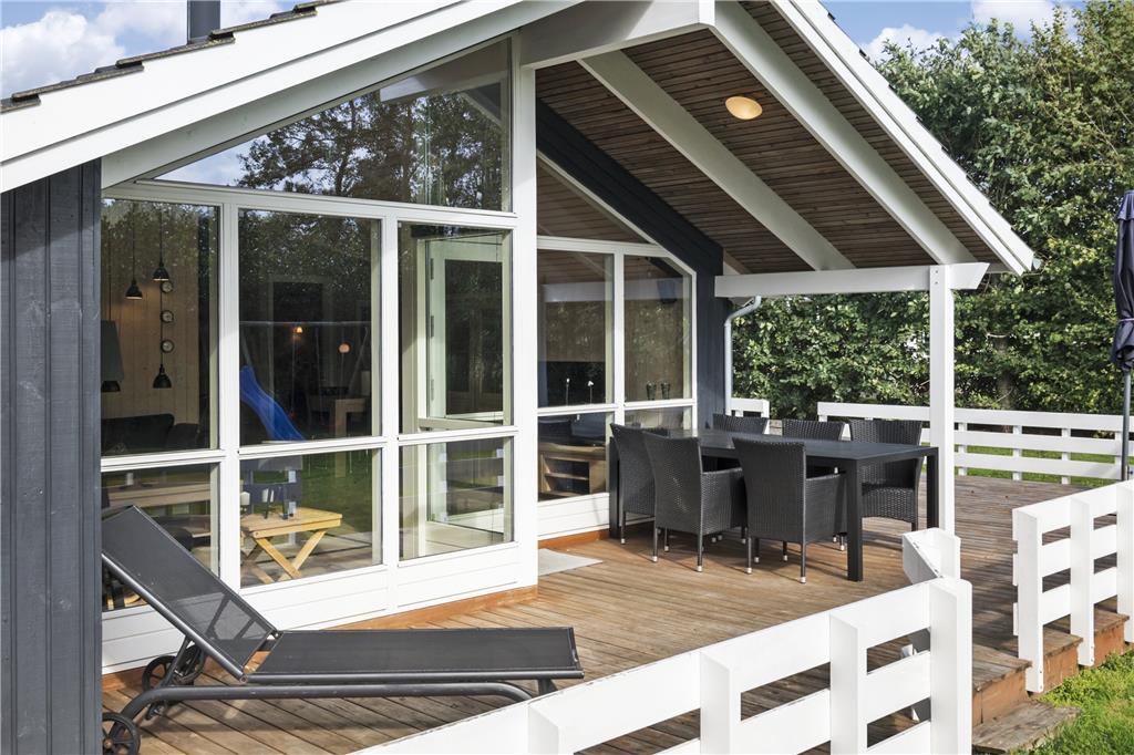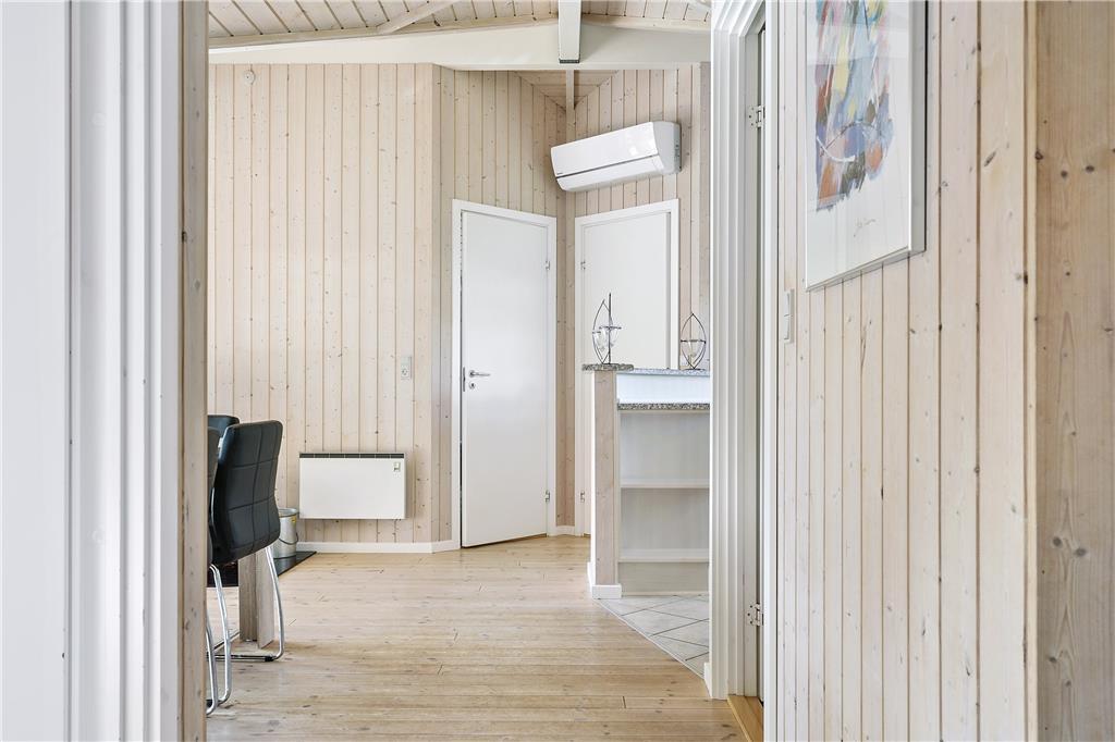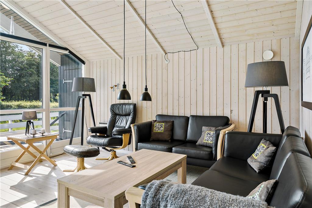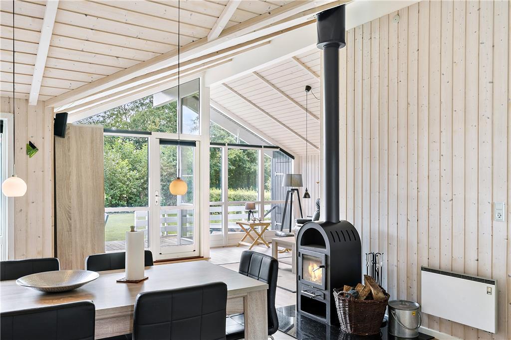 Selvom ferieboligen er et moderne byggeri fra 2004, er det fuld af klassisk sommerhusatmosfære: Inden døre er der lyse trælister på væggene, loft til kip og brændeovn, og i forlængelse af badeværelset ligger en sauna, så I kan blive varmet igennem og komme helt ned i tempo. Udover badeværelset finder I tre gode soveværelser i huset, og endelig er der det centrale samlingspunkt i form af en skøn stue med integreret køkken. Spisebordet er placeret tæt på både køkkenet og brændeovnen, så det er et hyggeligt sted at slå sig ned og hyggesnakke før, under og efter måltiderne. I kan selvfølgelig også vælge at sidde mere blødt, og i så fald kan I rykke over i sofaafdelingen, hvor det store fladskærms-TV kan stå for underholdningen.