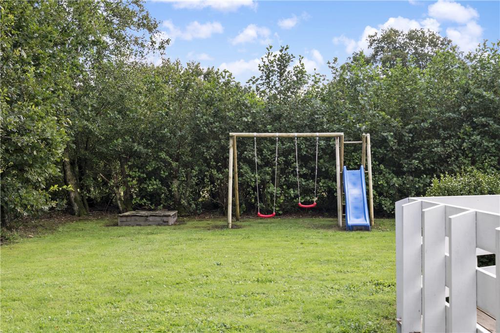 Grunden omkranses af hæk og grøn beplantning, og i bunden af haven står et gyngestativ og en sandkasse til de yngste familiemedlemmer. På græsplænen er der god plads til havespil – og hvis de voksne ikke leger med, kan de i stedet læne sig tilbage på terrassen i en komfortabel liggestol.