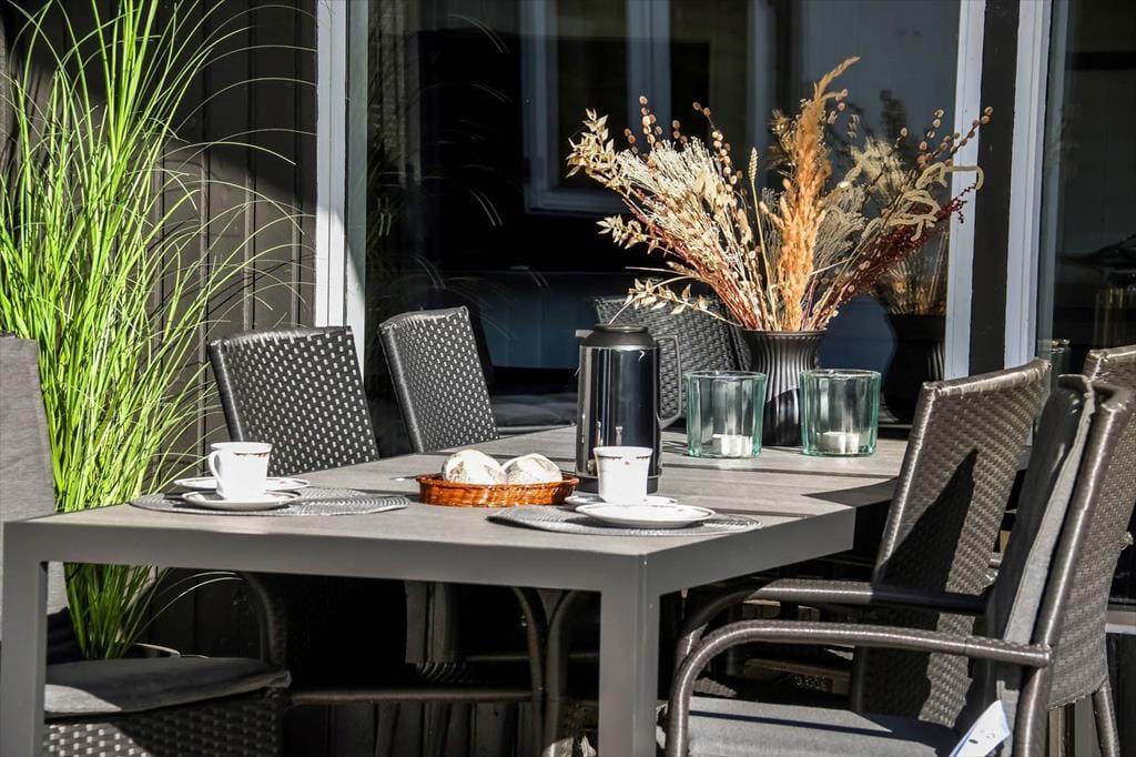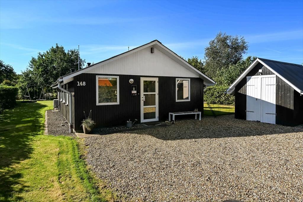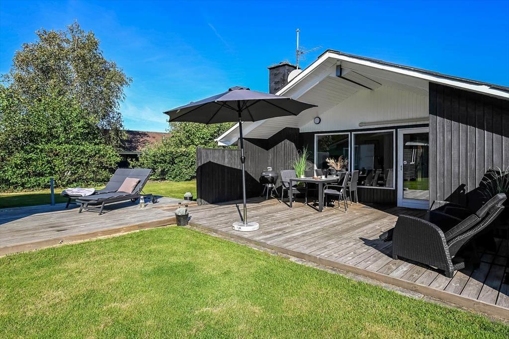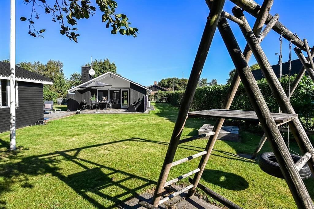 På grunden er der god plads til at parkere på grusbelægningen foran huset, mens baghaven er dedikeret til leg og afslapning. På græsplænen kan både børn og voksne spille bold og havespil, mens gyngestativet og sandkassen formentlig mest er til de yngste feriemedlemmer. Står der afslapning på programmet, er den sydvendte, delvist overdækkede terrasse et herligt sted at nyde solen det meste af dagen.