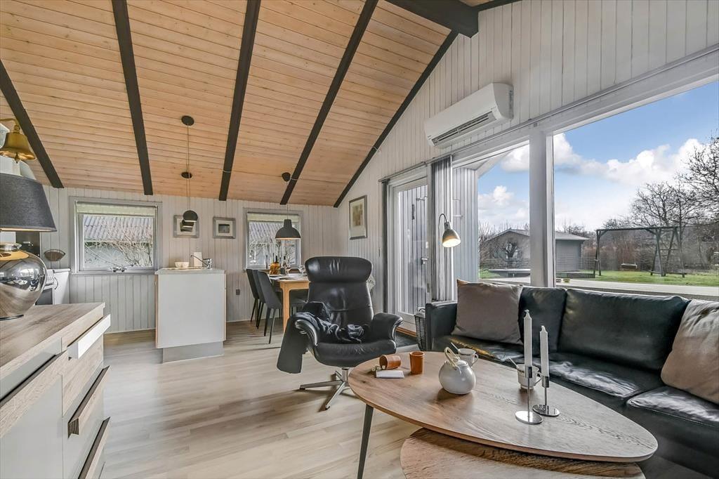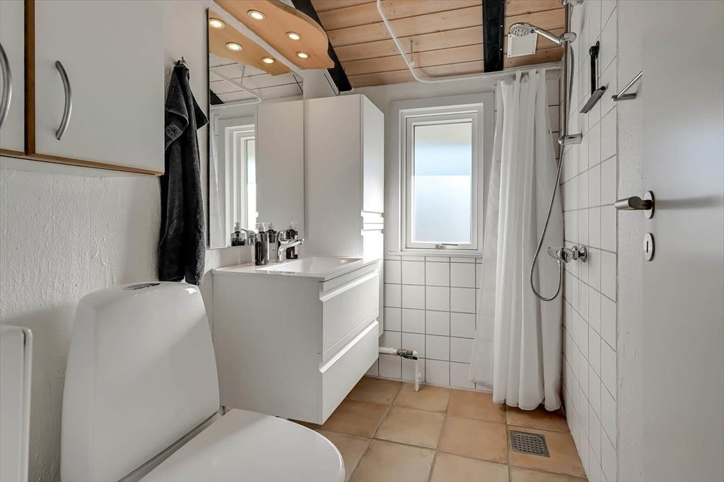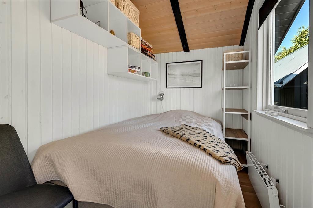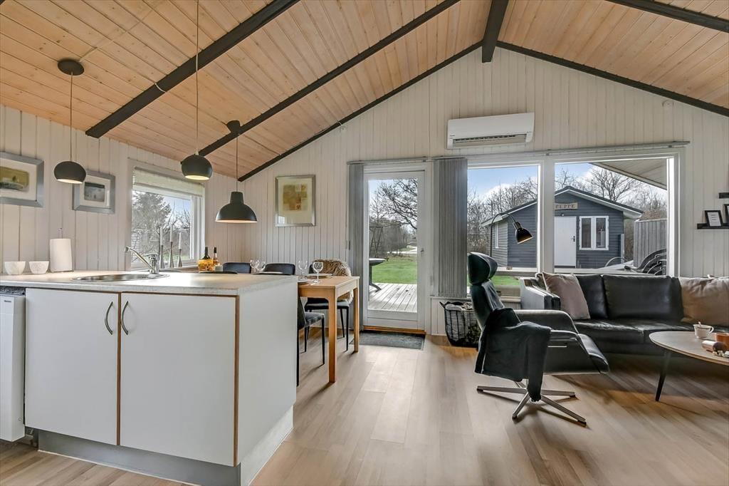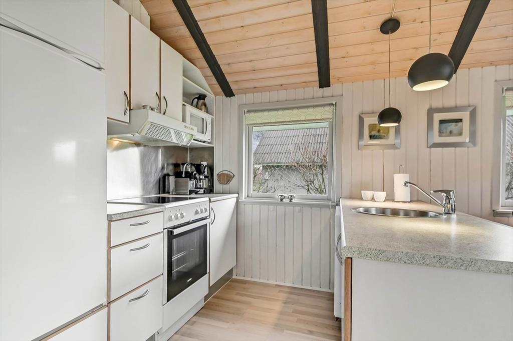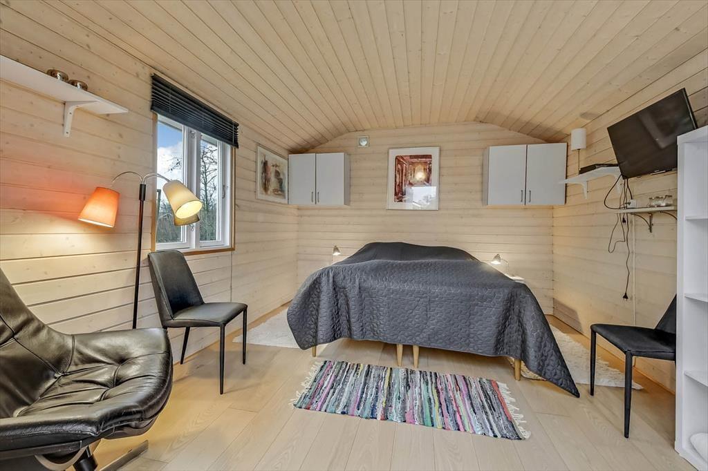 Alle rum i sommerhuset er hyggeligt indrettet, og også annekset er fuld af charme. Alligevel er det sandsynligvis i sommerhusets stue, at I vil samles, for det er nemlig et dejligt opholdsrum med spisebord, TV og en komfortabel sofaafdeling. En velindrettet køkkenafdeling er også del af rummet, så selv når I står med aftensmaden, kan I tage del i feriehyggen. Fra sommerhusets gang har I direkte adgang til et bryggers med vaskemaskine og tørretumbler, et badeværelse og to soveværelser med i alt fire sengepladser. Dertil kommer anneksets dobbeltseng, så det betyder, at i alt seks personer kan samles her i ferieoasen.