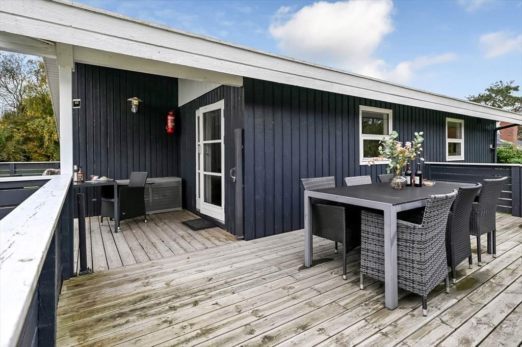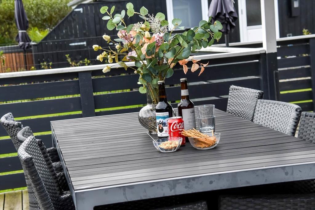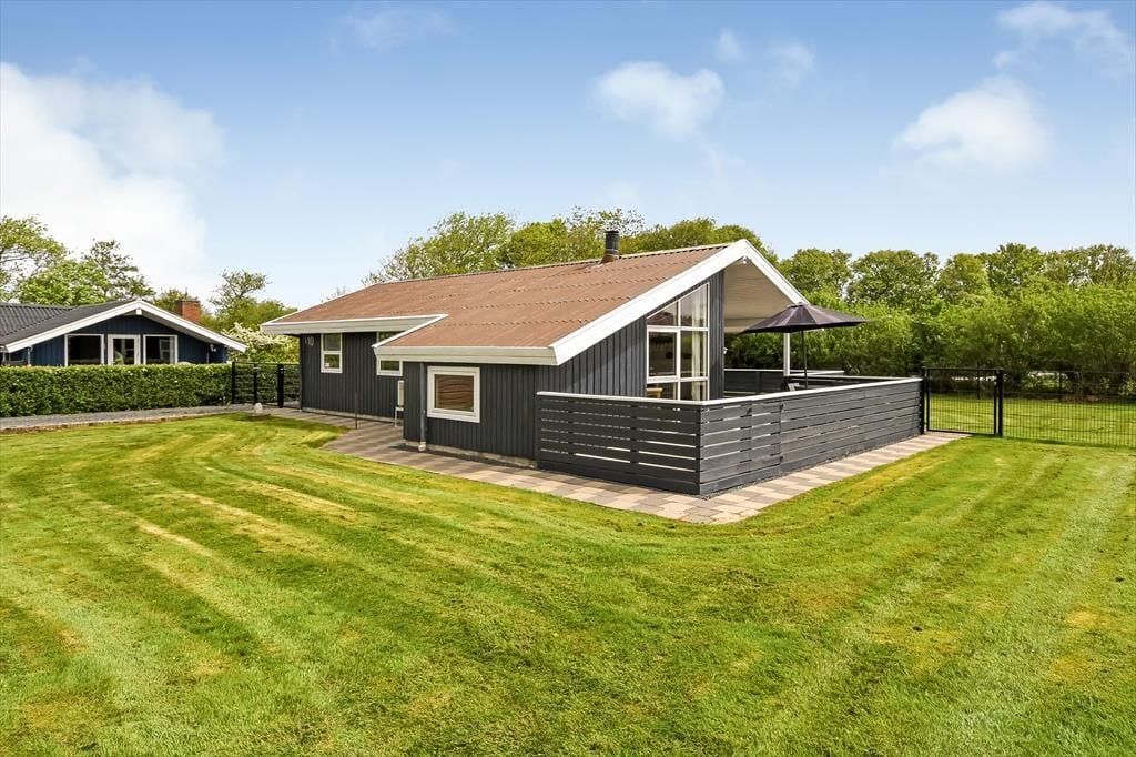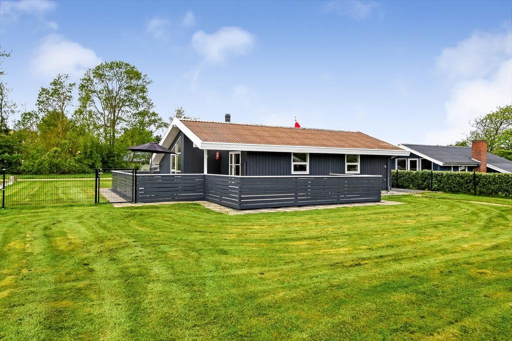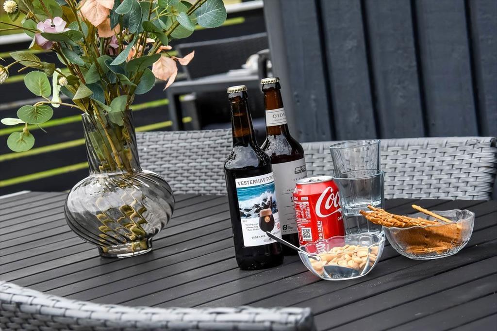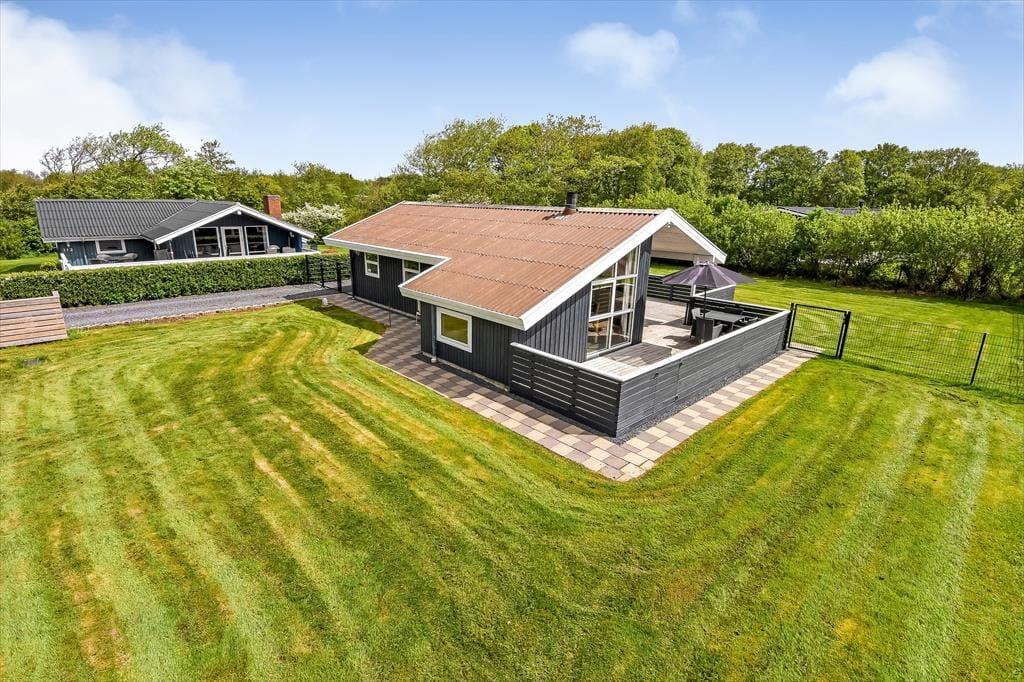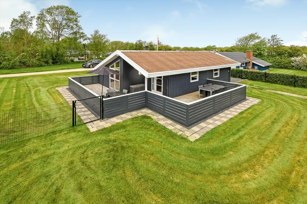 På flere sider af sommerhuset breder en stor og skøn terrasse sig. En del af terrassen er overdækket, og den er ovenikøbet helt lukket, hvilket er en rar detalje, hvis I har hund med på ferie. Er der børn i familien, har de masser af plads til at løbe og lege på grunden – og også de voksne kan deltage i et havespil på græsplænen, hvis alle solskinstimer ikke skal tilbringes tilbagelænet. Desuden er hele haven blevet indhegnet til 2024, så familiens firbenede ven frit kan løbe rundt og boltre sig på den store græsplæne. Billederne hertil at på vej.