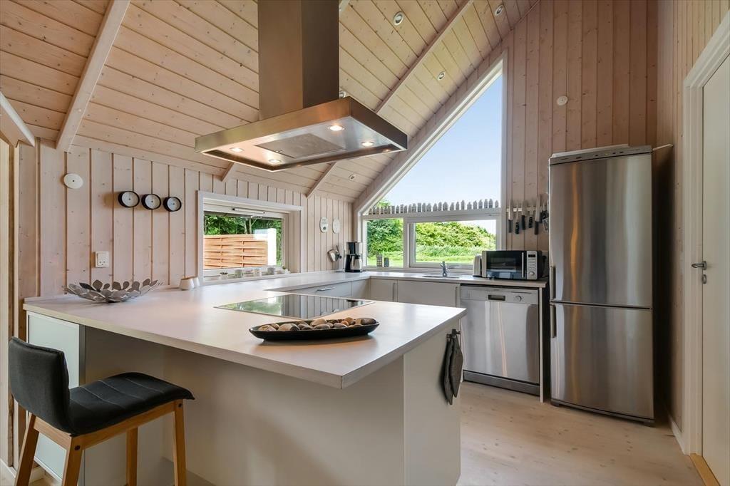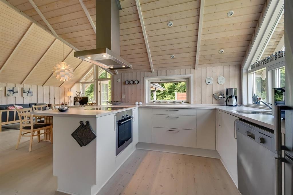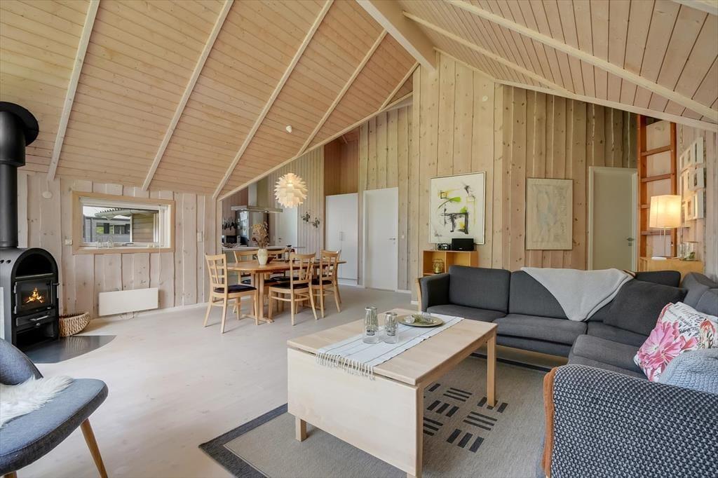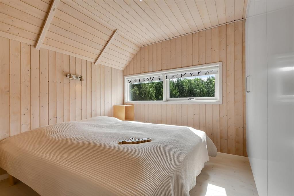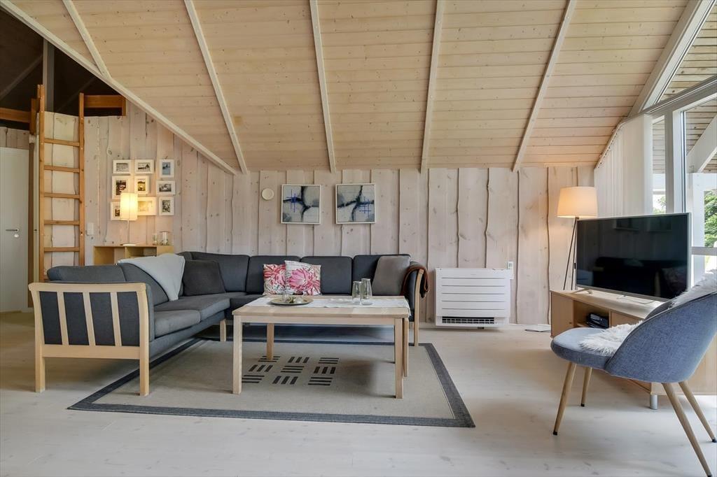 Med tre gode soveværelser, et badeværelse, et gæstetoilet og en stor stue med åbent køkken kan seks personer nemt og bekvemt være i sommerhuset – så I kan overveje, om I skal invitere et par venner med på ferie. Uanset hvem og hvor mange I bliver, vil I garantere sætte pris på husets indbydende atmosfære og hyggelige indretning med komfortabelt møblement. Overalt er der lyse trælister på væggene og loft til kip i klassisk sommerhusstil, og særligt i stuen er lysindfaldet ekstra godt takket være det store vinduesparti, der går fra gulv til loft. En brændeovn står klar til de kølige aftner, og hvis I har brug for digital underholdning, gør stuens Smart-TV det nemt at se jeres yndlingsfilm og -serier. Trænger I til at slappe fuldstændigt af, kan I gøre klar til et varmt spabad og en tur i saunaen på det store livsnyderbadeværelse.