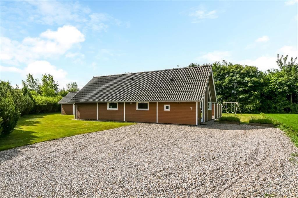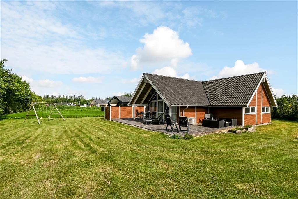 På en solrig dag er det oplagt at flytte ferietilværelsen ud på den store og delvist overdækkede træterrasse, der smyger sig om tre af sommerhusets sider. Grunden er på 1200 m2, så der er god plads til at lege og spille bold på græsplænen, og der står også et gyngestativ til de yngste feriegæster.