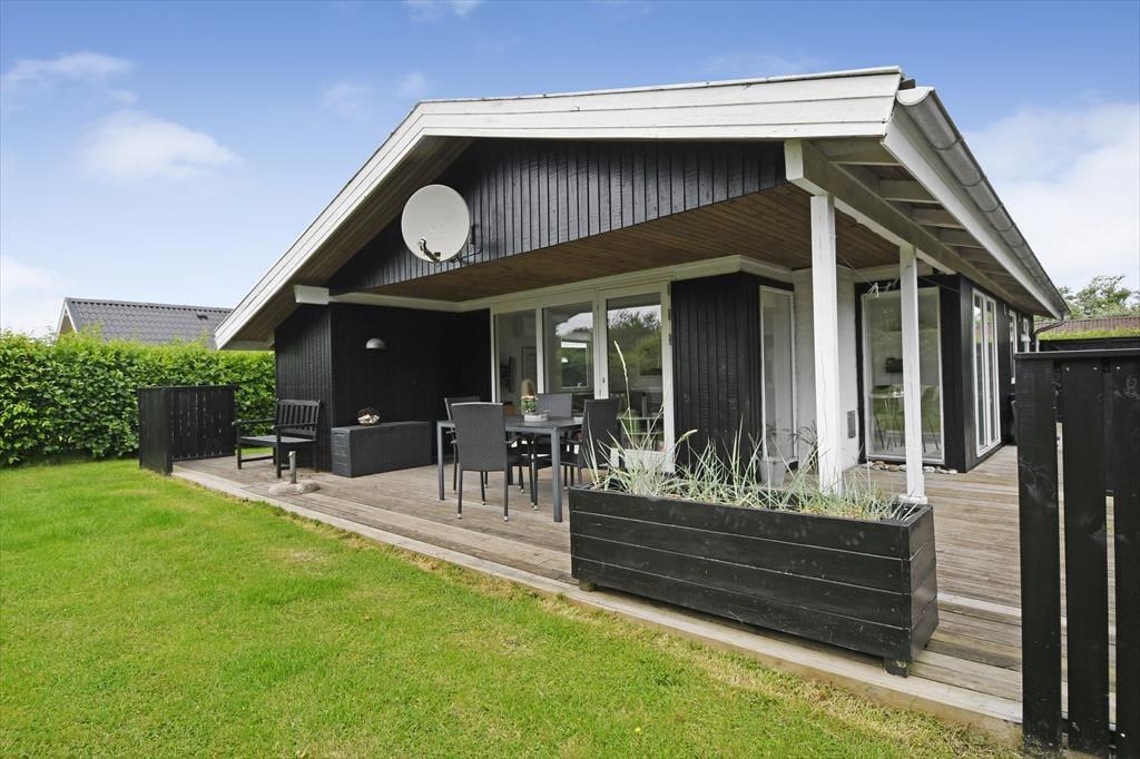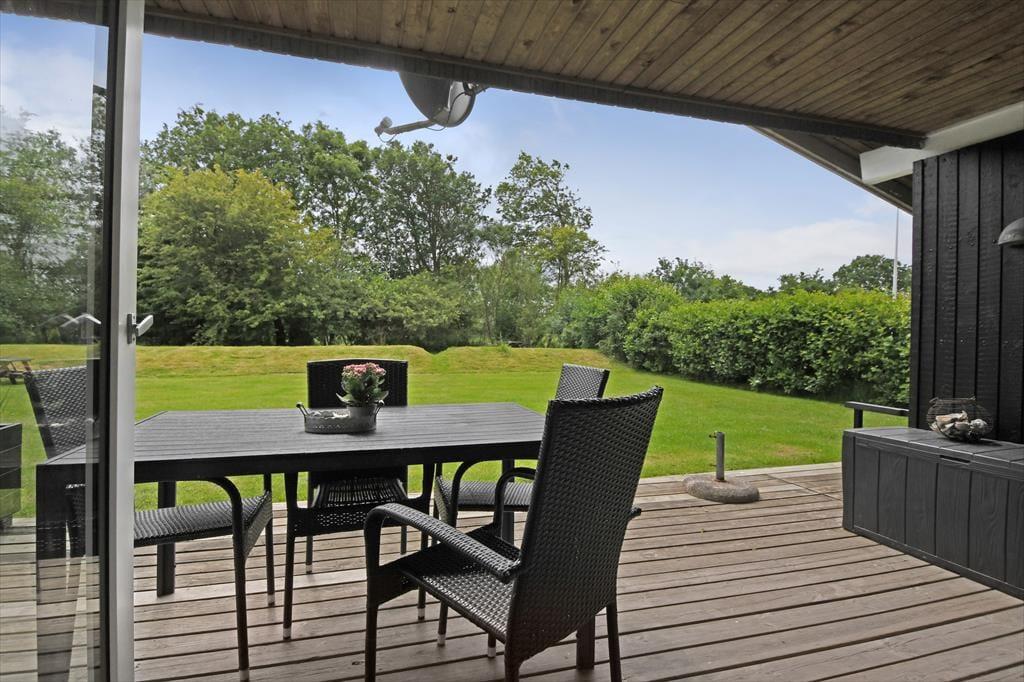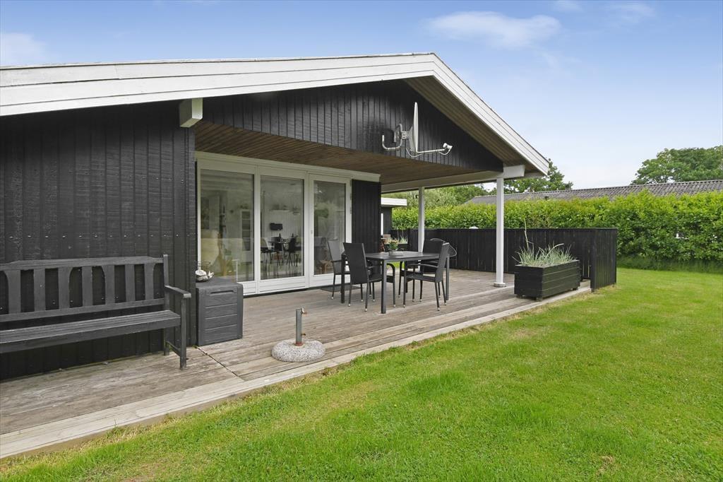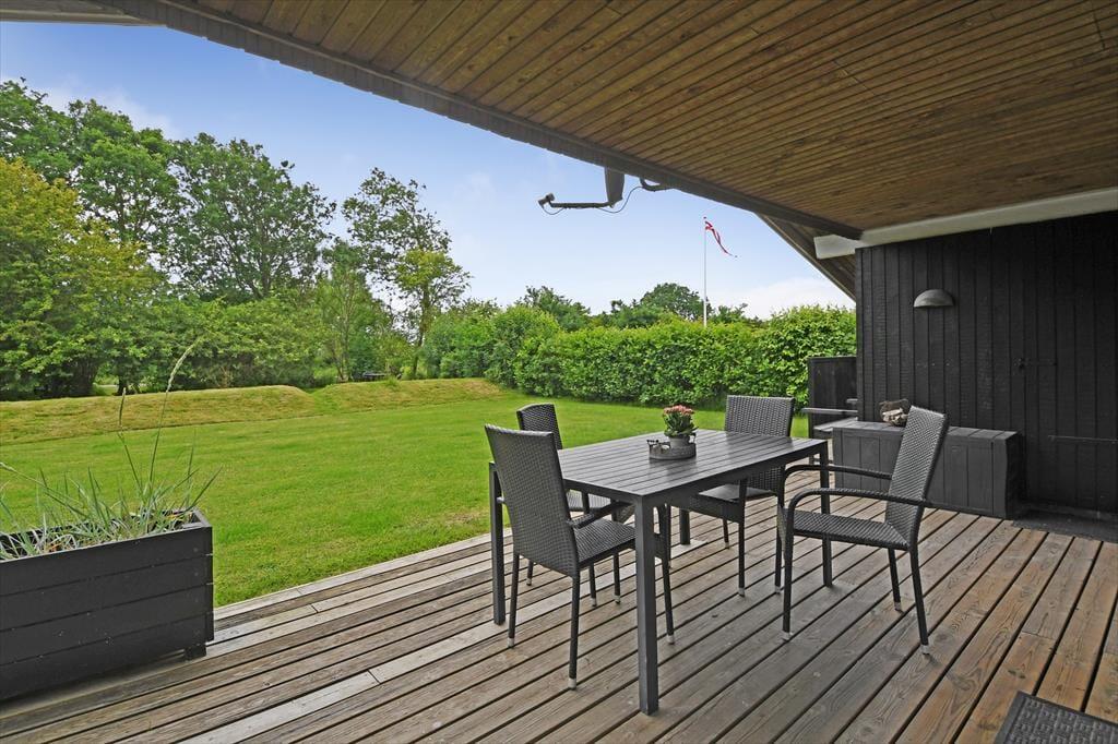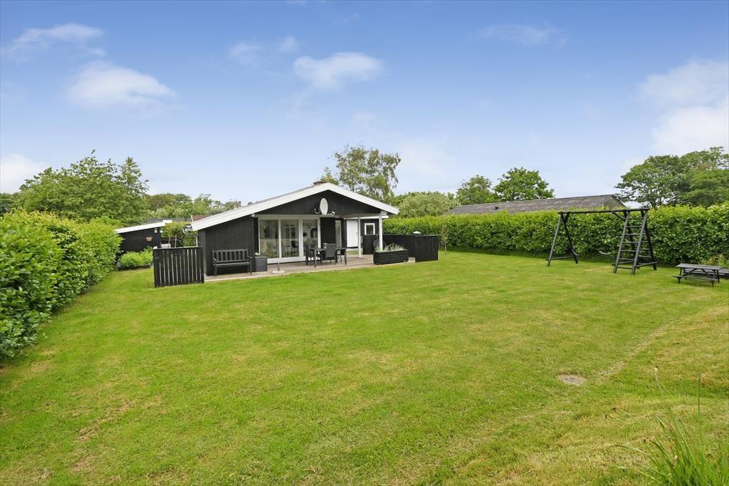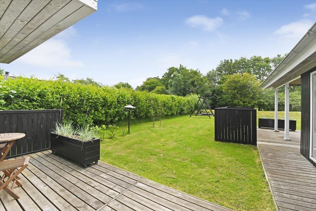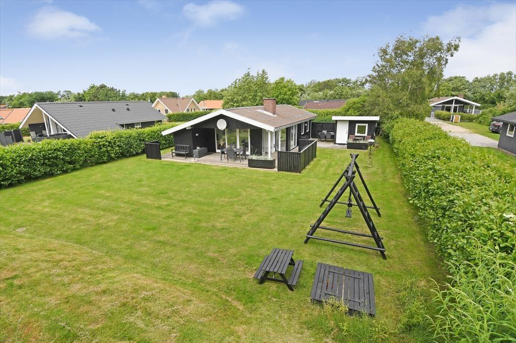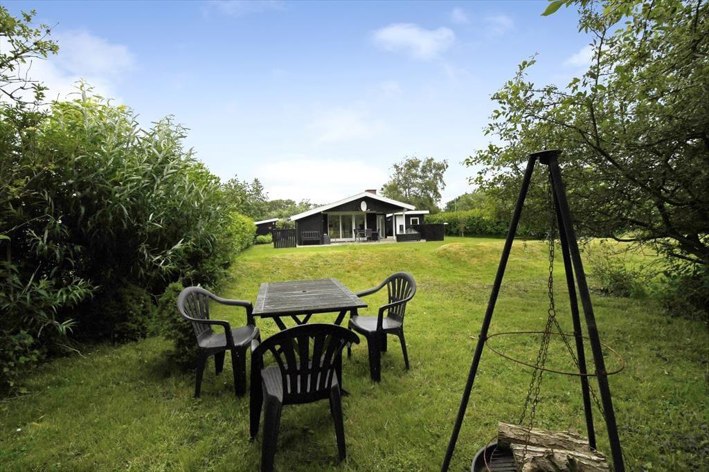 Selvom huset er skønt at være i, vil du formentlig tilbringe mest muligt af ferien ude i det fri, når solen skinner, og temperaturerne er sommerlige. Sommerhusets grund omkranses af tæt randbeplantning ind mod naboerne, så baghaven er en grøn og ugeneret oase med plads til havespil på græsplænen, aftenhygge ved bålstedet og friskgrillede måltider på terrassen. Faktisk er der flere terrasseområder at vælge imellem, så du kan vælge en siddeplads alt efter solens placering på himlen, og der står også et bord-bænke-sæt, hvis du gerne vil sidde med kaffen i nærheden af børnene, mens de gynger eller bager sandkager i sandkassen.