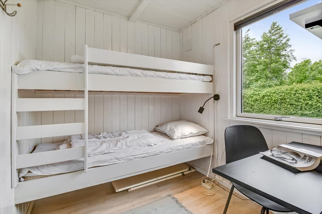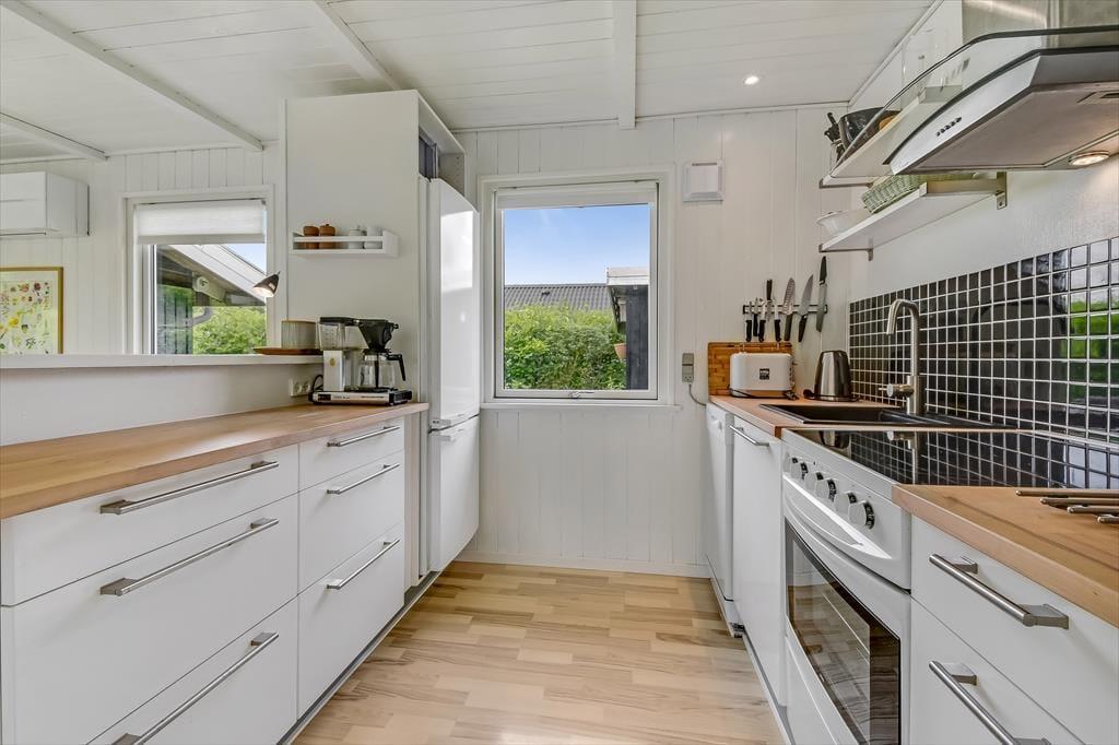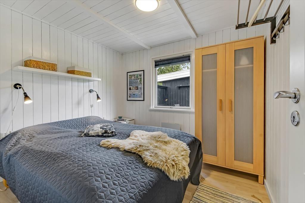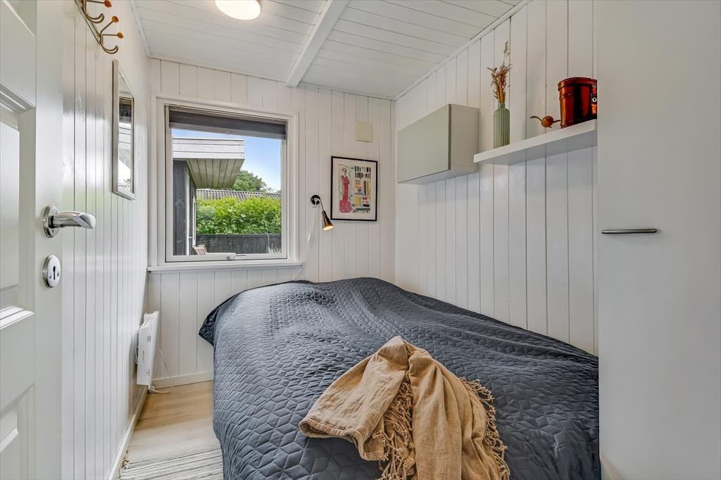 Med mørk træfacade og hvide vinduesrammer har sommerhuset et klassisk ydre, og inden døre sørger de hvide vægge og det pæne møblement for at give alle rum et lyst og indbydende indtryk. Planløsningen gør det muligt at samles op til fire voksne og to børn i huset, for ved entréen ligger der tre soveværelser, hvoraf det ene er med køjeseng. Brusebadeværelset finder du i samme afdeling, mens køkken og stue ligger samlet, så det fungerer som et skønt opholdsrum med plads til alskens hyggestunder – lige fra fælles madlavning, kagebagning og langstrakte frokoster til brætspil, filmaftener og dybe snakke nær brændeovnen. Huset har desuden også et anneks, hvor der er plads til kreativ leg eller afslapning, hvis man har brug for det.