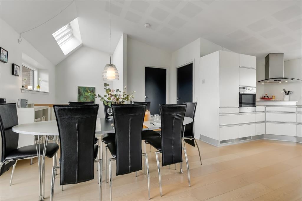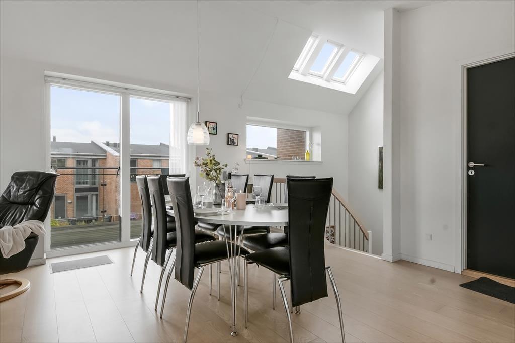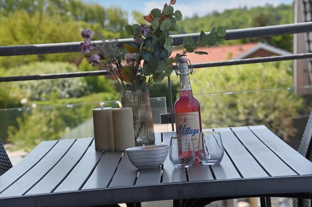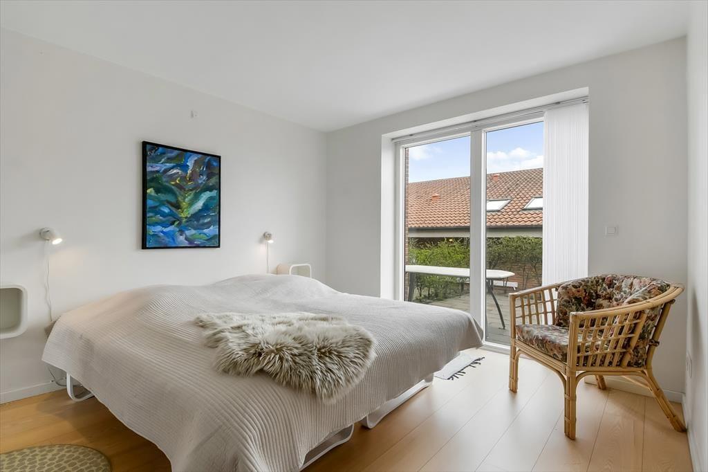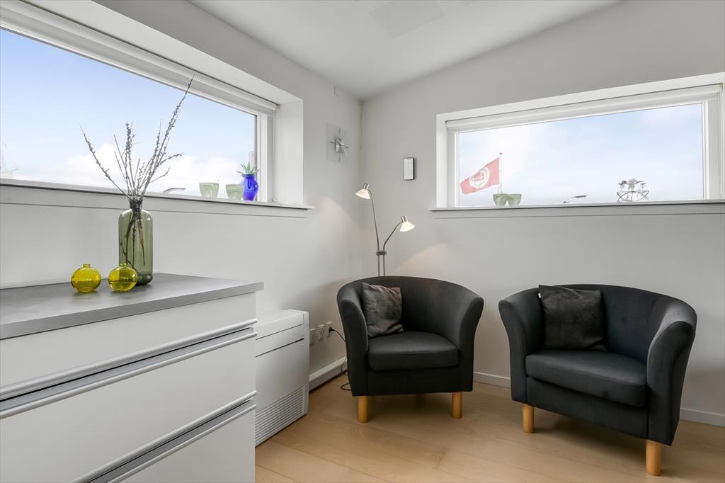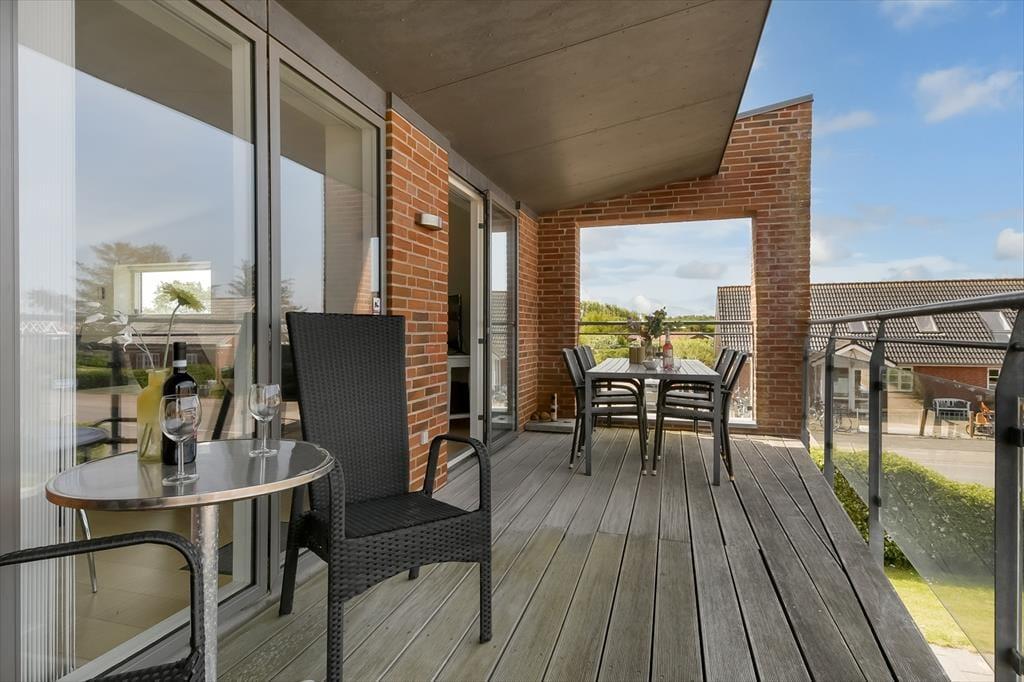 Fra førstesalens stue kan I træde direkte ud på en stor, overdækket altan, som er et skønt sted at nyde solskinnet og udsigten mod byens havn. På begge sider af ejendommen er der desuden terrasser i stueplan, og så er der selvfølgelig parkeringsplads til bilen.