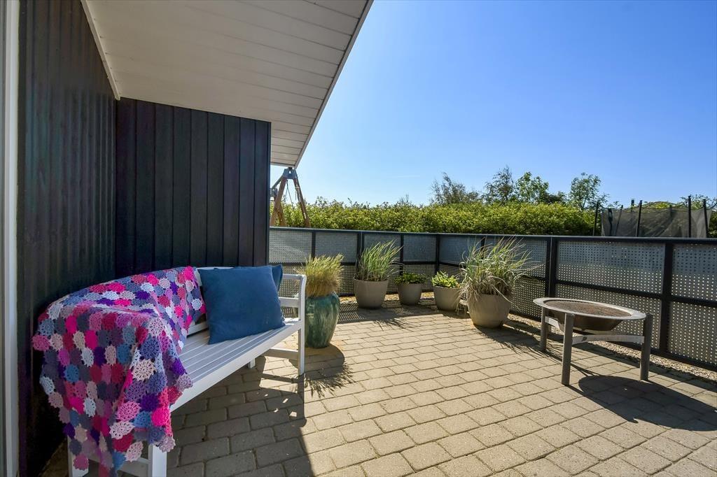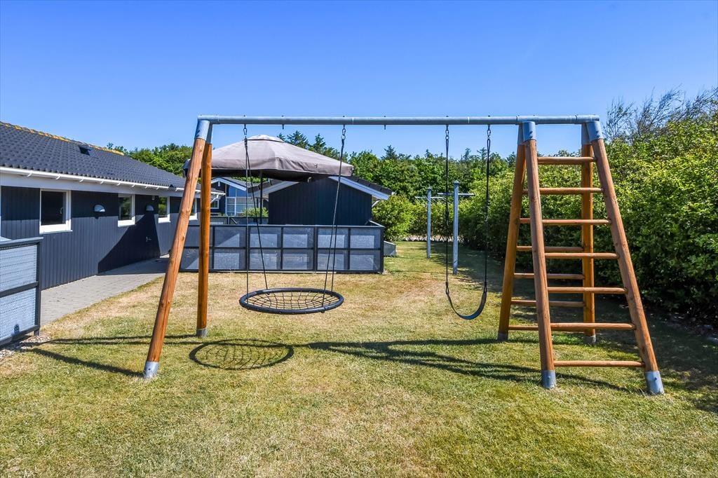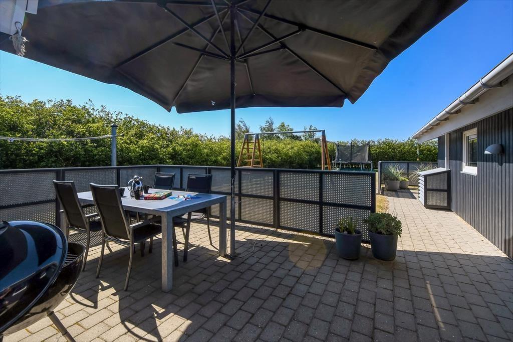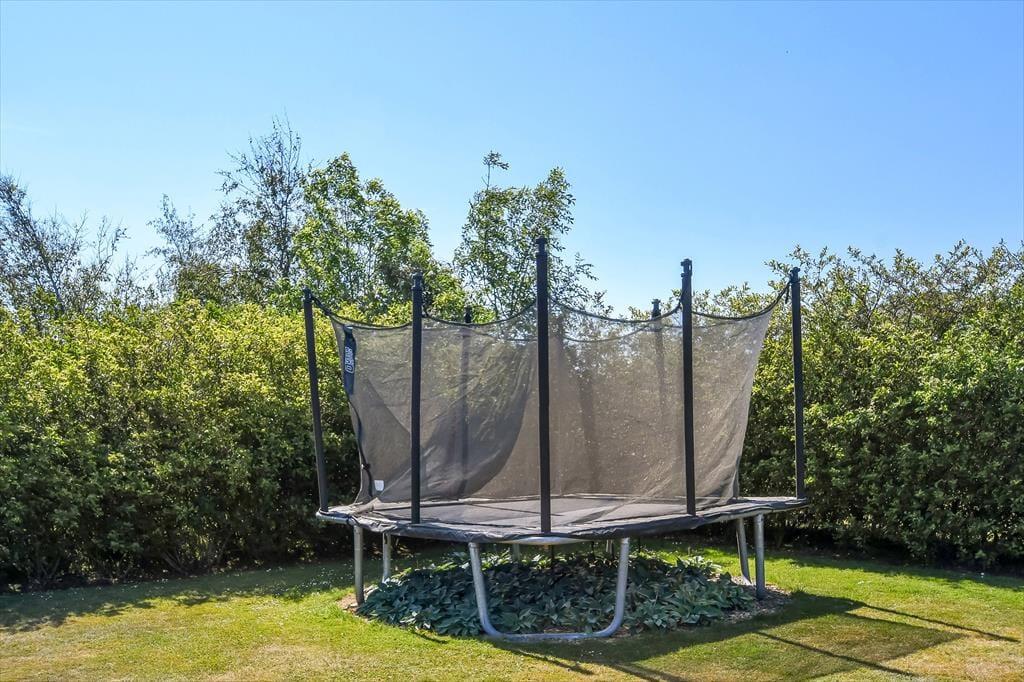 Skinner solen, er det oplagt at rykke ferielivet ud i det grønne. Terrassen, der breder sig både syd og øst for huset skærmes af hegn til flere sider, så her er der rig mulighed for at sidde i læ. Der er dog samtidig nem adgang til grundens store græsplæne, hvor børnene kan spille bold – hvis ikke de gynger og klatrer i legestativet eller hopper i trampolin.