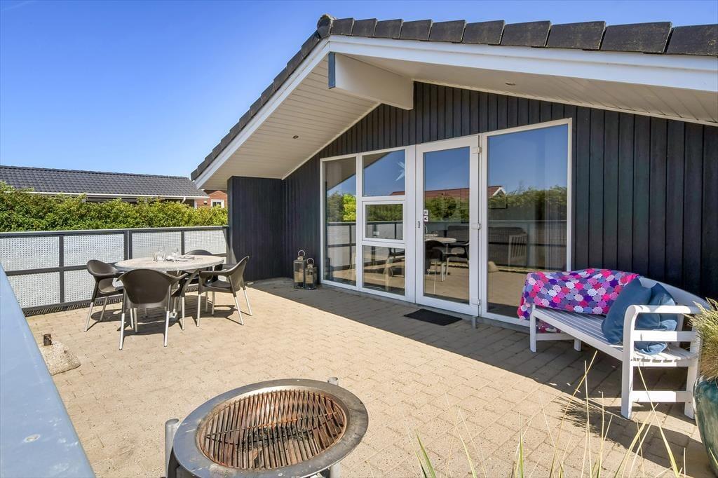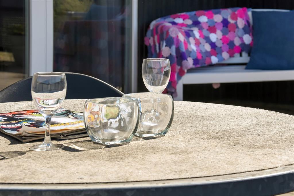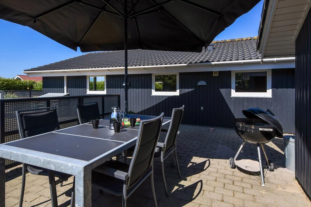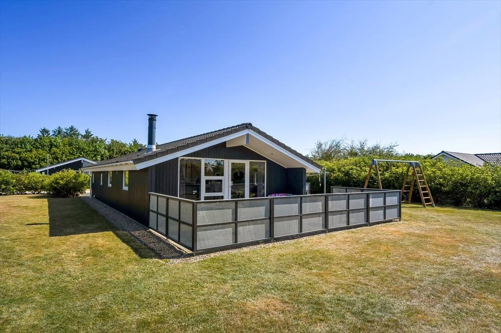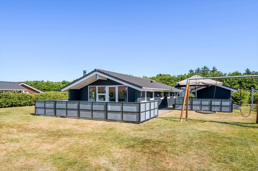 Skinner solen, er det oplagt at rykke ferielivet ud i det grønne. Terrassen, der breder sig både syd og øst for huset skærmes af hegn til flere sider, så her er der rig mulighed for at sidde i læ. Der er dog samtidig nem adgang til grundens store græsplæne, hvor børnene kan spille bold – hvis ikke de gynger og klatrer i legestativet eller hopper i trampolin.