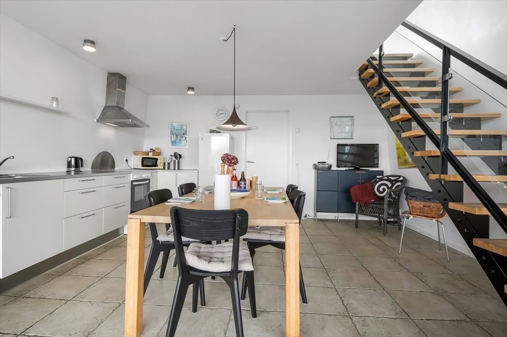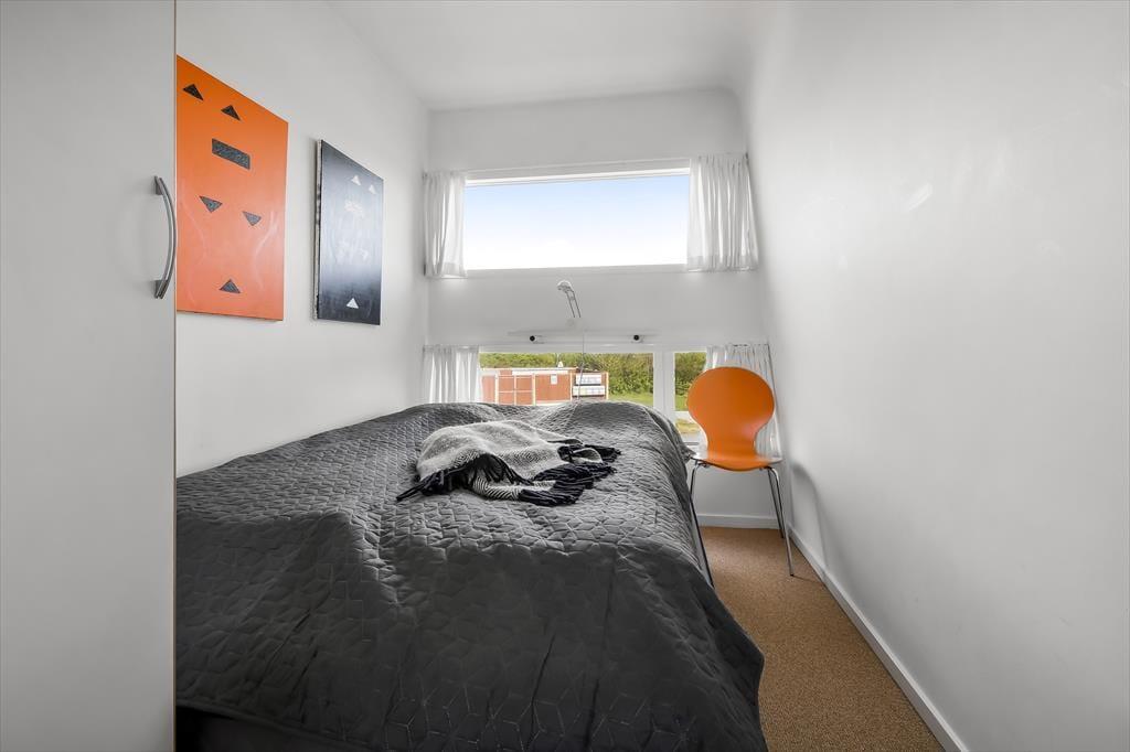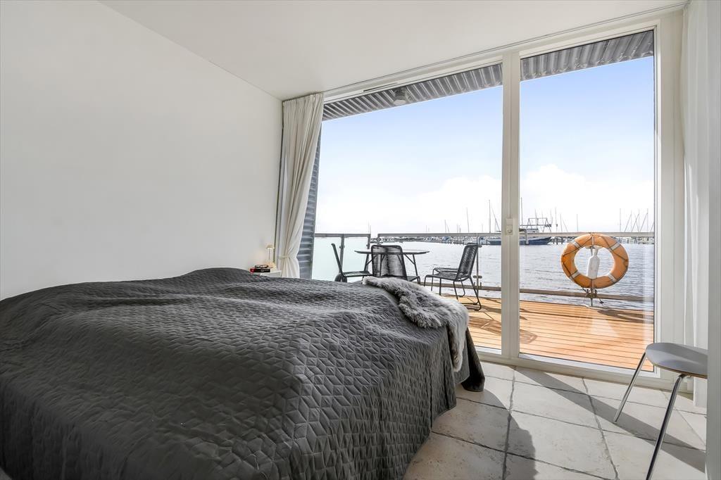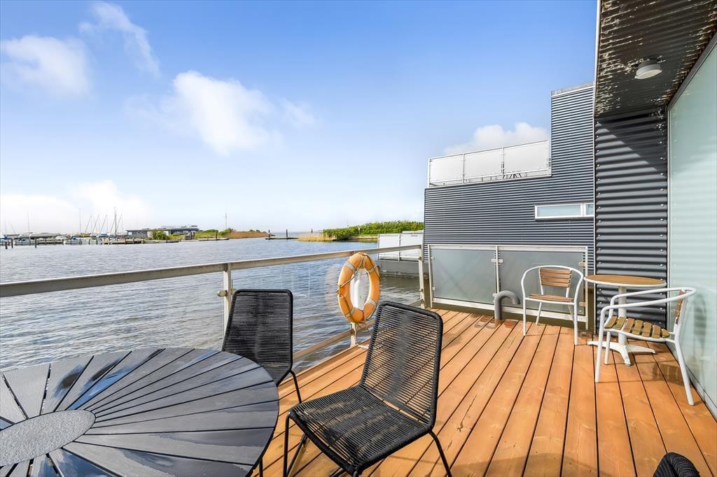 På ”Jojka”får I den unikke oplevelse af at være tæt på vandet døgnet rundt – uanset om I opholder jer indenfor eller sidder på soldækkene. Og selvom det er en husbåd, kan I se frem til det samme komfortniveau som i et moderne sommerhus, for rummene er lyse, luftige og smagfuldt indrettet af en indretningsarkitekt. Inden døre får I 105 m² at brede jer på fordelt på to etager: I stueplan ligger et soveværelse, et rummeligt spisekøkken og hele to badeværelser, hvoraf det ene er udstyret med spabad og det andet med sauna. Går I op på førstesalen, kommer I til en dejlig stue med brændeovn, bløde siddemøbler og store vinduespartier, så afslapningsstunderne foregår med fjorden som smukt bagtæppe. Yderligere to soveværelser ligger også her på etagen, og derfor er der i alt plads til seks feriegæster.