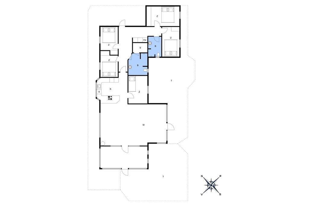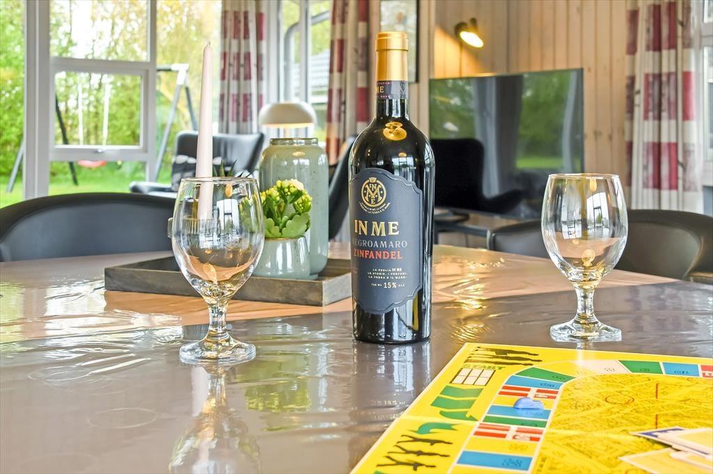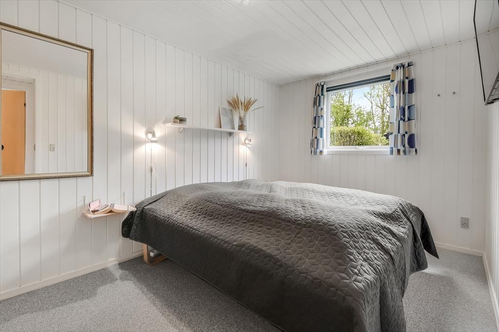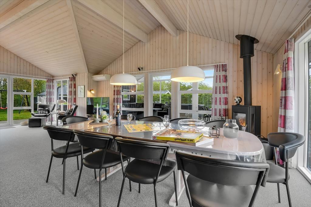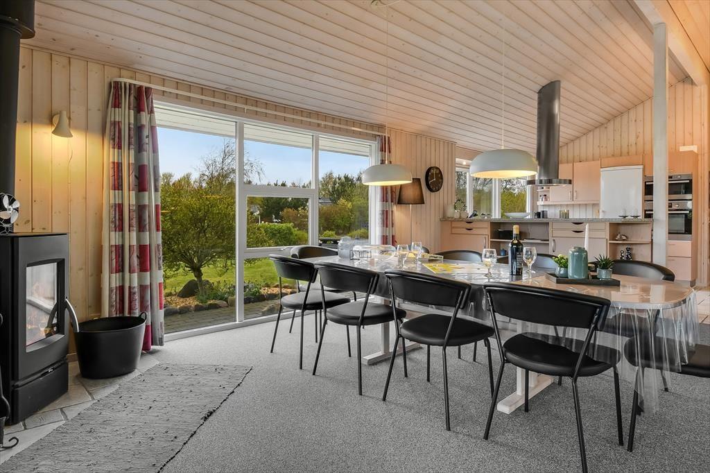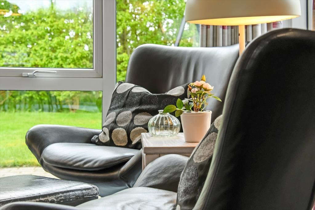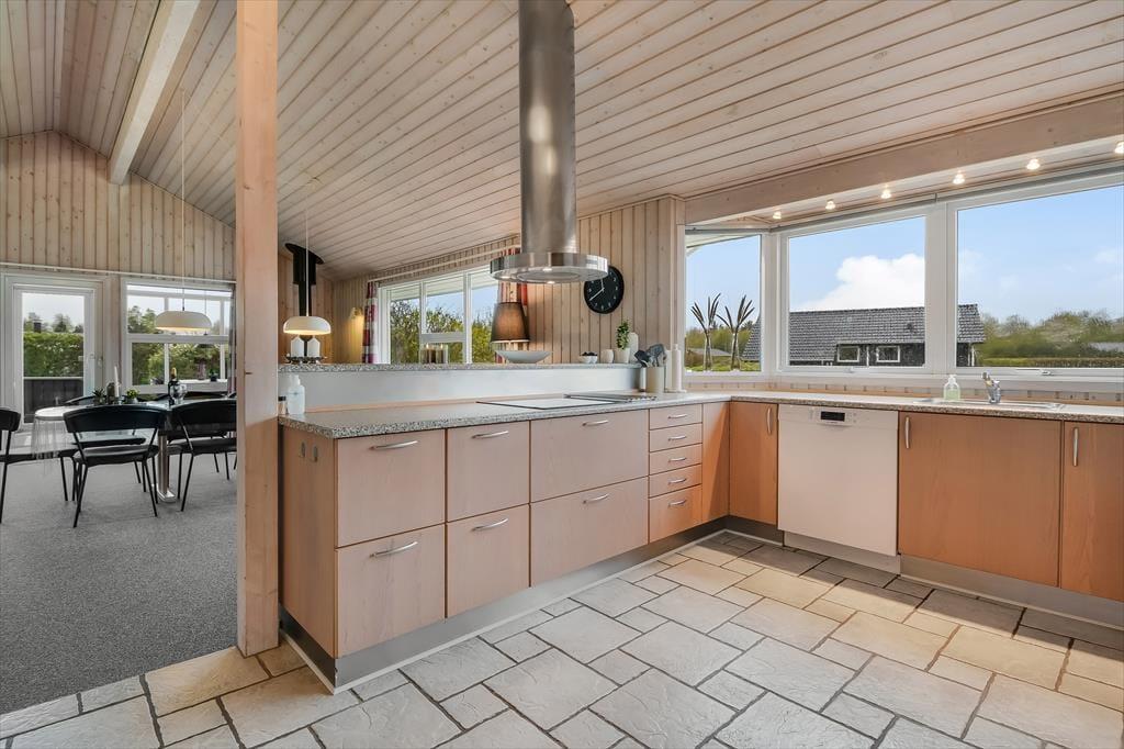 Med 174 m2 under tag får I masser af plads at brede jer på, og indretningen sætter de bedste rammer om ferieturens hyggelige samvær. Husets naturlige hjerte er det store køkken-alrum, der ligger i åben forbindelse med opholdsstuen. Her strømmer lyset ind fra flere verdenshjørner, og der er et dejligt kig til alt det grønne udenfor. I den tilstødende udestue er lysindfaldet endnu mere generøst, og her kan I nyde haven fra allernærmeste hold. Fra både stue og udestue er der direkte udgang til den store terrasse. Huset indeholder fire rummelige soveværelser, og hertil kommer to badeværelser, hvoraf det ene er udstyret med sauna. Der er brændeovn i alrummet, og som en ekstra luksus kan I se frem til gulvvarme i alle klinkegulve.