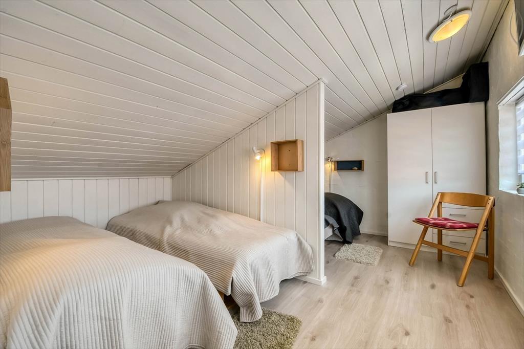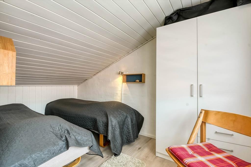 Lejligheden, der måler 52 m2 fordelt på to plan, er delvist renoveret i 2021 og har plads til seks feriegæster. I stueplan ligger køkken og stue samlet, så her kommer madlavning, måltider, sofaafslapning og andre fælles hyggestunder alt sammen til at foregå. Et soveværelse med dobbeltseng og et badeværelse med bruser ligger også her på etagen, og tager I trappen op til førstesalen, finder I et ekstra soveværelse, der byder på fire enkeltsenge fordelt i to nicher. Skulle I få brug for at friske feriegarderoben op, er der møntvaskeri i feriecentret.