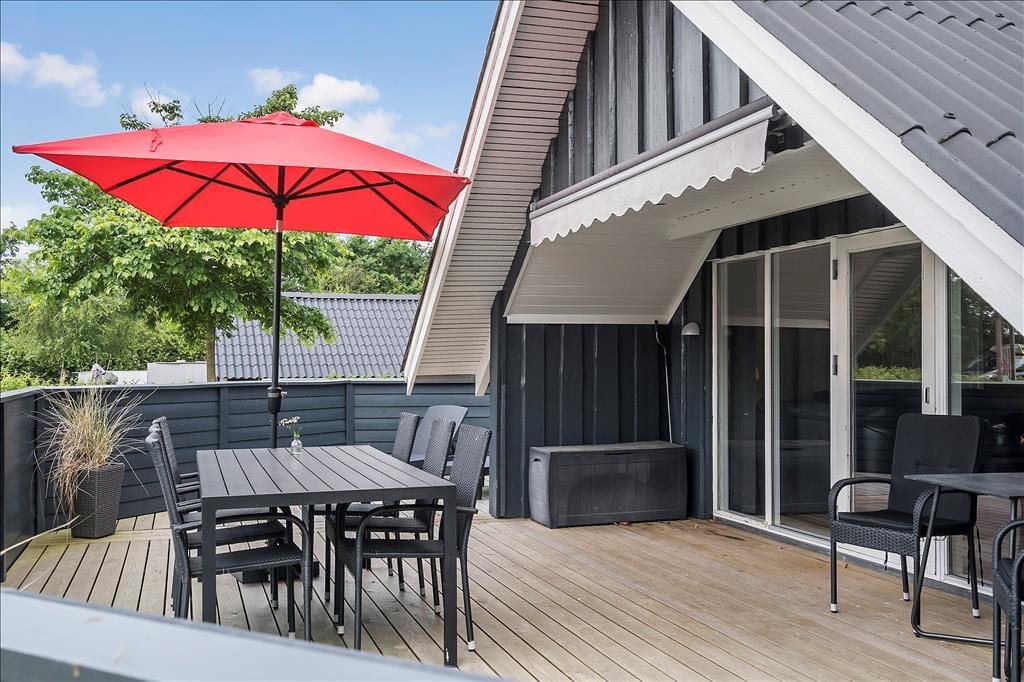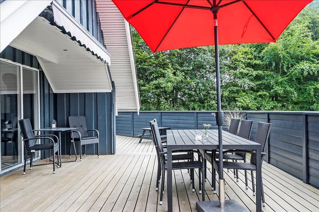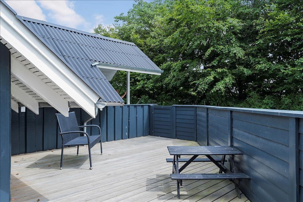 En skøn og afskærmet træterrasse ligger lige ved stuen, så det er nemt at smutte ud i det gode vejr. Som supplement ligger der et flisebelagt terrasseområde nær huset, og derfor har I flere valgmuligheder, når I vil finde den helt rette opholdsplads i solen. Der er både liggestole, havemøbler og grill til rådighed, og til de yngste børn er der legestativ og sandkasse på grundens grønne græsplæne. Hele haven er for øvrigt indhegnet, hvilket er rart for både børnefamilier og hundeejere.