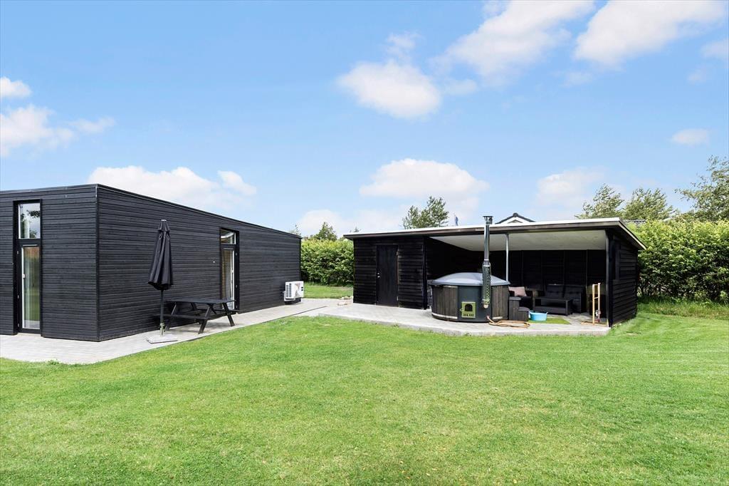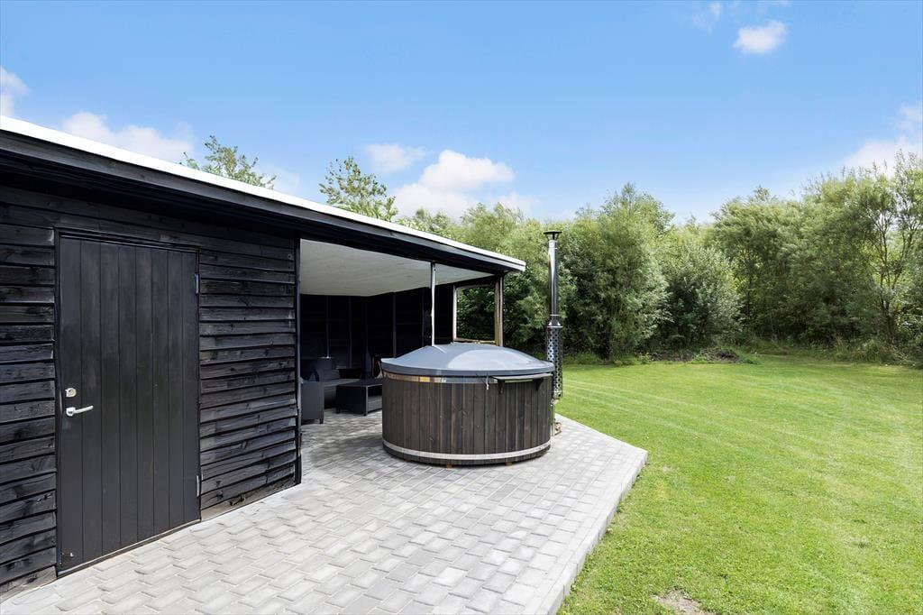 Grunden, som måler 1.200 m2, er afskærmet af randbeplantning og derfor ugeneret, og med græsplæne og grusbelagt indkørsel er der både plads til havespil og til flere biler. En delvist overdækket terrasse ligger lige ved huset, og nær vildmarksbadet er der indrettet et loungeområde under udhusets halvtag. Netop vildmarksbadet er med til at forlænge udesæsonen gevaldigt, både om aftenen, når I kan sidde under stjernehimlen, og i de køligere sæsoner, hvor et varmt bad med lys og bobler kan gøre underværker.