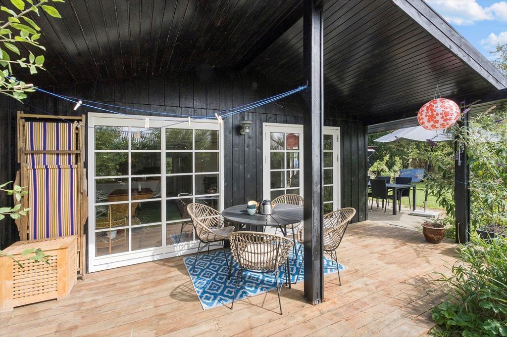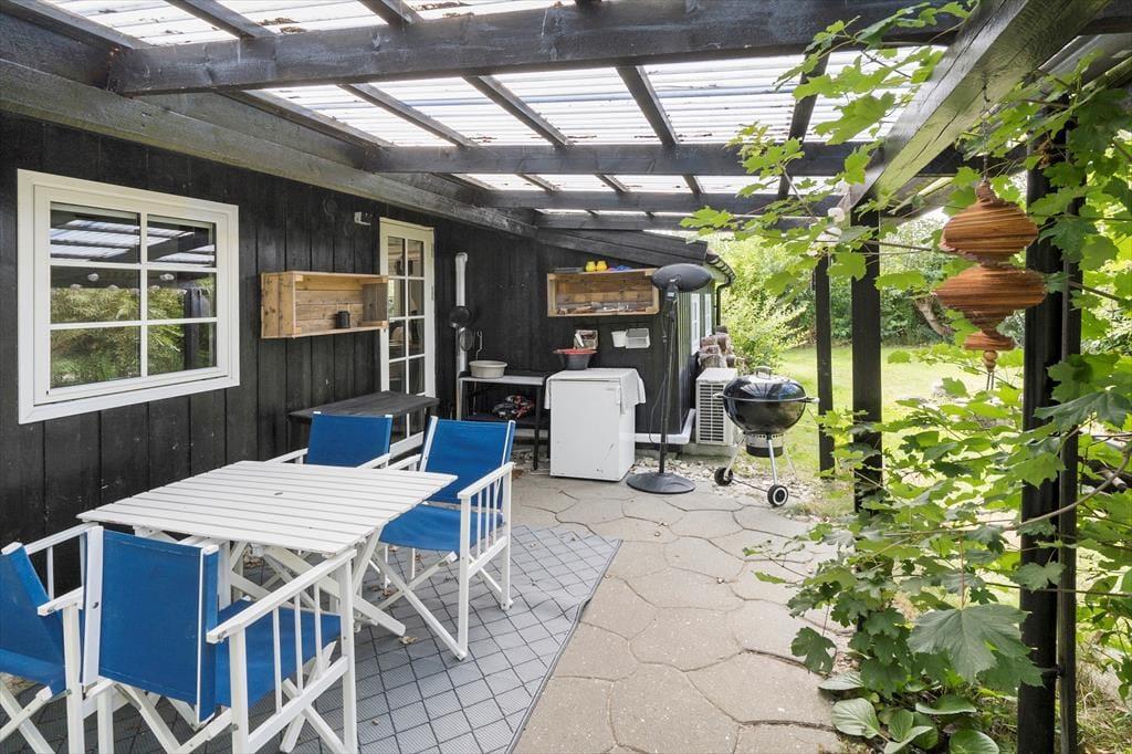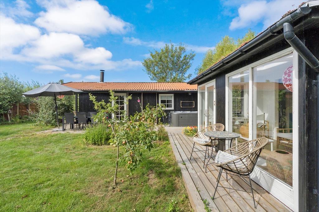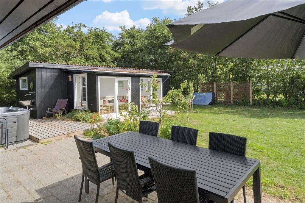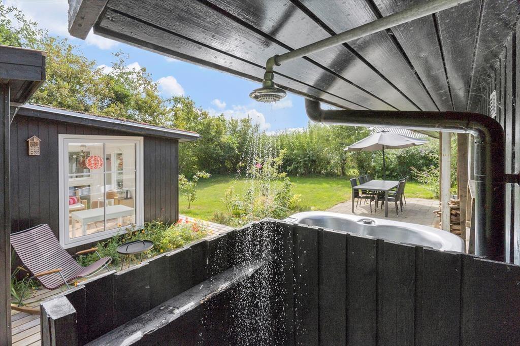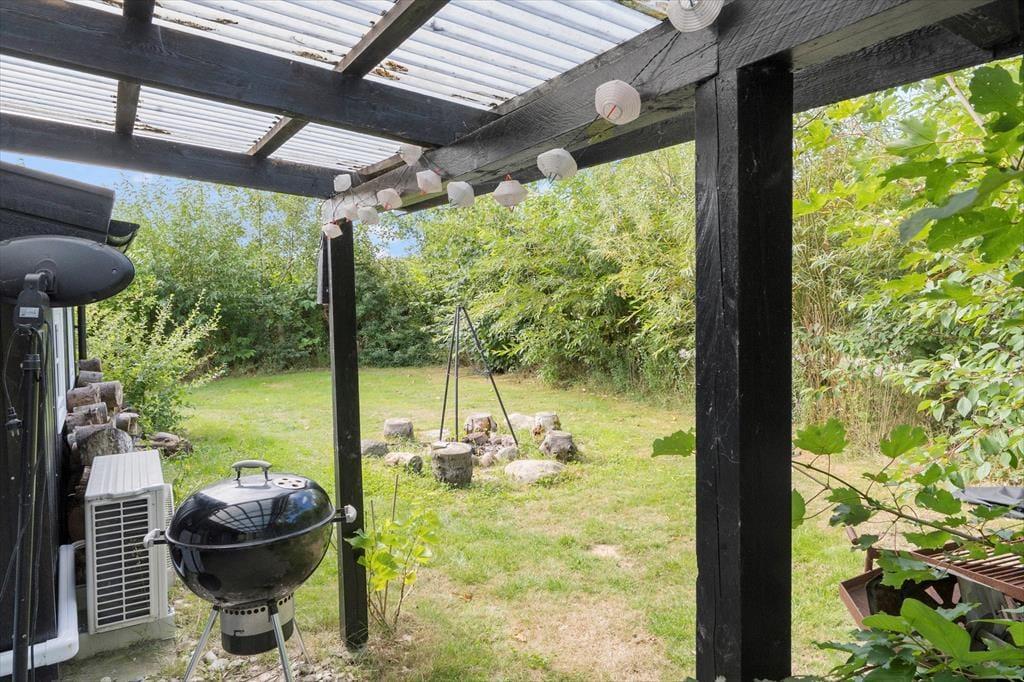 Huset ligger på en fredelig grund med græsplæne og gode terrasser i forbindelse med både hovedhus og anneks. Her finder I blandt andet en stor udespa med plads til fem personer, som opvarmes på få timer - I skal bare tænde på relæet. Desuden er der også udebrus, når I skal køles ned på de varme sommerdage. Der er masser af plads til at hygge og dase, og I finder let et hjørne med sol eller skygge efter behov. Terrassen er udstyret med både havemøbler, et lille udekøkken og grill, så I kan også dække op til hyggelige middage under åben himmel, når dagen går på hæld. Haven er indhegnet, så børnene og hunden kan løbe frit omkring på grunden.