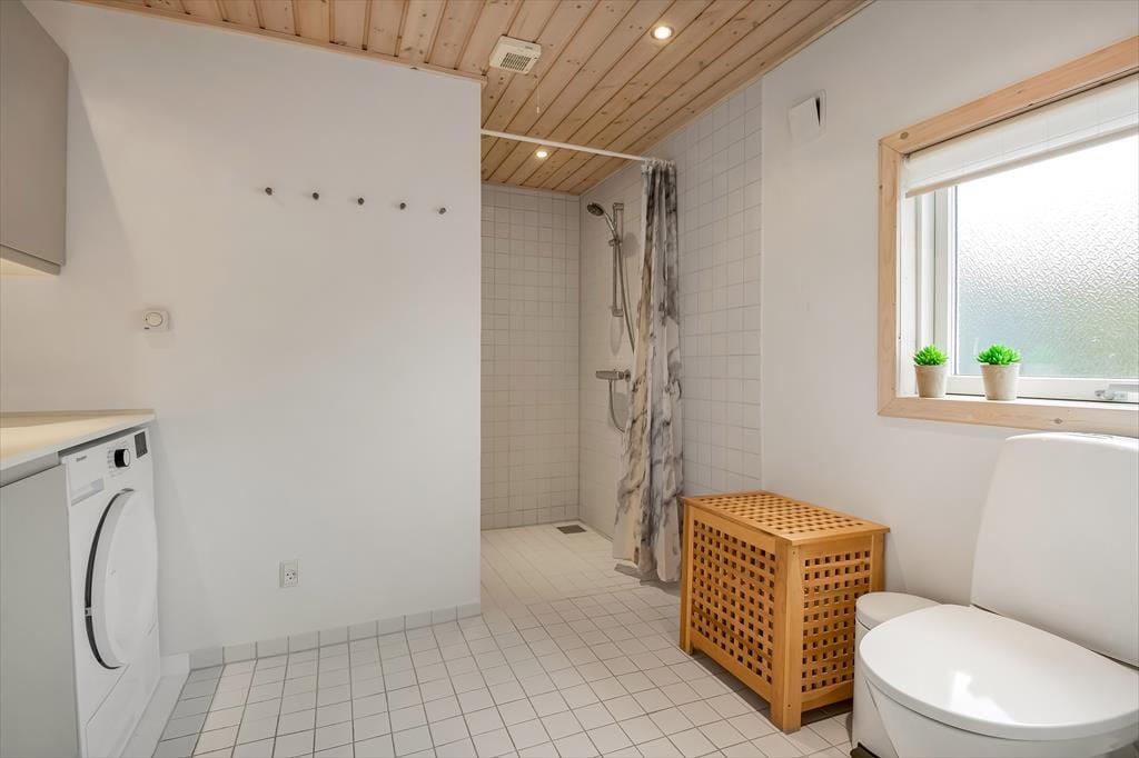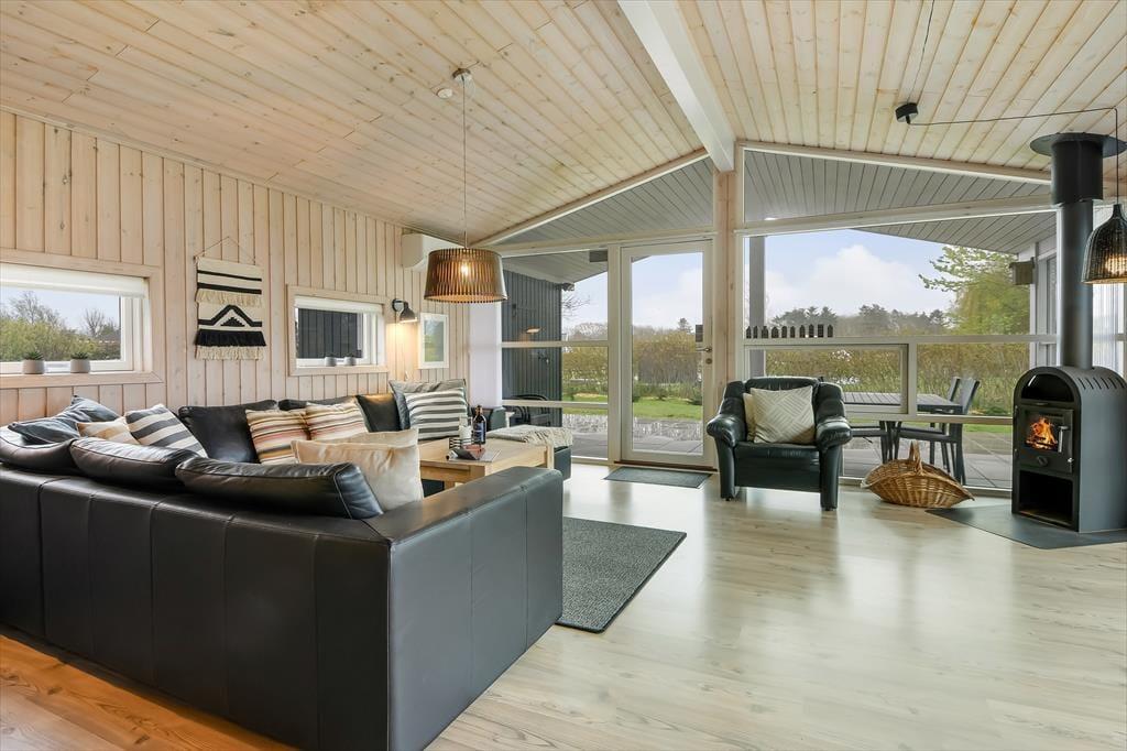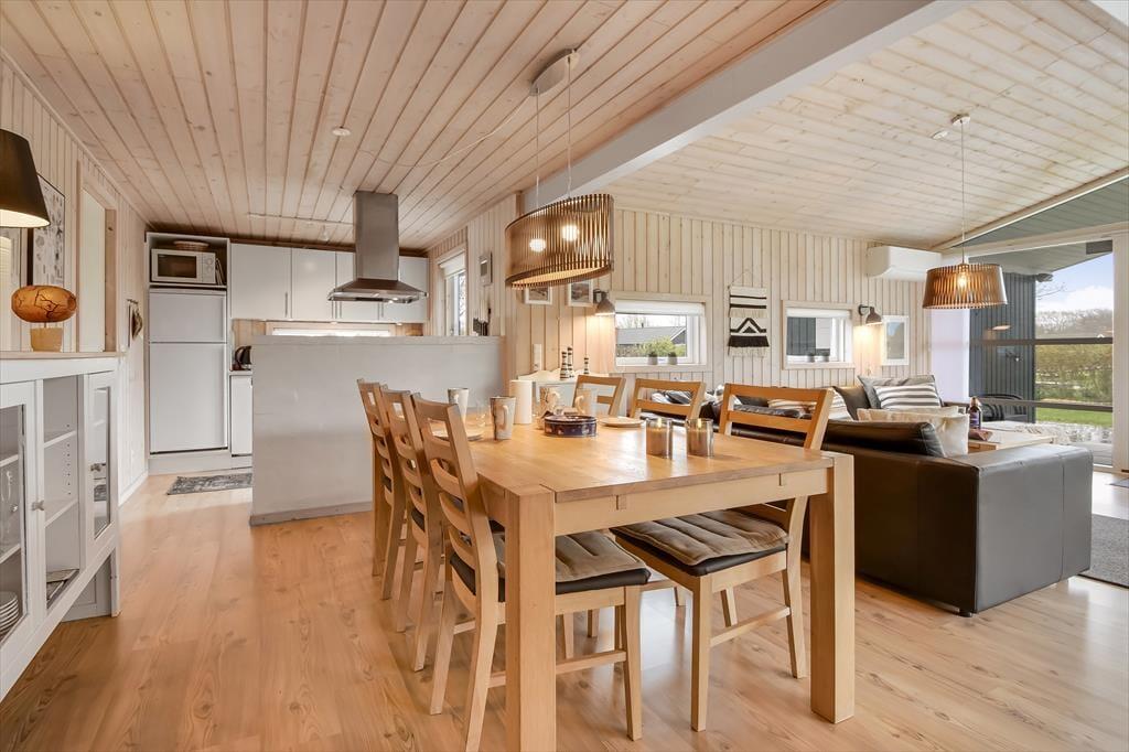 Sommerhuset er et 86 m² stort eksemplar fra 2006, der fremstår pænt og velholdt. Planløsningen passer godt til seks personer, for der er to soveværelser med dobbeltseng og et tredje med køjeseng, så det er oplagt som børneværelse. Både store og små familiemedlemmer kan samles i stuen, der er et dejligt opholdsrum med loft til kip, et godt lysindfald og direkte udgang til terrassemiljøet. Derudover er der brændeovn, sofakrog og stort fladskærms-tv, så der er lagt op til mange gode og afslappende hyggestunder. Rummets spiseafsnit ligger lige ved køkkenet, som er udstyret med opvaskemaskine og andre gode hvidevarer. Brusebadeværelset fremstår pænt og rummeligt ligesom de øvrige rum, og så skal det for øvrigt nævnes, at huset er kørestolsvenligt med brede døre uden bundstykke.