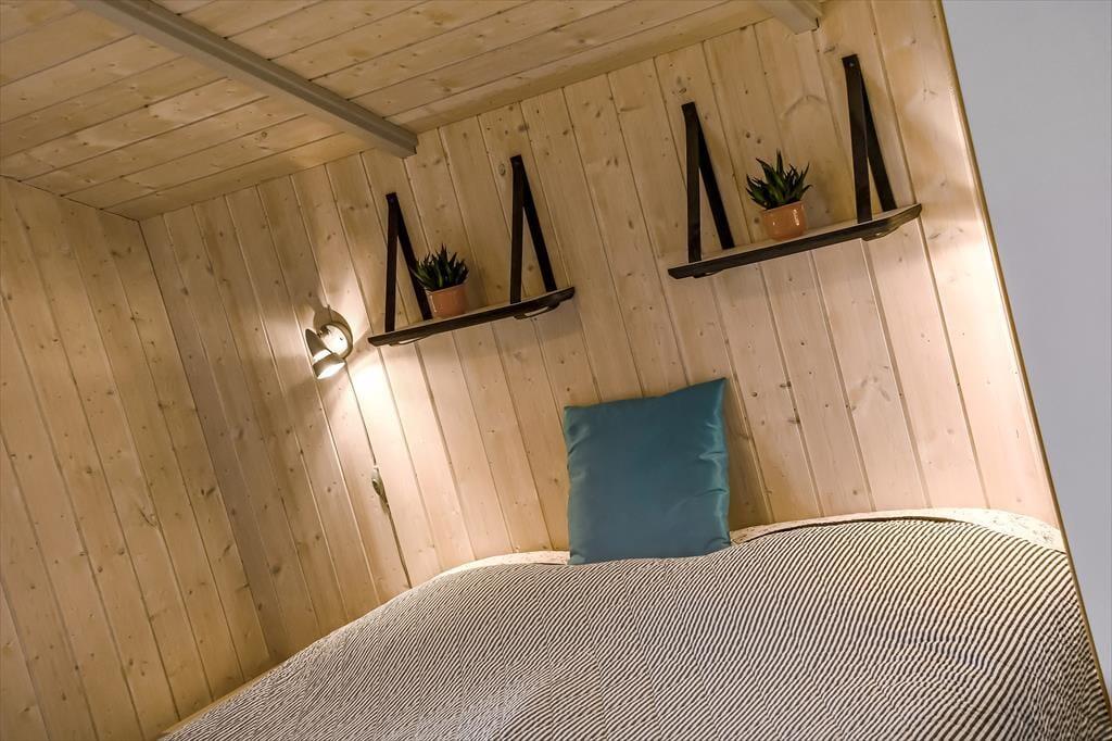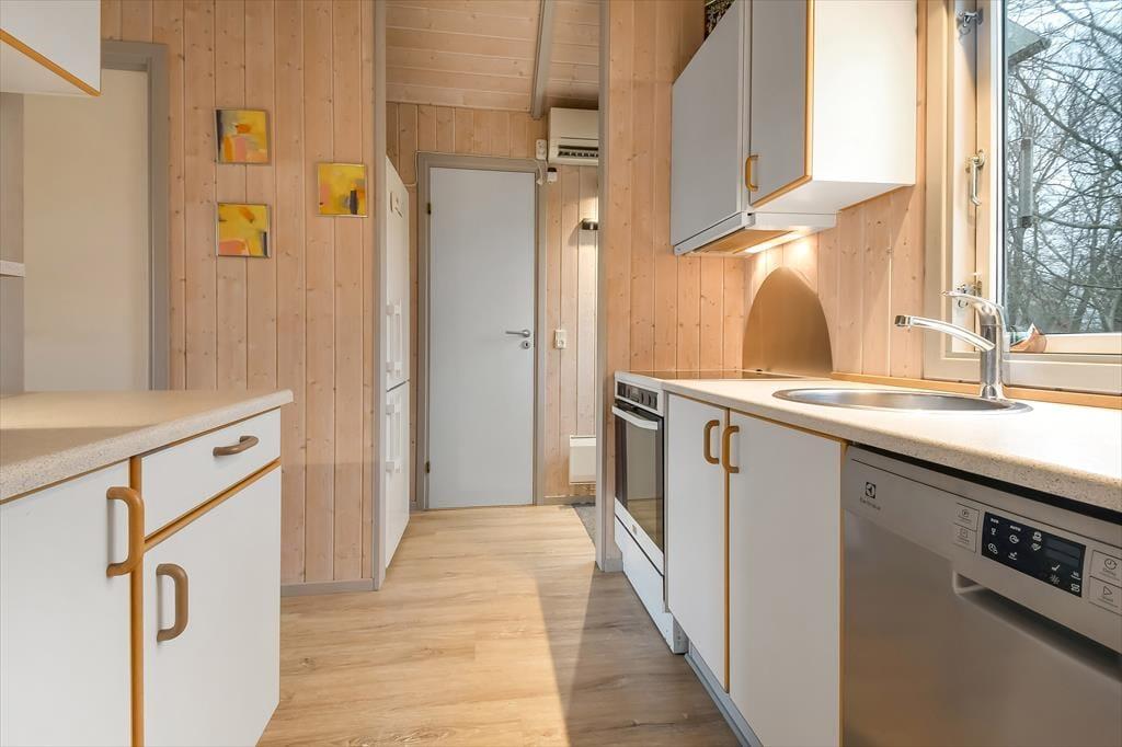 I den hyggelige hytteby er sommerhusene generelt ikke specielt store, men til gengæld helt fulde af charme, og sådan er det netop også her på adressen, hvor du får 45 velindrettede kvadratmter at gøre godt med inden døre. Pladsen er dog godt udnyttet, så du har alt, hvad du skal bruge – også hvis du holder ferie med din familie eller venner. Alle rum, inklusiv de to soveværelser og brusebadeværelset, fremstår pæne og indbydende, men det bedste er nu stuen, hvor du kan se frem til at slappe af nær brændeovnen i enten sofaarrangementet eller ved spisebordet. Køkkenet er integreret i rummet, og derfor kan du nemt holde gang i hyggesnakken, selvom du vil brygge mere kaffe eller gå i gang med at forberede aftensmaden.