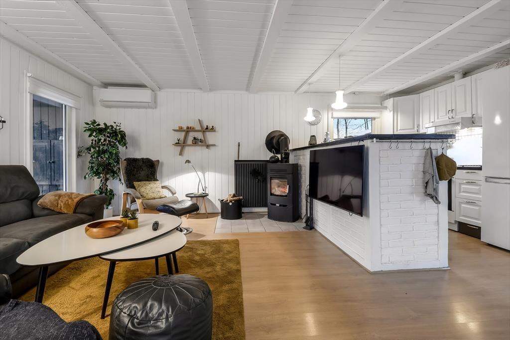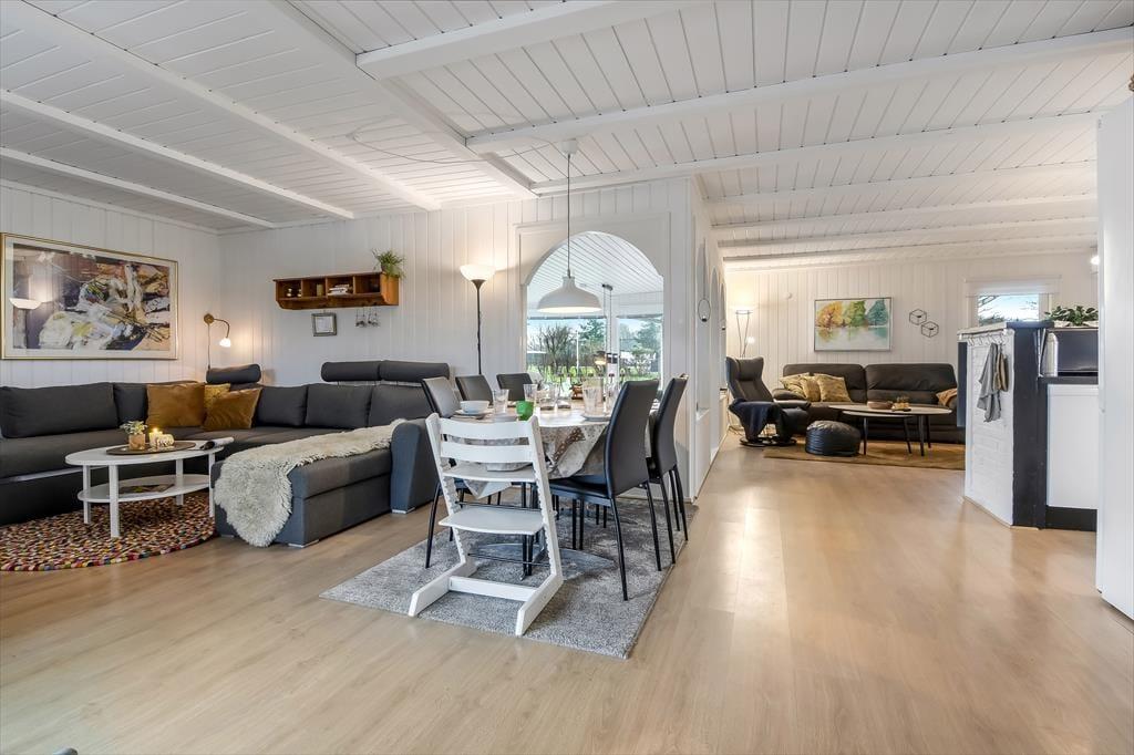 Efter seneste renovering, der foregik i 2023, fremstår sommerhuset særdeles pænt og indbydende. Opholdsafdelingen er stor, og den er opdelt i flere hyggelige afsnit, så der er masser af sofaplads og bløde lænestole – og det er rart, hvis huset af fuldt af liv. I alt kan I være syv personer fordelt på tre soveværelser og et anneks. Bemærk, at det ene soveværelse er et gennemgangsrum, så hvis du har et barn, der gerne vil sove tæt på de voksne, er det med andre ord en praktisk planløsning. Fra badeværelset har du adgang til husets ’wellnessrum’, som er en tilbygning med spabad og sauna, der inviterer til at flade ud og mærke feriefreden brede sig helt ud i kroppen.