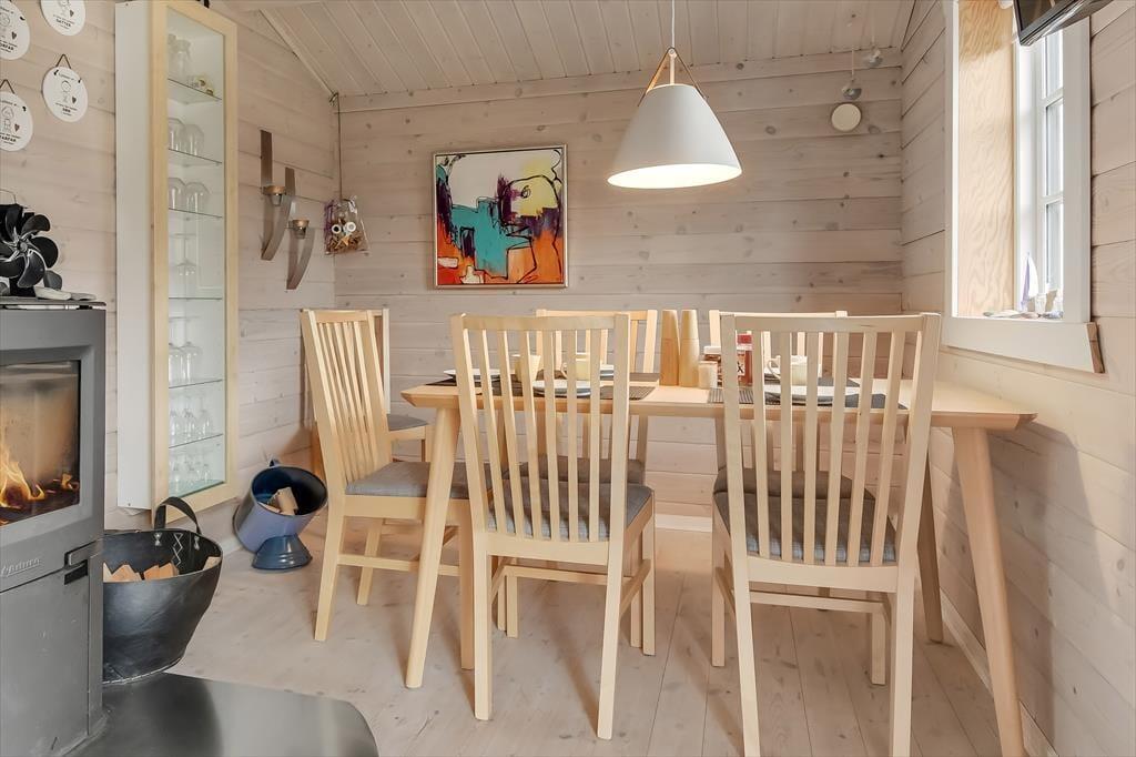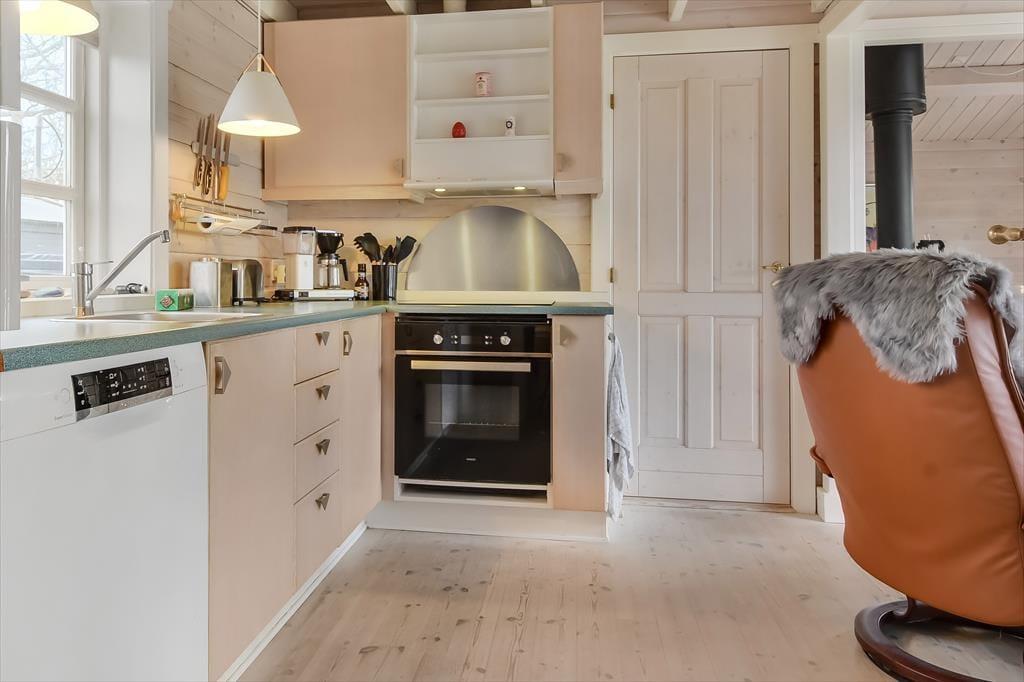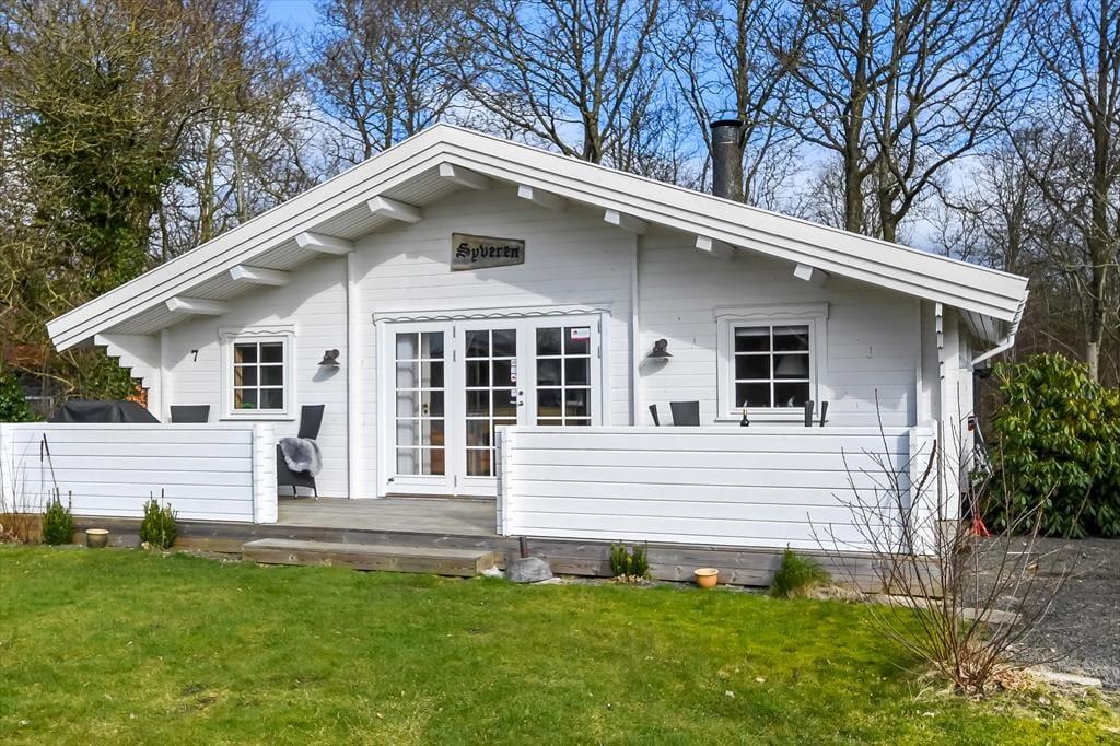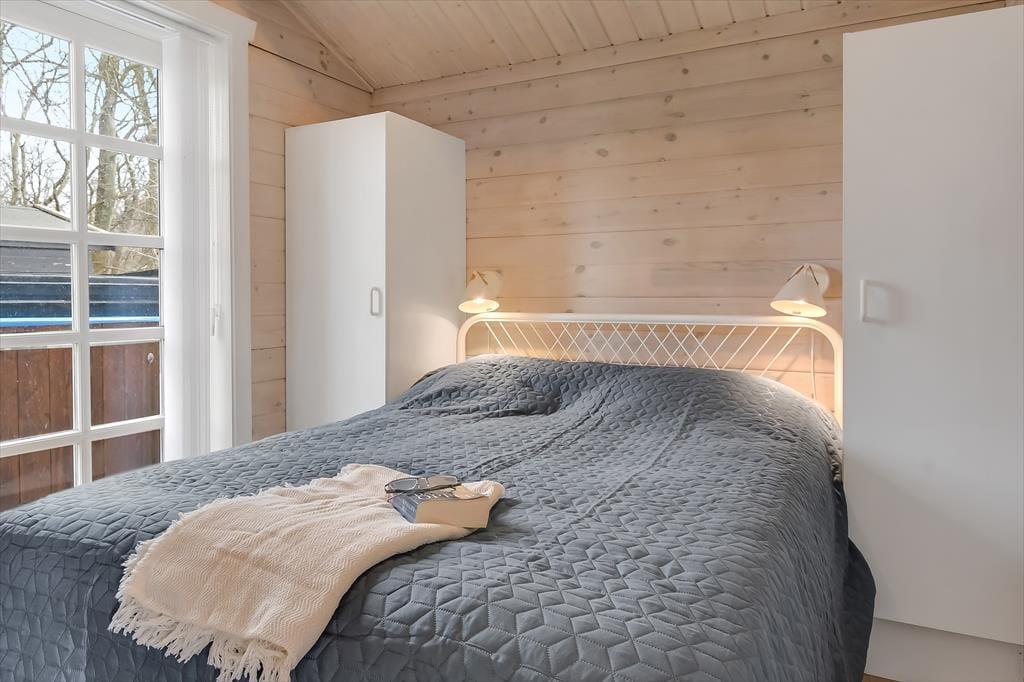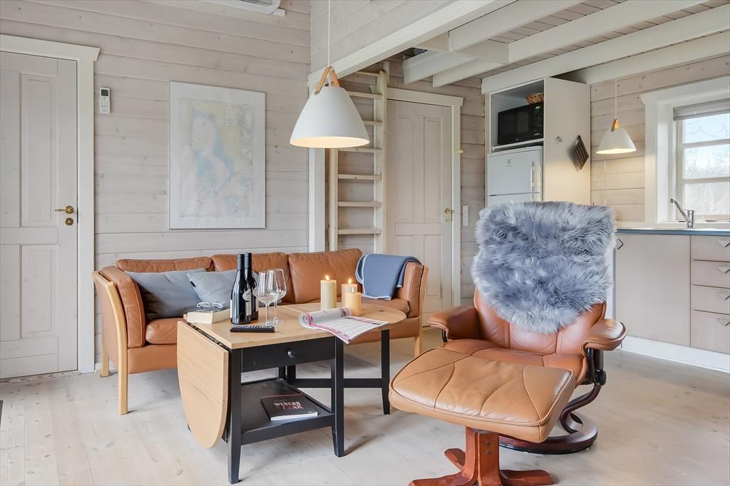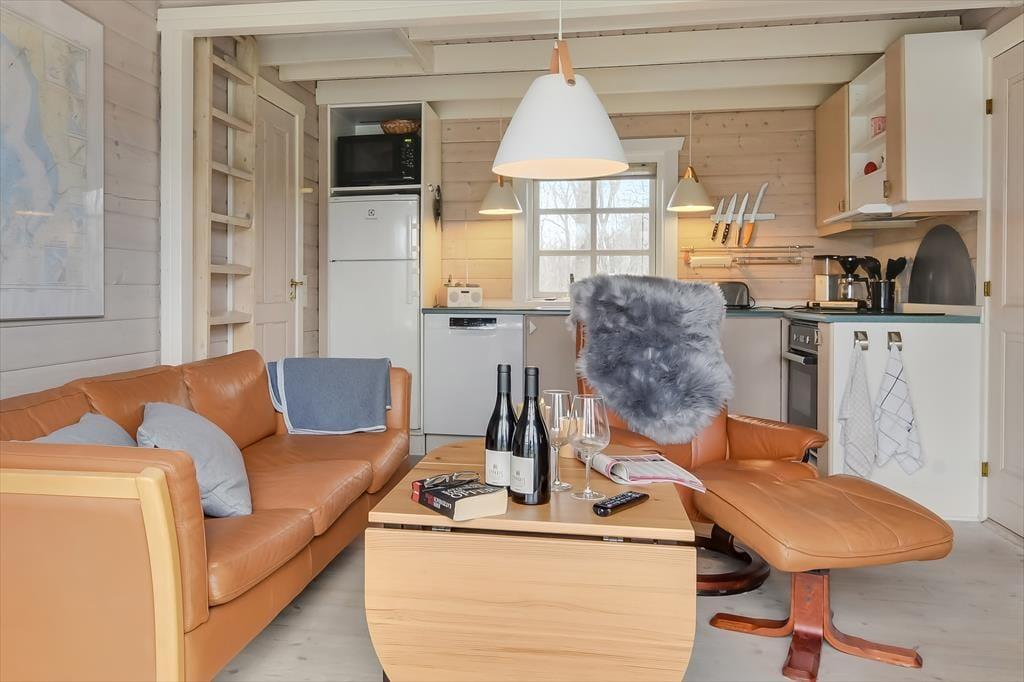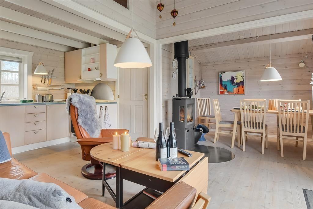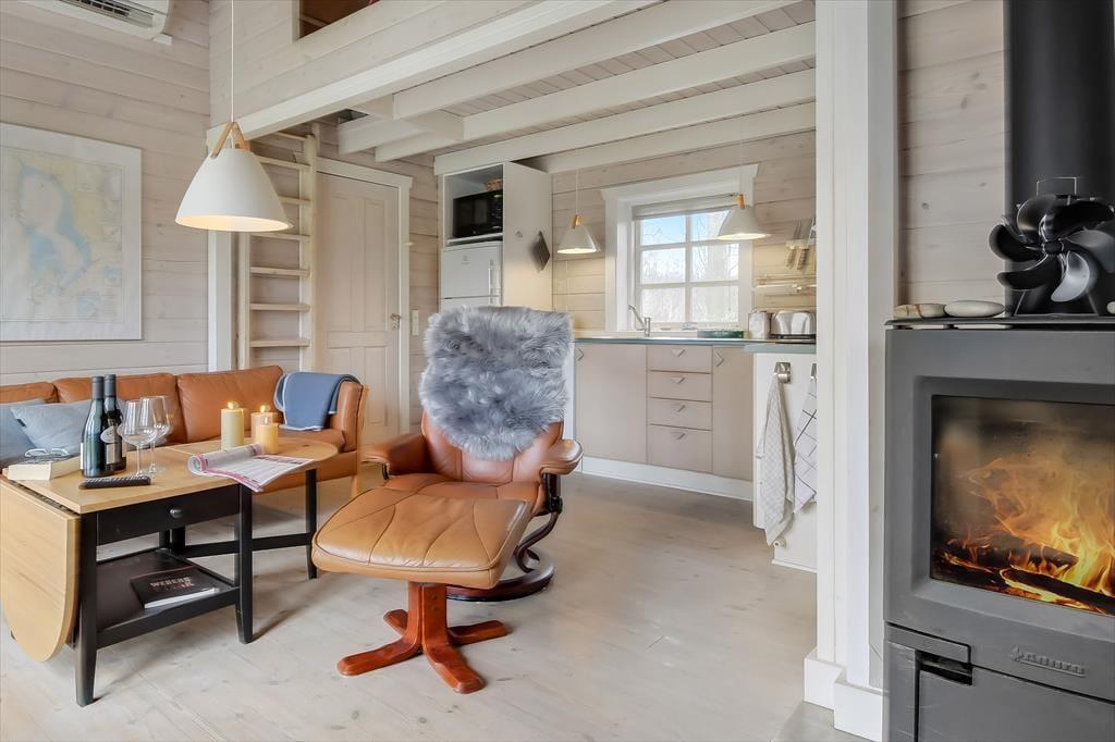 Allerede udefra er førstehåndsindtrykket godt, for huset har en køn, hvidmalet træfacade og småsprossede døre, der inviterer dig direkte ind i stuen. Her er brændeovnen kun et af de elementer, der er med til at skrue op for hyggestemningen – for rummet er smagfuldt indrettet og har derudover lyse trævægge, loft til kip og stige op til en hems. Et velfungerende køkken er også integreret i rummet, så du kan nemt holde hyggesnakken i gang, selvom det er din tur til at stå for madlavningen. Selv soveværelserne er hyggelige, og på badeværelset står spabadet, der garanterer for, at du kan få slappet af inden døre.