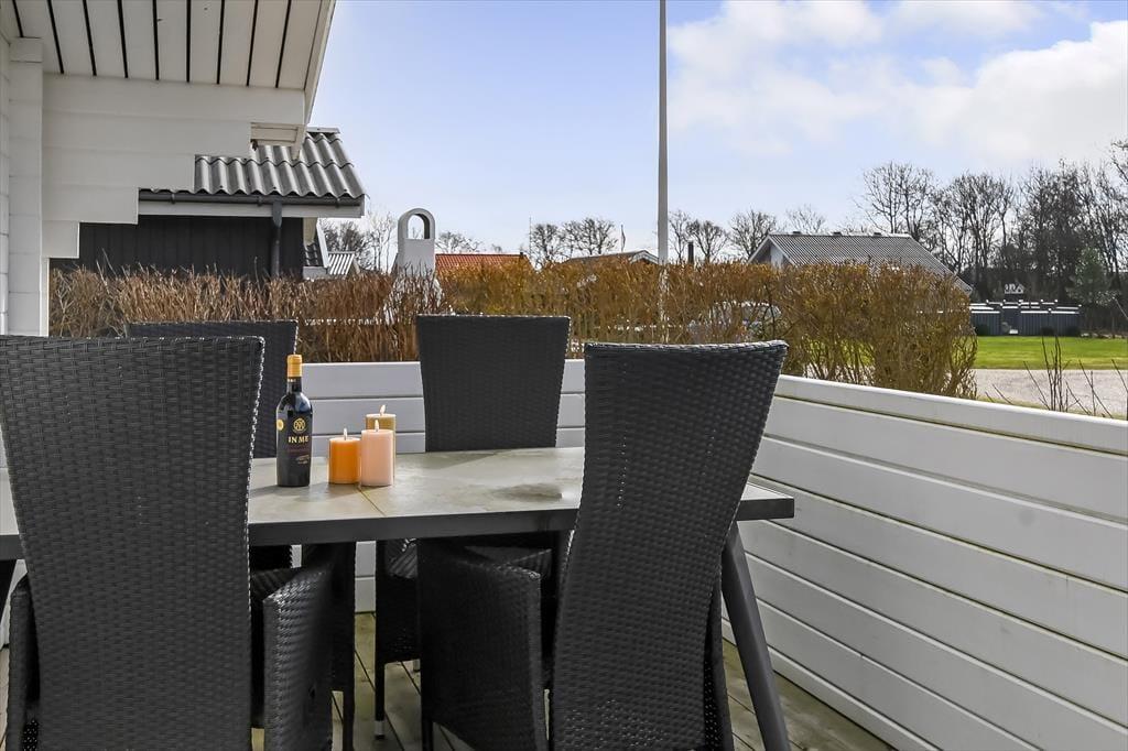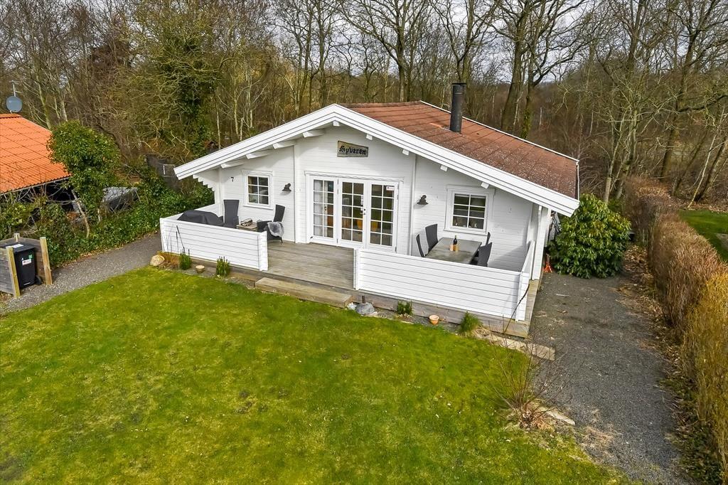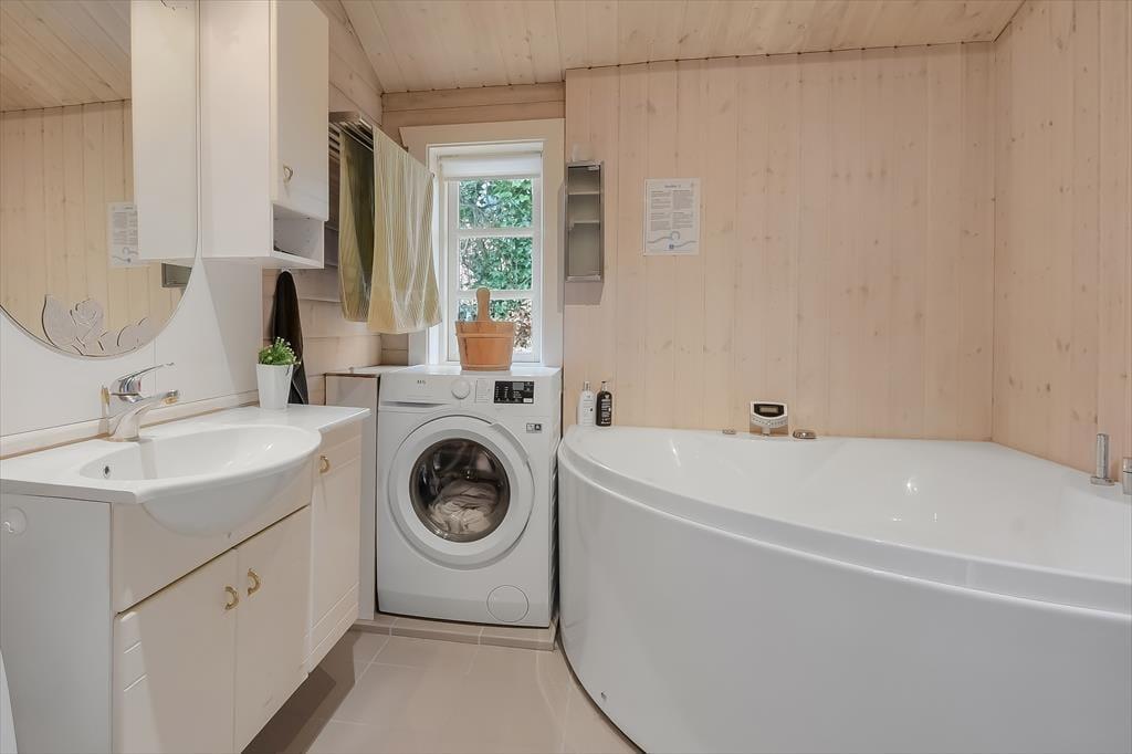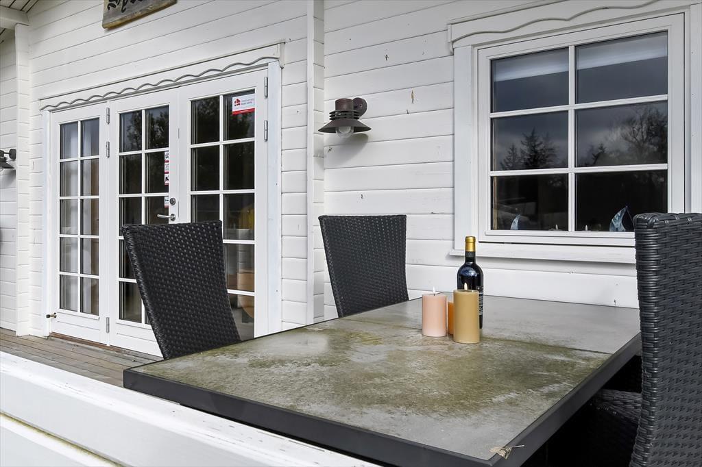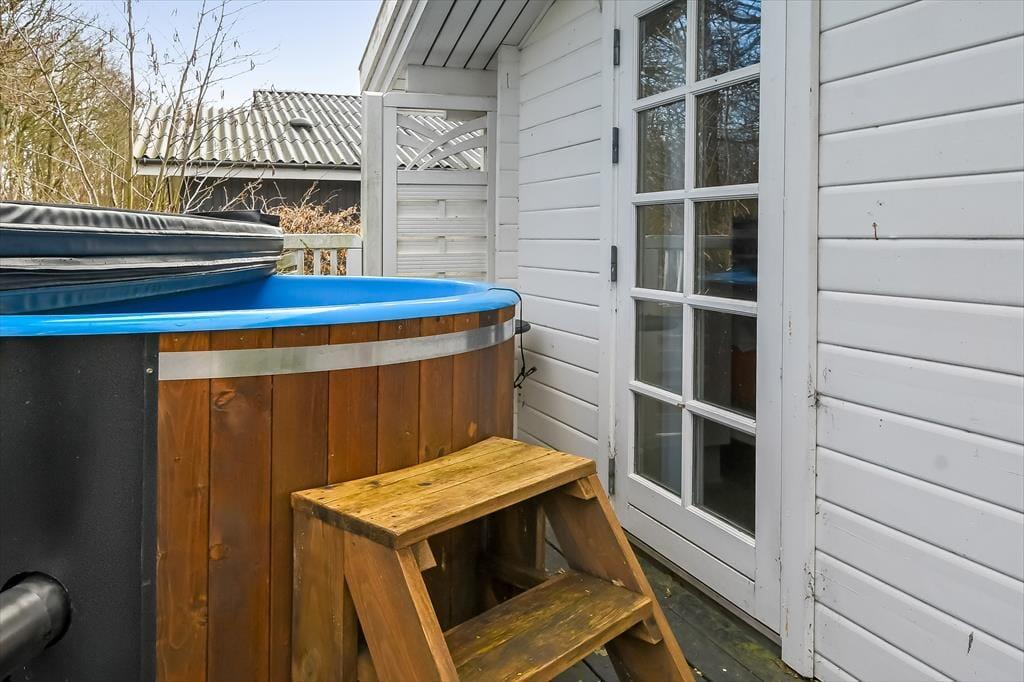 Sommerhusets vildmarksbad er et af de steder, hvor de sødeste ferieminder kan opstå. Bare tænk på, hvor dejligt det kan være at sidde herude i det varme vand, mens fuglene synger fra trætoppene, eller stjernerne lyser på himlen! Du kan sikkert også mærke roen helt ud i kroppen, når du slår dig ned på husets sydvestvendte terrasse. Den er udstyret med havemøbler af god kvalitet, og havedøren gør det nemt at smutte ind i køkkenet, hvis du vil fylde mere kaffe i koppen eller hente næste ret i aftenens udendørs feriemåltid.
