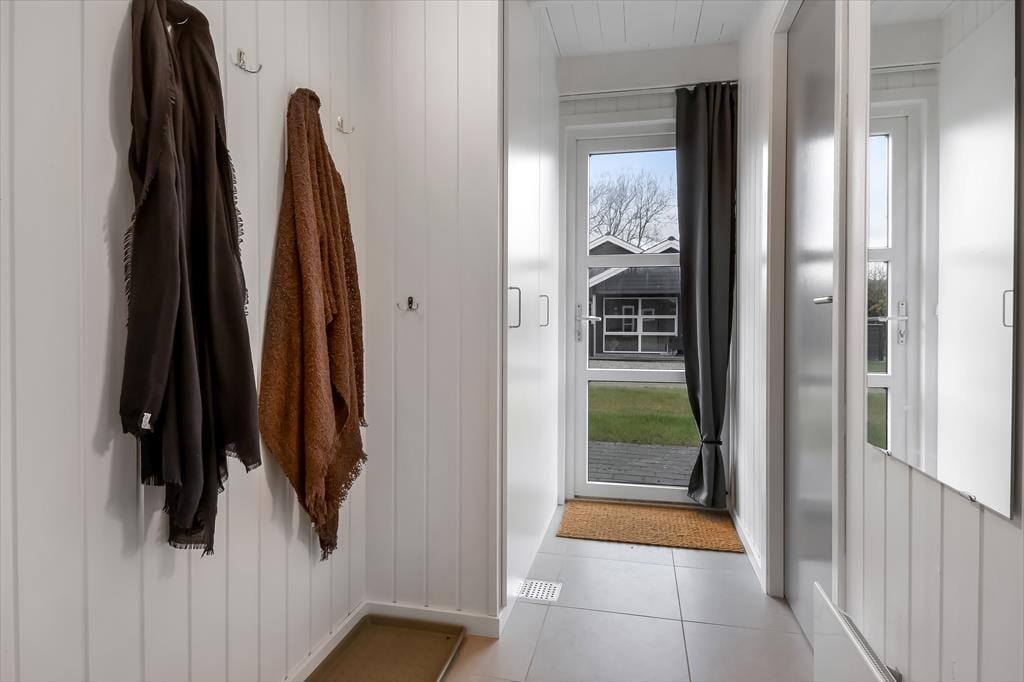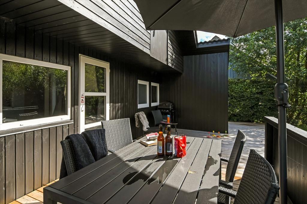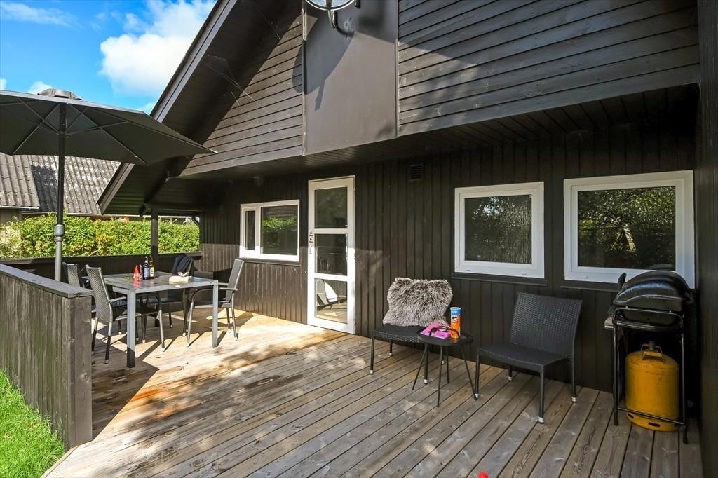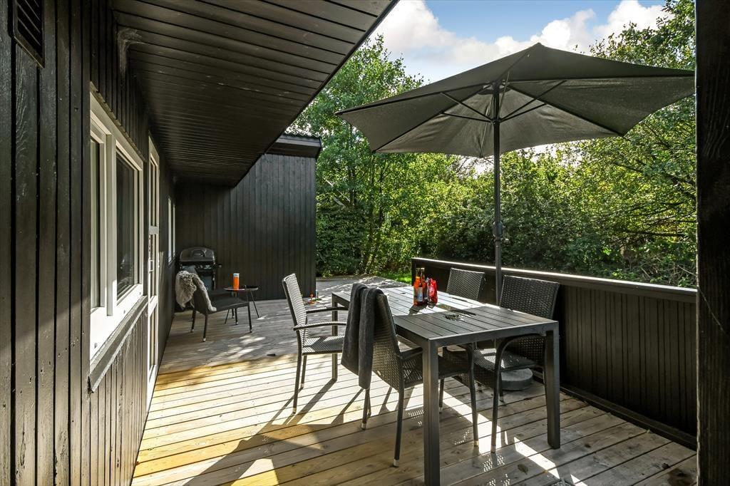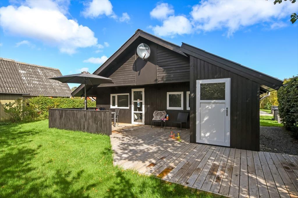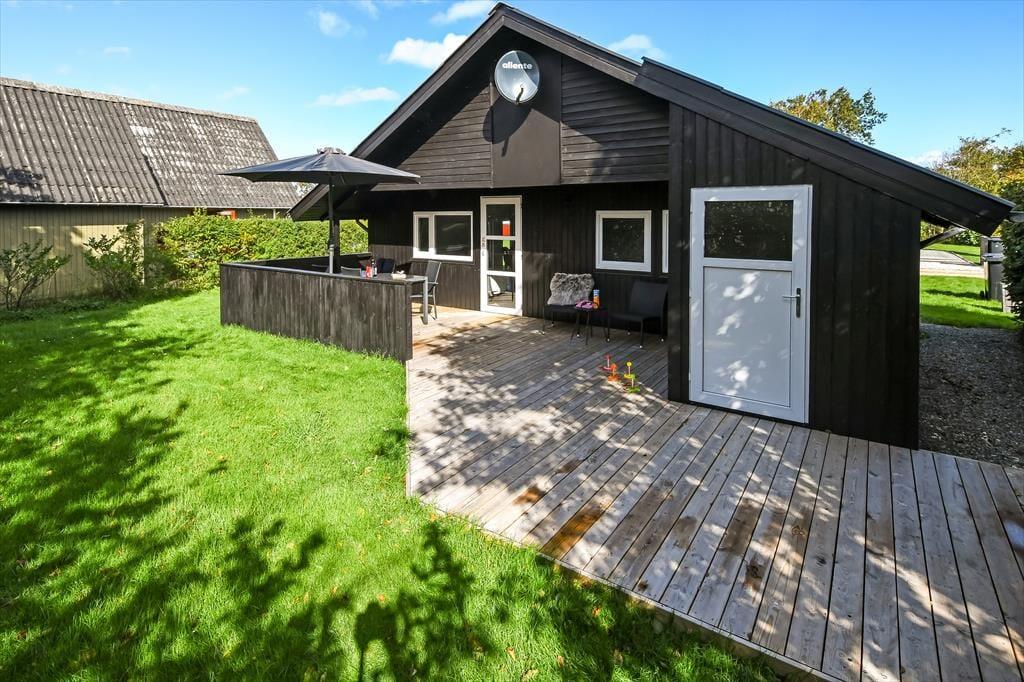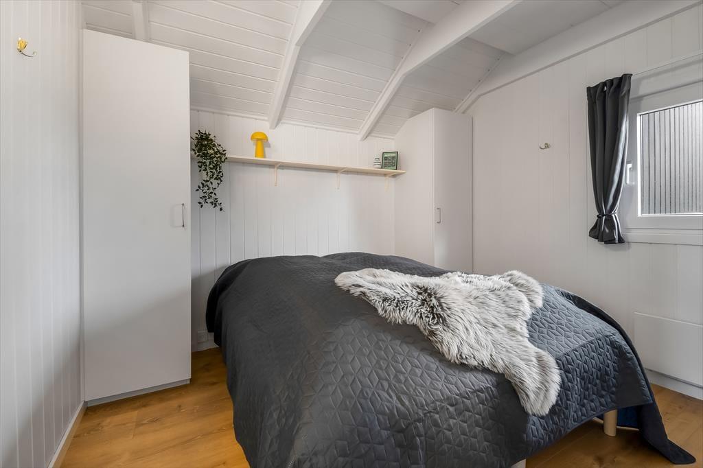 Ud mod den lille lukkede vej er der et flisebelagt terrasseområde og et græsareal, hvor bilen kan holde eller børnene lege. Men når du og familien vil slappe af, er det nok mere sandsynligt, at I søger om i den sydvendte baghave. Her venter der en stor træterrasse, der indbyder til solbadning i liggestolene, siestaer under parasollen og lækre måltider tilberedt på grillen. På en stille sommeraften er det skønt at sidde og nyde de rolige omgivelser helt frem til sengetid – når I altså ikke er ude for at lege på hyttebyens grønne fællesarealer eller hygge jer på havnen i Bork Havn.