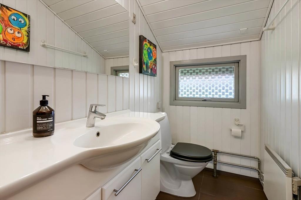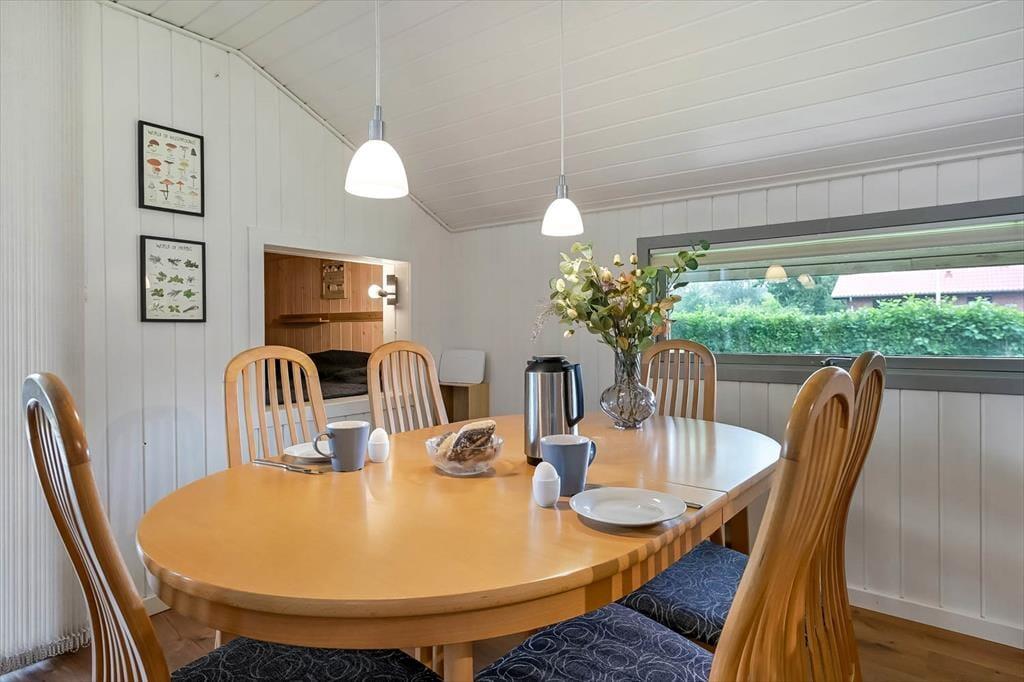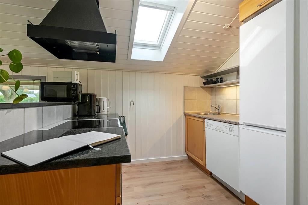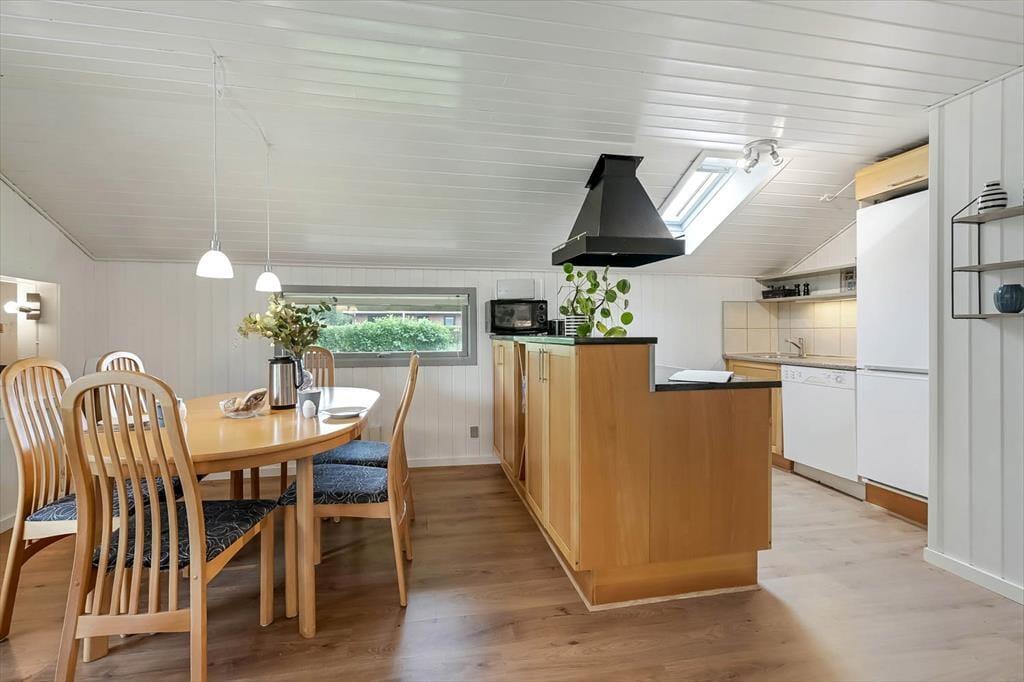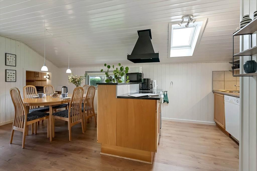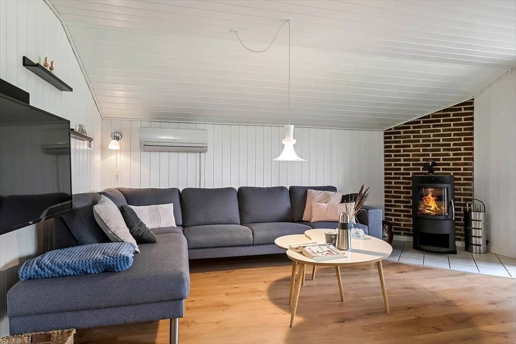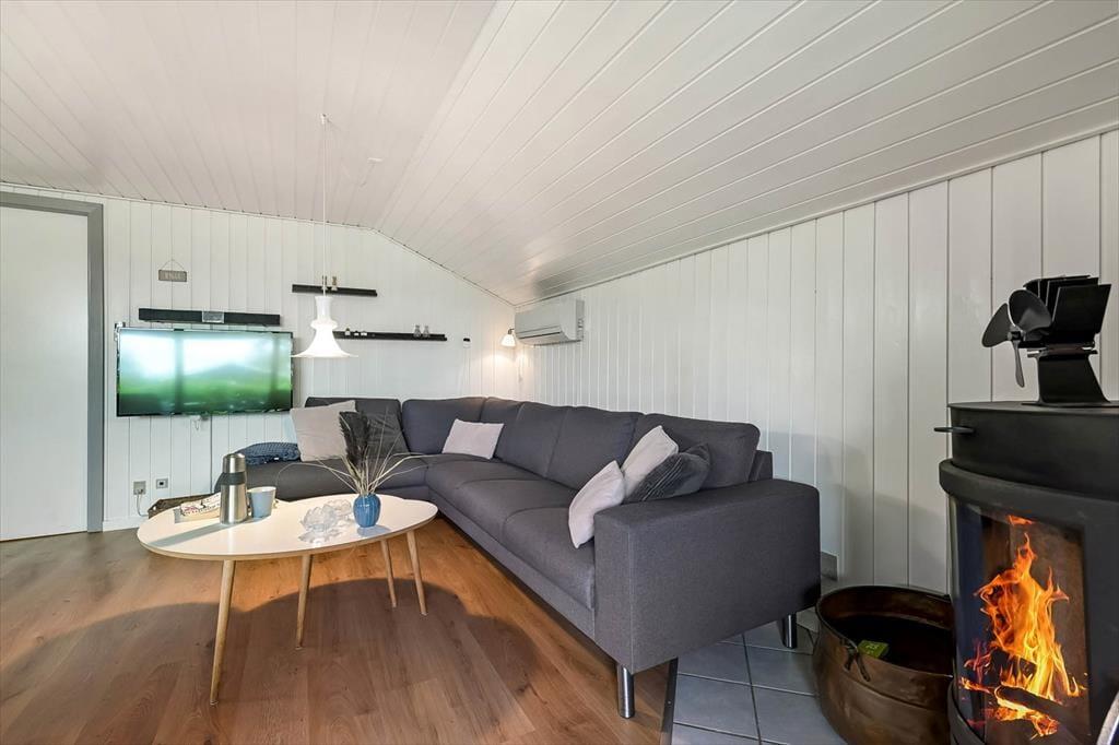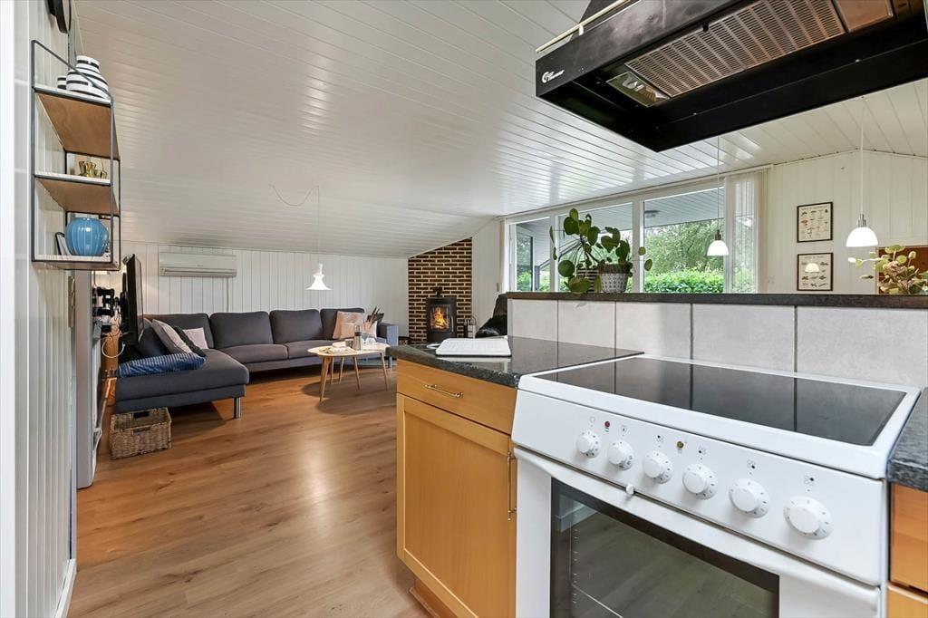 Du kan straks føle dig hjemme i sommerhuset, der har et velholdt og indbydende indre med trævægge, pæne gulve og et dejligt lysindfald. De tre soveværelser er alle rare at sove i, og hvis du og din familie vil slappe af i stuen alle sammen, behøver I ikke at kæmpe om pladsen. Både lænestolene og hjørnesofaen er nemlig rare at slænge sig i, og alkoven er en skøn hyggekrog – uanset om du trænger til en middagslur, eller om børnene vil lege i deres private ’hule’. På en kølig dag kan du tænde op i brændeovnen og sætte en simreret over i det åbne køkken, og hvis vejret er sommerligt, kan du i stedet lave iskaffe og åbne havedøren til terrassen.