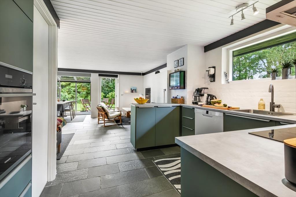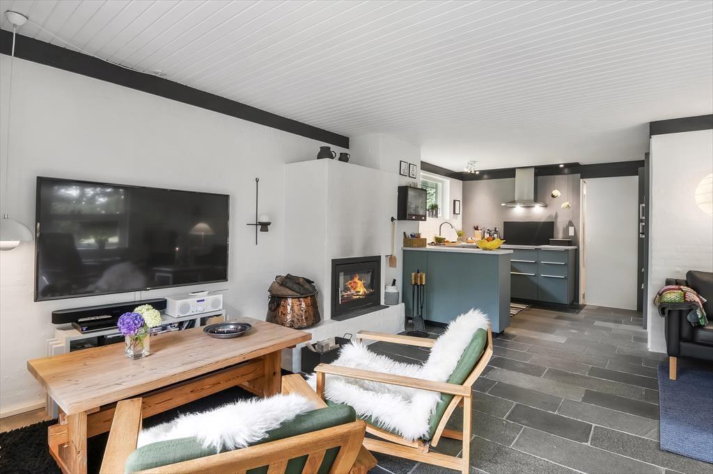 Når I ankommer, træder I ind i husets store og rummelige entré. Her er både plads til barnevogn og overtøj, og her kan feriens praktiske opgaver klares uden problemer. Huset råder derudover over to store soveværelser med masser af plads, samt et stort badeværelse og et ekstra toilet. Længere fremme i huset når I til det store og rummelige køkken-alrum med et åbent og lyst køkken, brændeovn og et hyggeligt sofaarrangement, der indbyder til hygge, hvis vejret ikke er til aktiviteter udendørs. I den sydvendte karnap har I sol hele dagen, og kan nyde alle de lækre måltider, der kan tilberedes i husets køkken, som har direkte udsigt til fjorden. Et feriehus, der både er til parret, der ønsker en hyggelig og fredelig stund, eller til familien, der ønsker aktivitet og god plads.