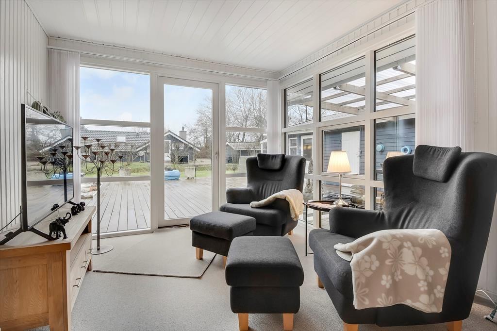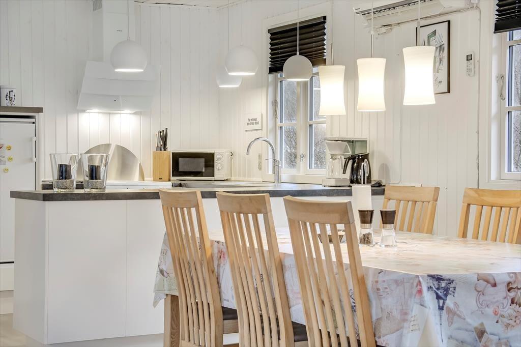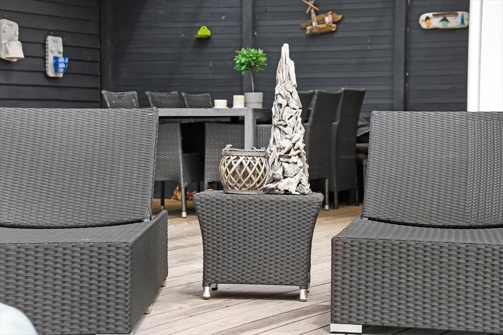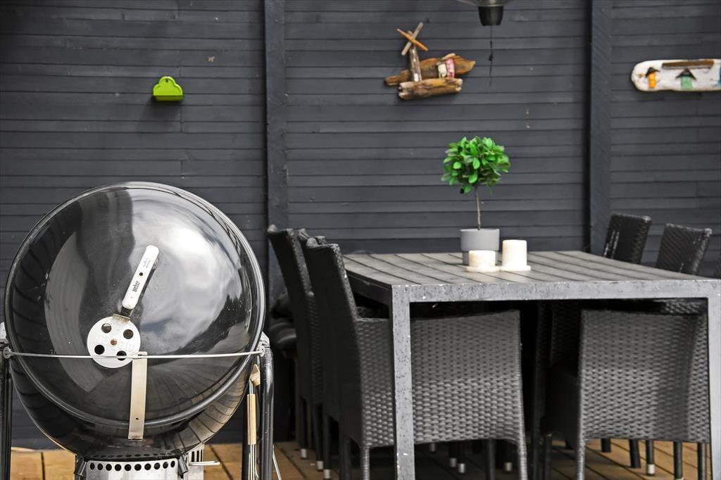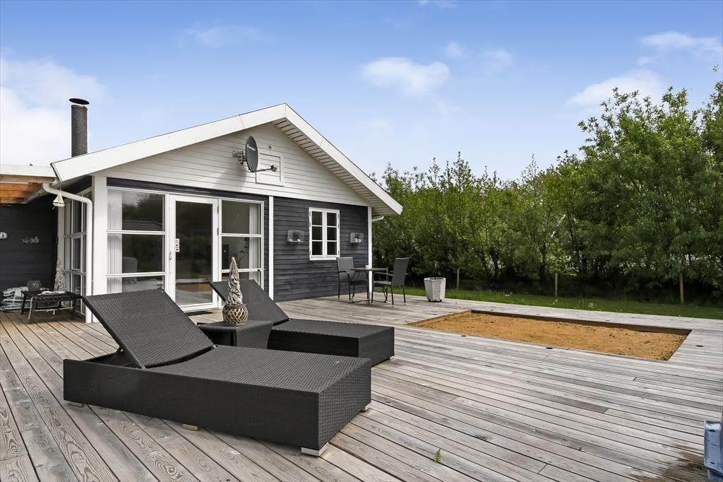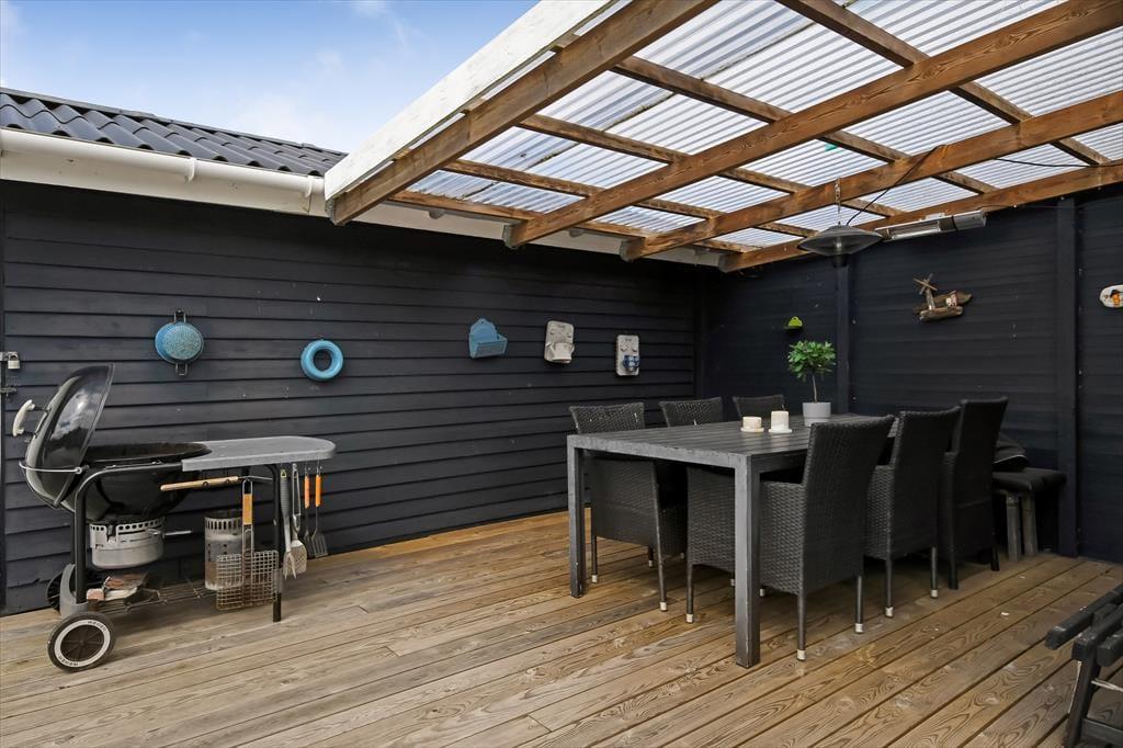 Huset har lige så meget at byde på udendørs – en del af terrassen er overdækket, og her er der spiseplads og grill. Yderligere er der et udekøkken til rådighed, hvor maden eller den friskfangede fisk kan tilberedes. Her er også plads til både afslapning og liggestole, hvis nogen skulle have brug for en lur i den friske luft. For enden af terrassen er der også en stor græsplæne, så alt i alt er her masser af plads for både store og små under den åbne himmel.