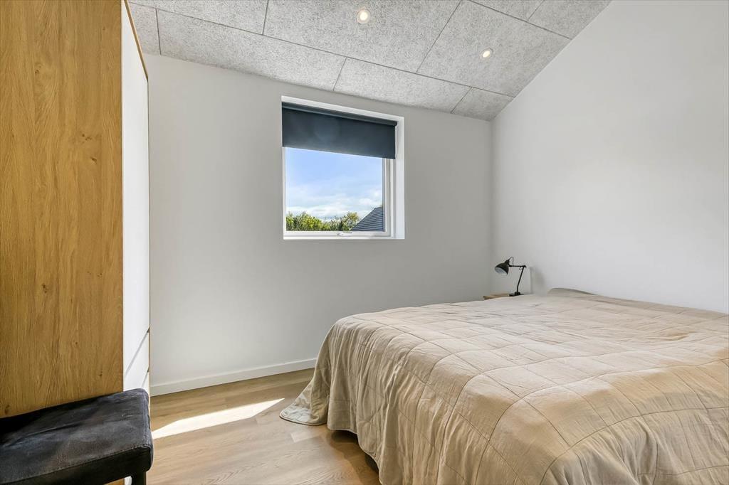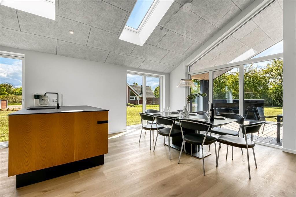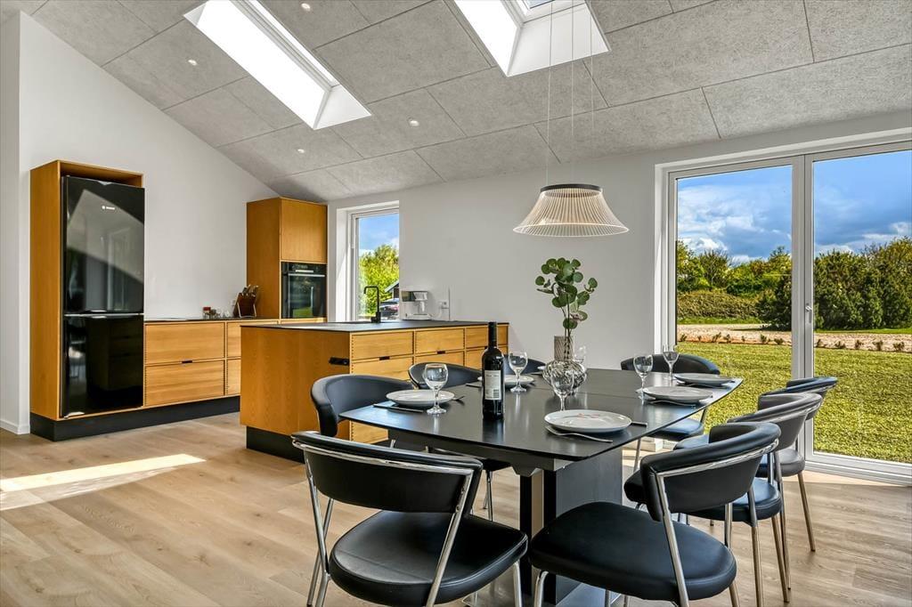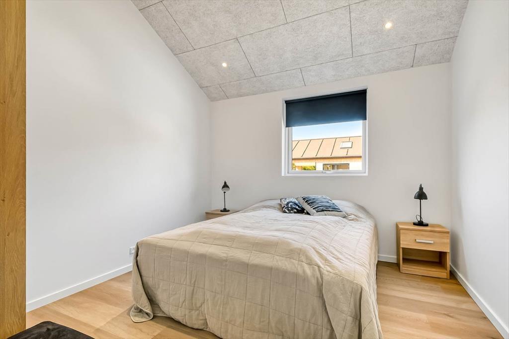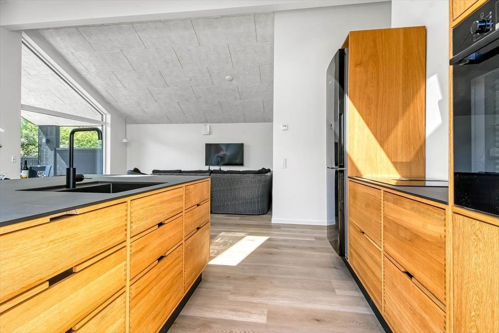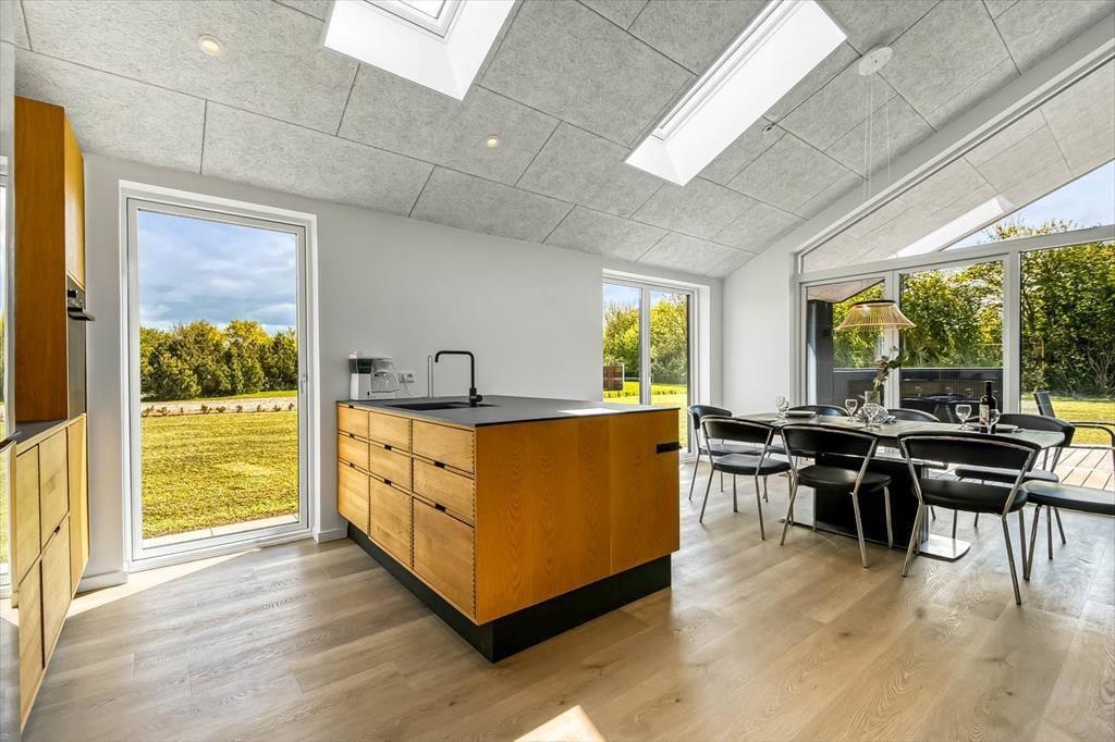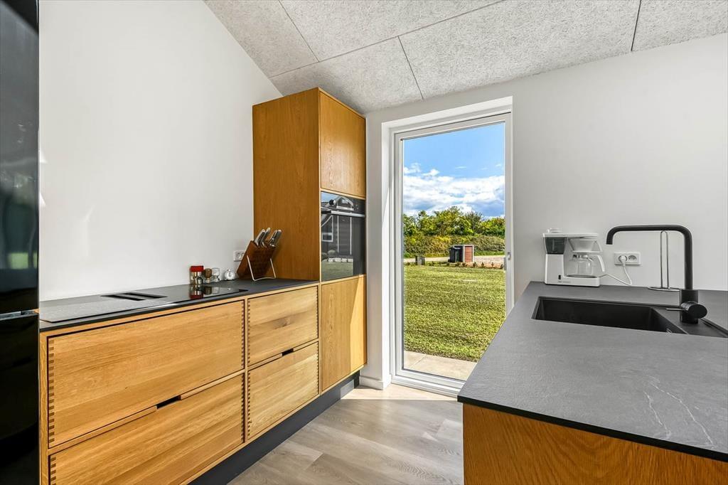 Træd indenfor i det spritnye sommerhus og mærk, hvordan lyset strømmer ind gennem de store vinduespartier og skaber en behagelig, let atmosfære. Højt til loftet og et elegant, åbent rumforløb får stuen og køkkenet til at smelte sammen i ét – og giver masser af plads til både fællesstunder og rolig alenetid. Duften af friskbrygget kaffe fra køkkenet blander sig med lyden af grin fra stuen, hvor familien samles om spil, bøger og hyggelige måltider. De to badeværelser gør det nemt at være mange under samme tag, og både store og små kan trække sig tilbage til husets indbydende værelser, når dagens oplevelser er fordøjet. Her får du ikke bare en feriebolig – men et rart og rammende sted at være sammen.
