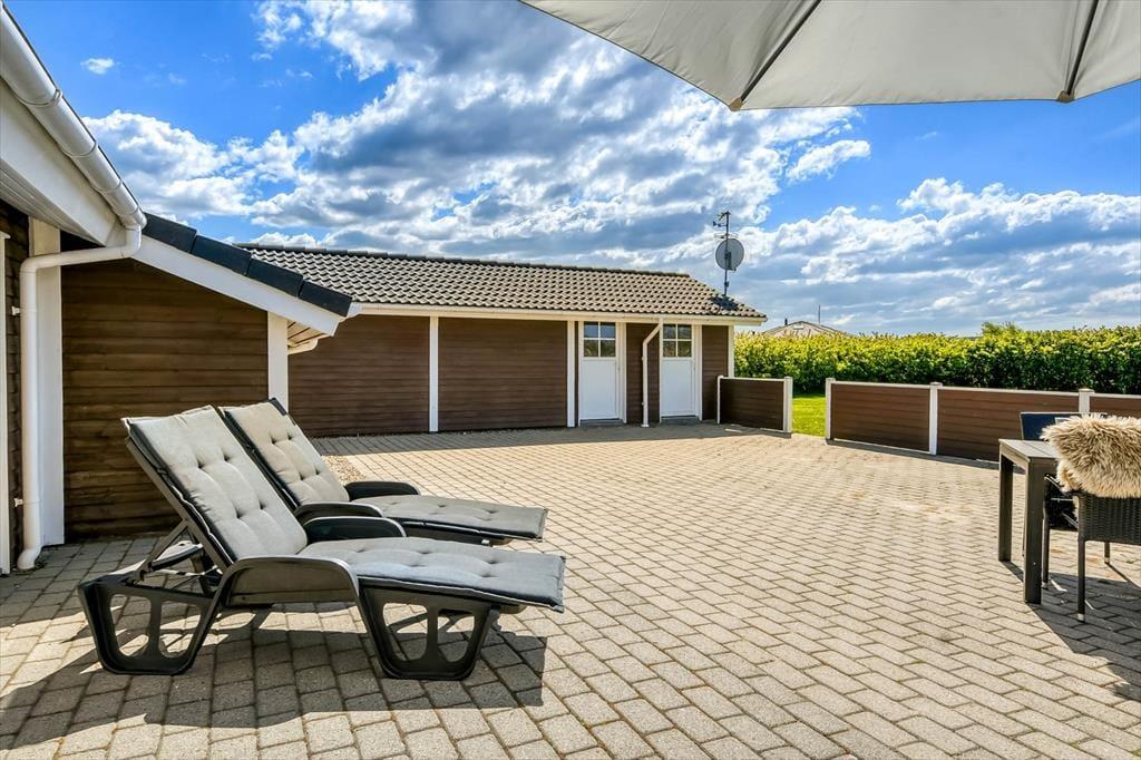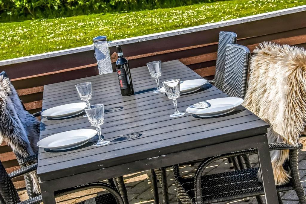 Ude i det fri er der masser af plads at brede sig på, for grunden måler 1201 m2 og er udstyret med et stort terrassemiljø såvel som en vidtstrakt græsplæne. Terrassen skærmes af et hegn til flere sider, mens grundens randbeplantning også sørger for at ramme opholdsarealet godt af – så du får rig mulighed for at finde en læfyldt og ugeneret siddeplads under åben himmel. Foretrækker du at sidde under et halvtag, er en del af terrassen overdækket, og det kan blandt andet være et hit på de dage, hvor du og dine kære ønsker at sidde længe ude for at nyde de lyse og stille sommeraftener.