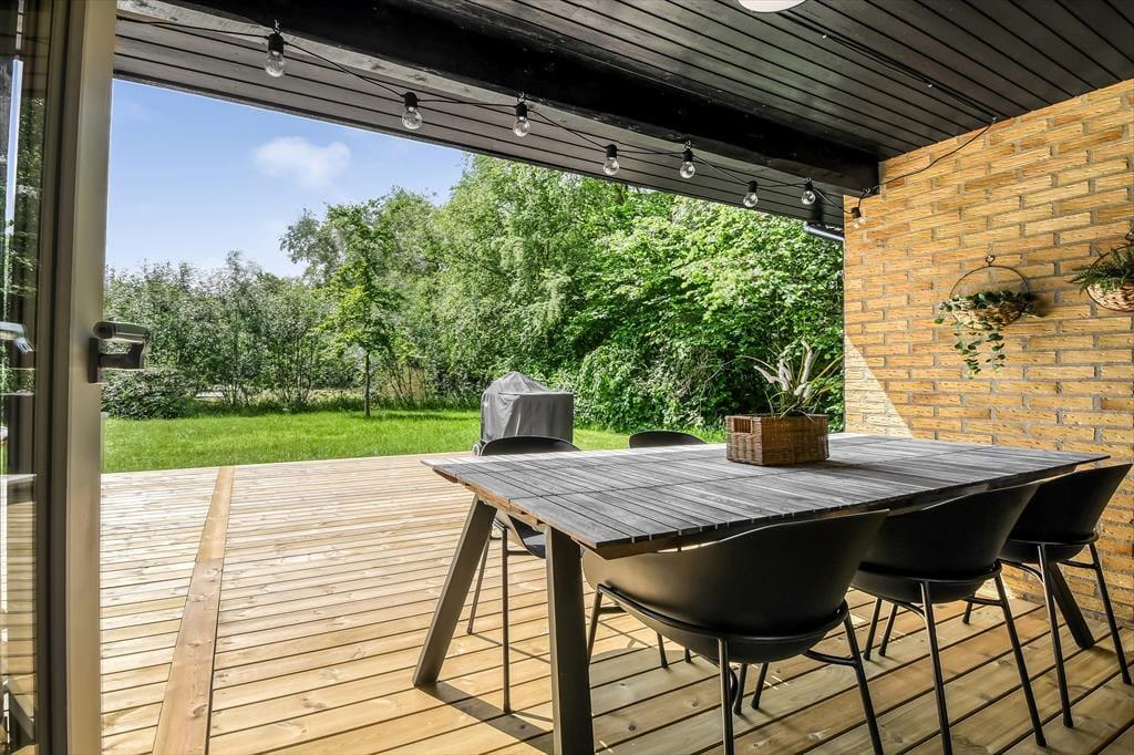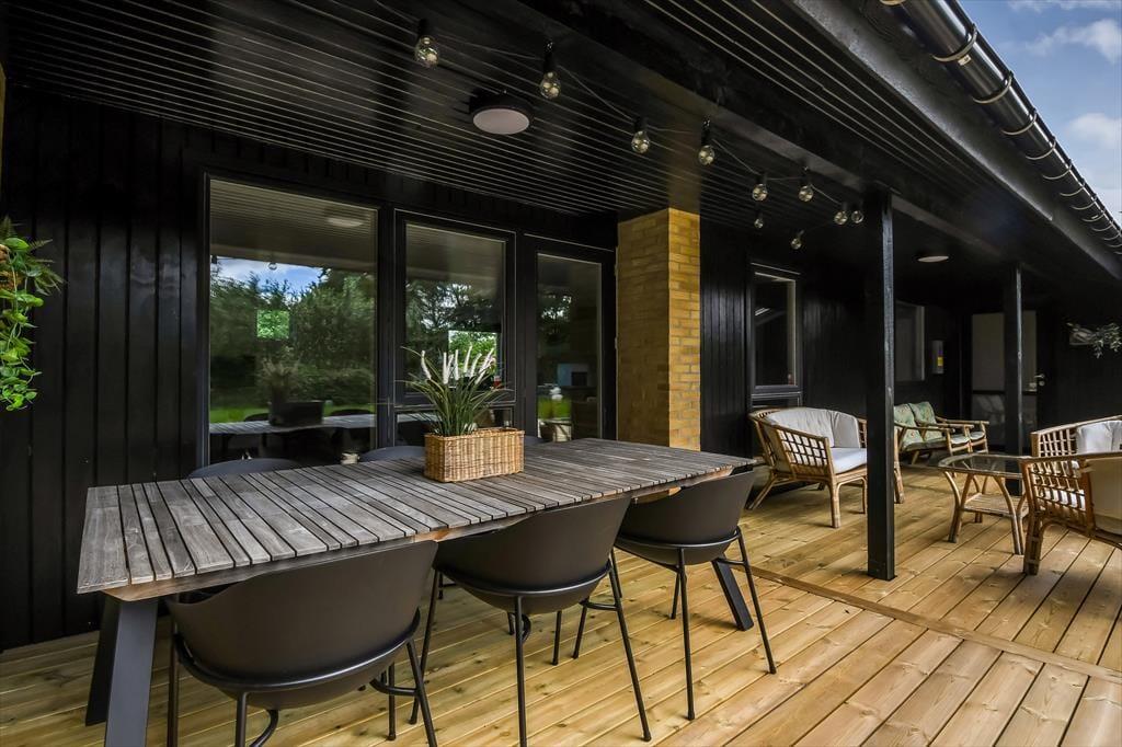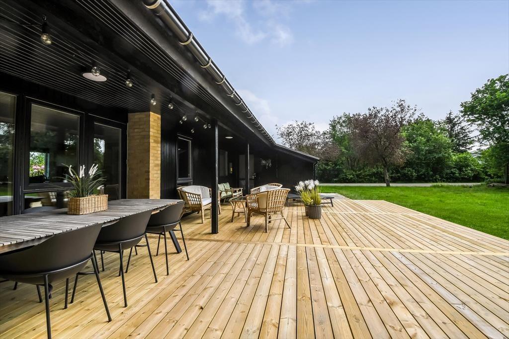Den sydvendte træterrasse har et overdækket areal, og derudover er resten helt åben, så solskinstimer såvel som lyse sommeraftner kan oplagt udspille sig her. Uanset tidspunktet på dagen er det skønt at sidde her og kigge ud på den grønne baghave – for eksempel mens børnene leger på græsplænen, og din bedre halvdel står ved grillen og får det til at dufte herligt. Grunden er med sine 1018 m2 tilpas stor, og hvis det ikke rækker til familiens udfoldelser, skal I blot gå ned for enden af vænget for at komme hen til en god legeplads med boldbane, gynger og klatretårn.