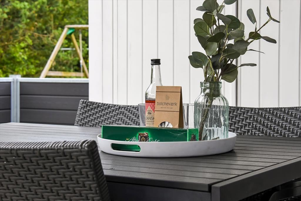 Udearealerne er gode på Fasanvænget 2, for grunden er med sine 1200 m2 dejligt stor, og der er gynger og sandkasse i haven til børnene, mens hele familien kan hygge sig med at spille havespil og lege fangeleg på den grønne græsplæne. En rolig pause i solen skal der selvfølgelig også være plads til, og den kan passende foregå på den store og delvist overdækkede terrasse, der breder sig syd for sommerhuset. Her er der havemøbler og en parasol til rådighed, og hvis du elsker at grille, kan du allerede nu begynde at overveje, hvad du skal forkæle dine kære med af frisktilberedte, lokale lækkerier.