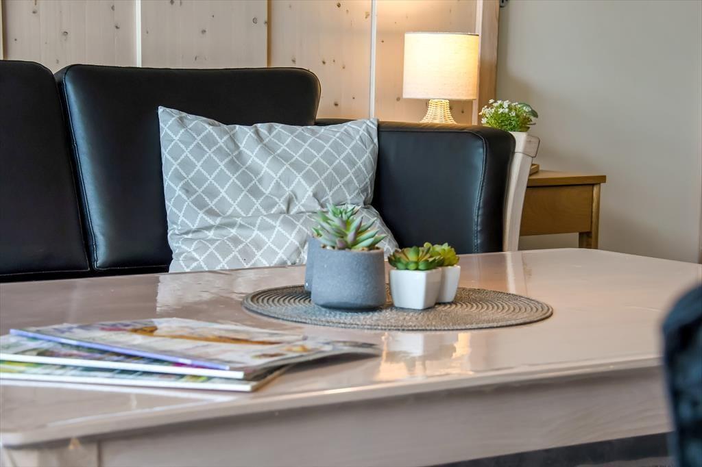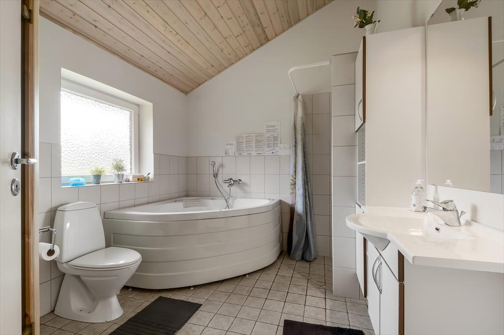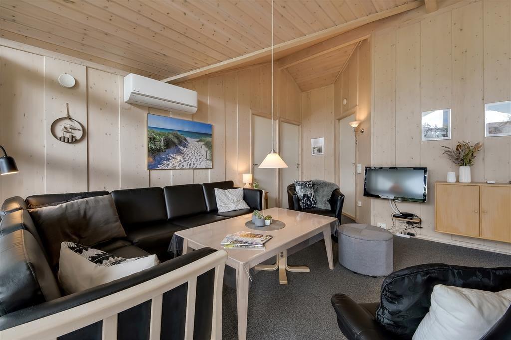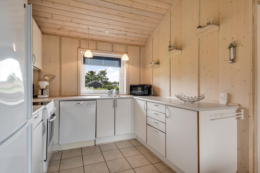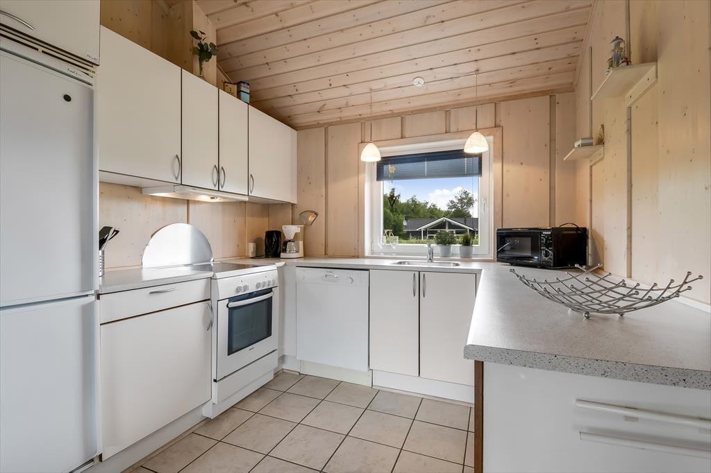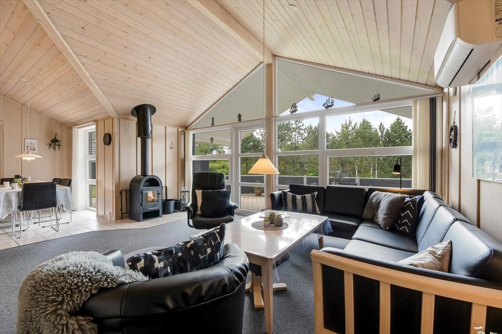 Sommerhuset er et kønt og velindrettet eksemplar, der har loft til kip og lys træbeklædning på væggene såvel som brændeovn og komfortabelt interiør. Hver eneste af husets 87 m2 er godt udnyttet, og der er sengepladser til seks personer fordelt på tre soveværelser, så hvis du gerne vil invitere bedsteforældrene eller børnenes yndlingsmoster med på ferie, kan det sagtens lade sig gøre. Et gæstetoilet ligger på praktisk vis lige ved entréen, mens det store badeværelse byder på både spabad og sauna. Det er sikkert lige noget for dig, når der rigtigt skal slappes af – med mindre du hellere vil koble af med at lave mad i det åbne køkken eller flade ud med en god film i stuens sofaafdeling.