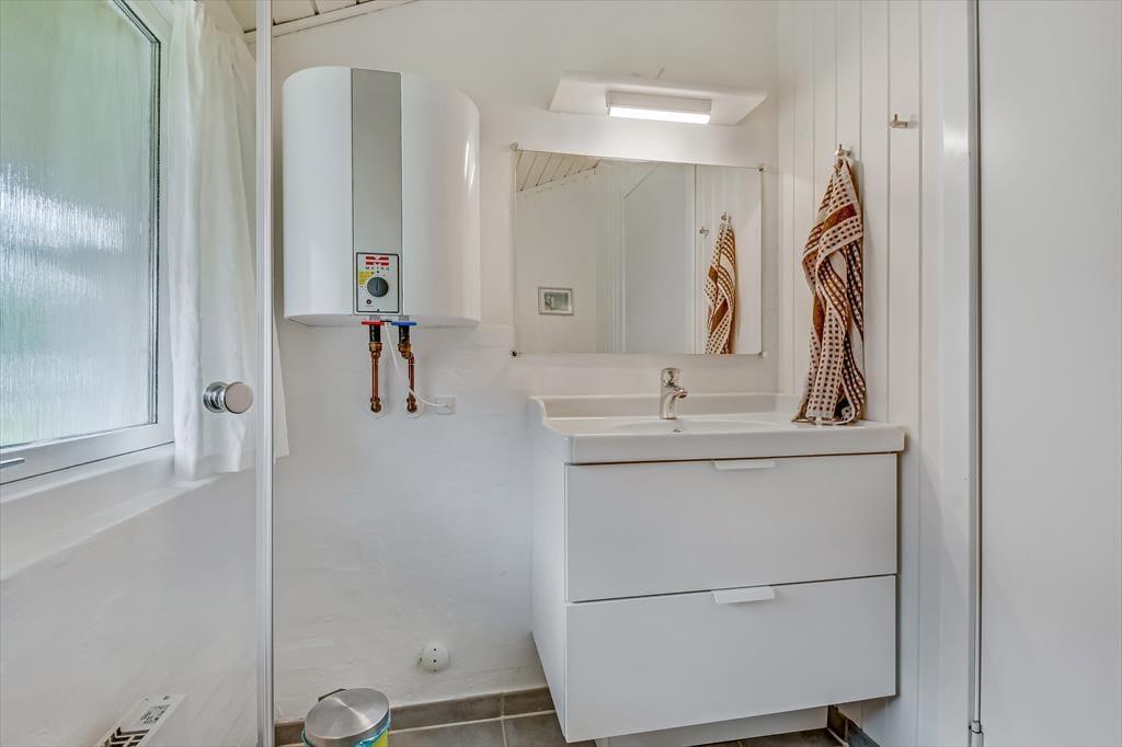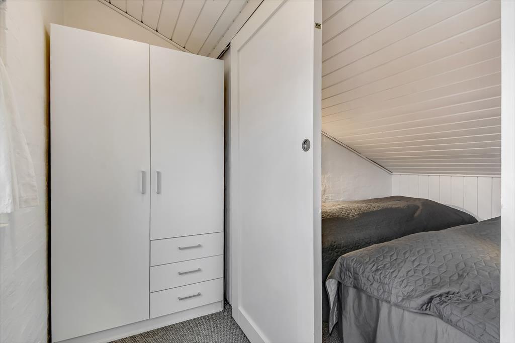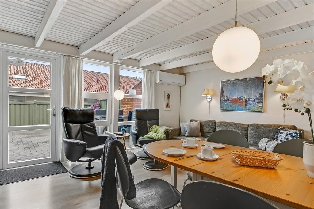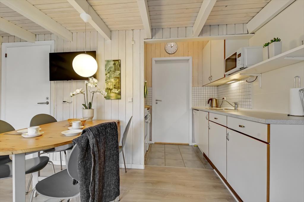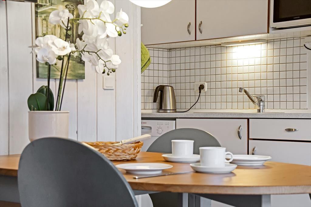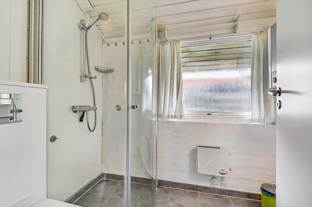 I forlængelse af stuen breder en dejlig terrasse sig, og det er det helt rette sted at være, når solen står højt på himlen, og der er sommerstemning i luften. Terrassen er helt aflukket, så der er skærmet godt af, når du vil nyde en kop formiddagskaffe eller få en kølig forfriskning inden aftensmaden – som for øvrigt også kan indtages i det fri, hvis du og familien ønsker at få det maksimale ud af det gode vejr. Hvis du har små børn med på ferie, vil de med garanti blive glade for bebyggelsens hyggelige legepladser, og uanset alder er det herligt at have både fjord, havn og badestrand inden for meget bekvem rækkevidde.