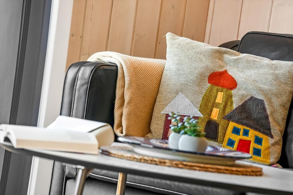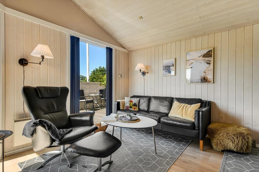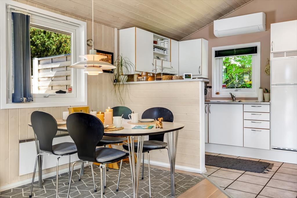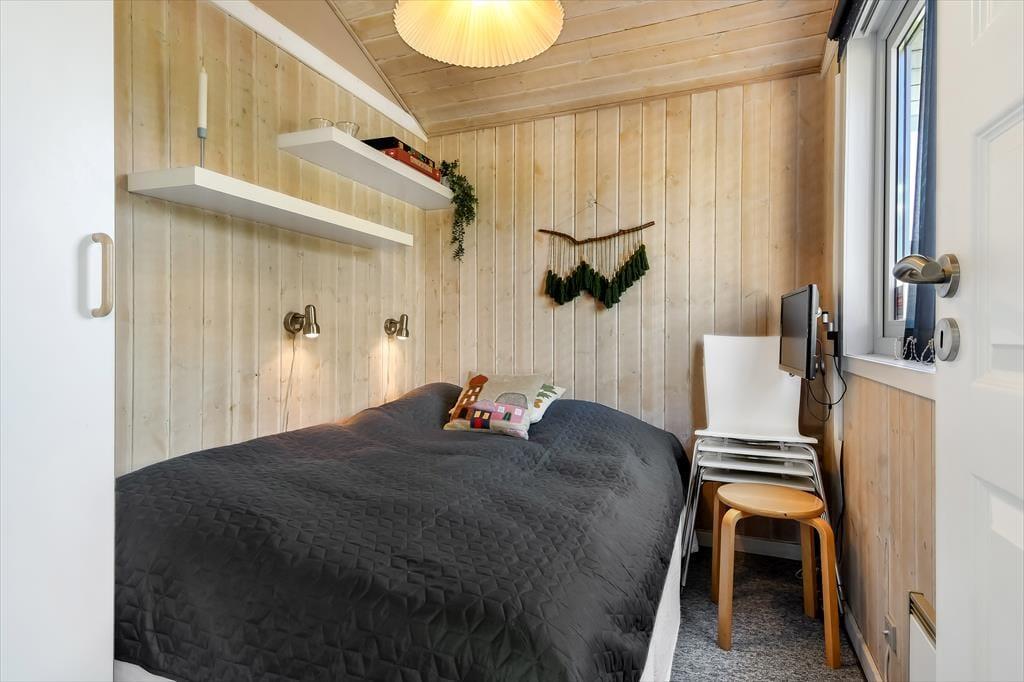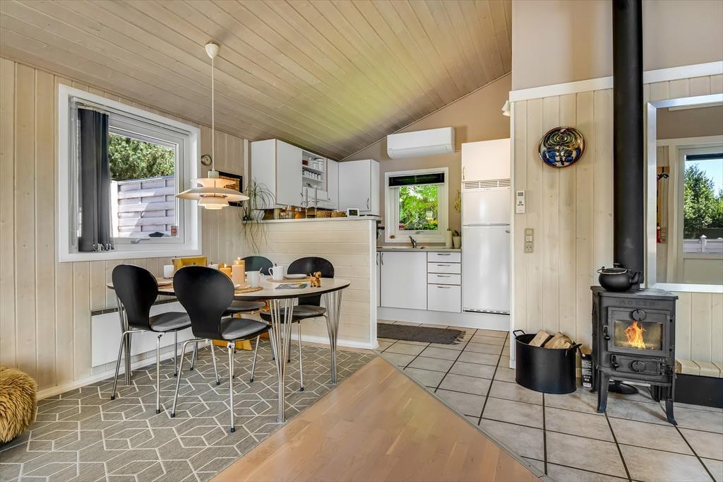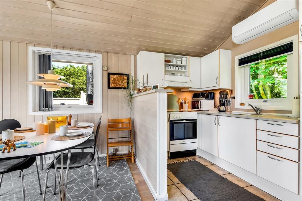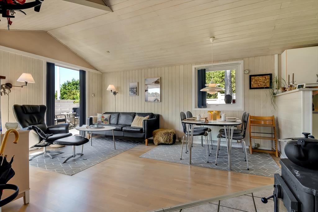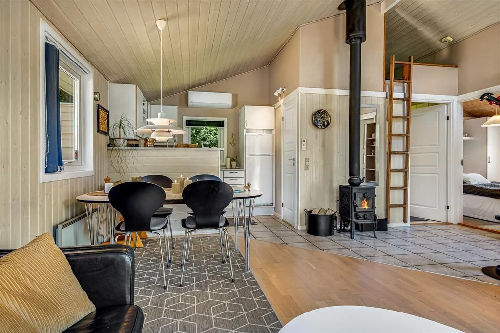 Hyggestemningen er i top inden døre, hvor sommerhusets 50 m2 er fornuftigt fordelt mellem opholdsafdelingen, badeværelset og de to soveværelser. Planløsningen gør huset velegnet til en afslappende parferie såvel som en skøn ferie med børnene – og uanset setuppet, kan du se frem til at nyde livet i stuen, når der er ild i brændeovnen, snacks på bordet og eventuelt en god film på fladskærms-tv’et. Brætspil, boglæsning og måske en middagslur eller to kan der også blive plads til, når det er ferietid, og om aftenen kan du glæde dig til at lave mad og efterfølgende indtage måltidet i de hyggelige rammer.