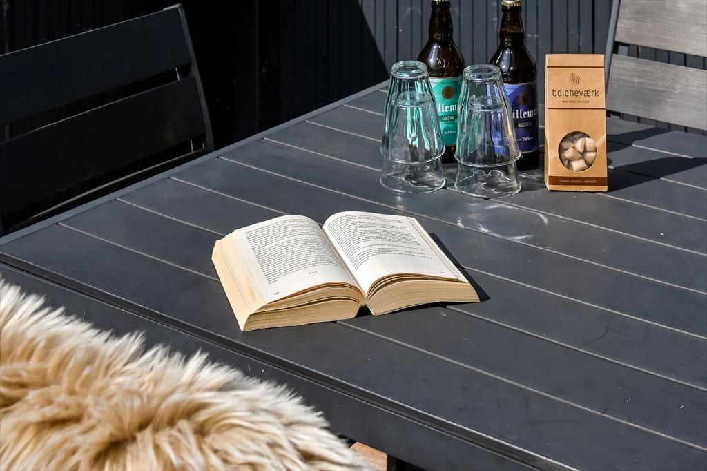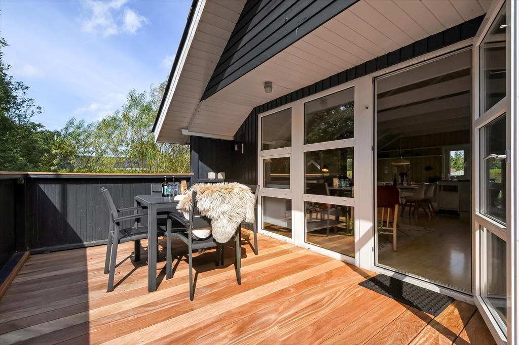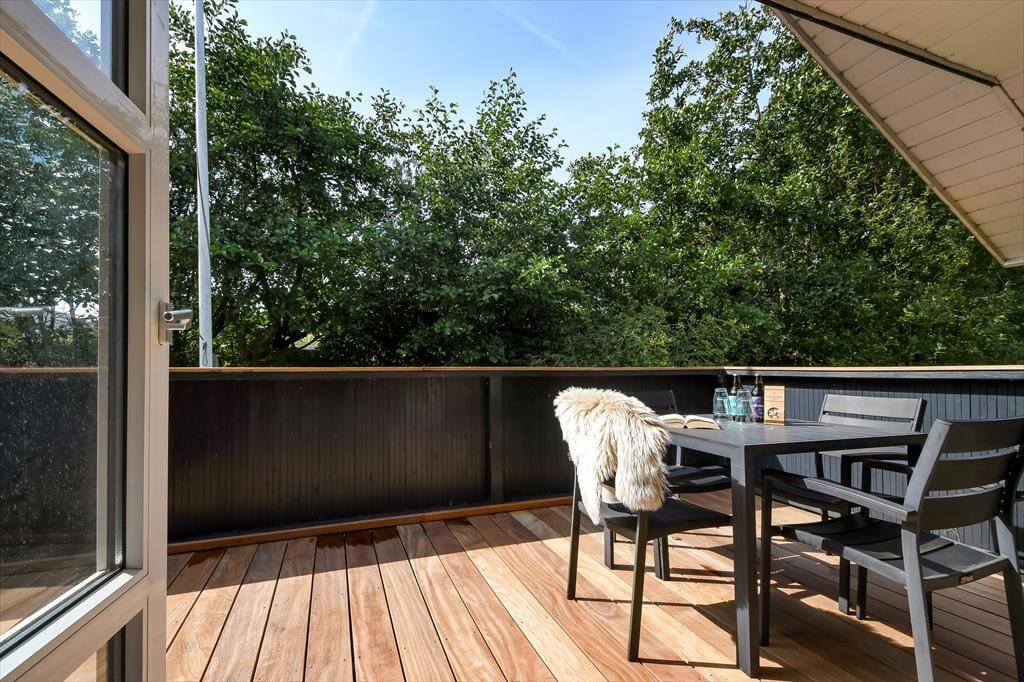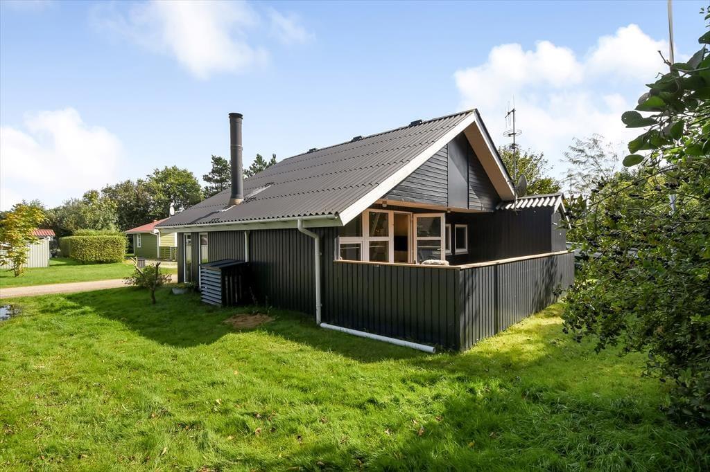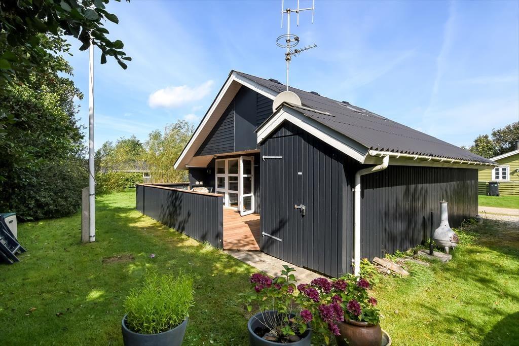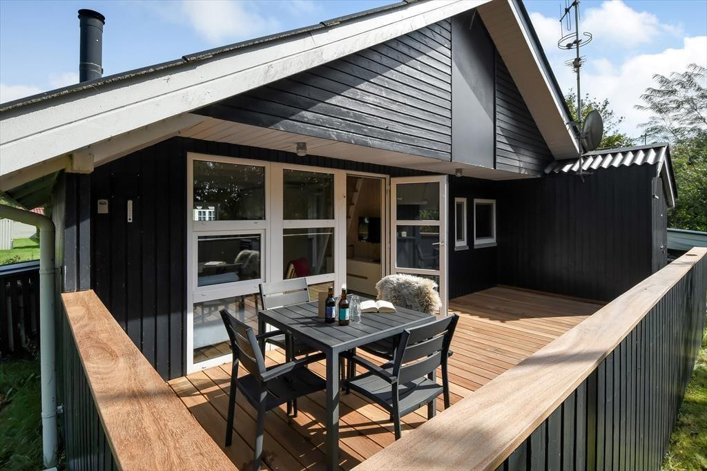 Det sortmalede træsommerhus ligger på en lille, men dejlig grøn grund, der skærmes af træer mod syd, så det udendørs opholdsareal er ganske ugeneret. I 2024 er der kommet en ny træterrasse, som er delvist overdækket og et skønt tilholdssted, hvis du og dine kære vil slikke sol, dele en sommerlig frokost og nyde det rolige feriedriverliv i havemøblerne. Trænger du til at koble helt af, er det fristende at blive siddende her i timevis med kaffe i koppen og dem, du holder af – og hvis der skal være lidt mere gang i den, kan du gå ned til Bork Hyttebys lille jollehavn eller tage med børnene hen på en af områdets legepladser.