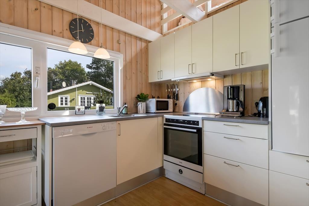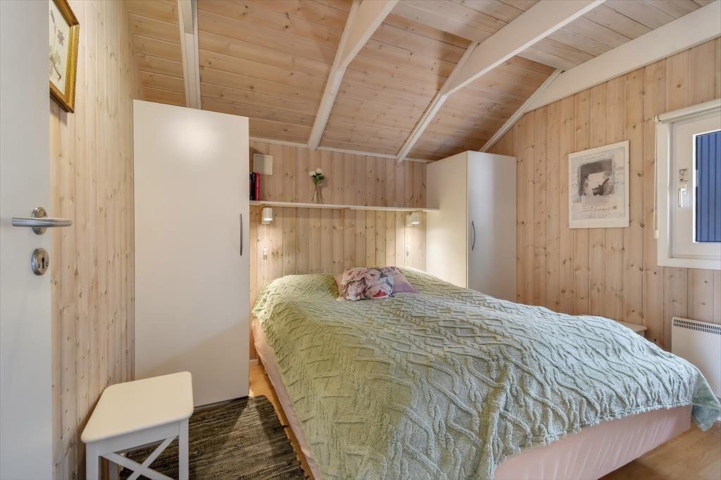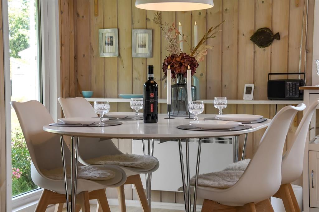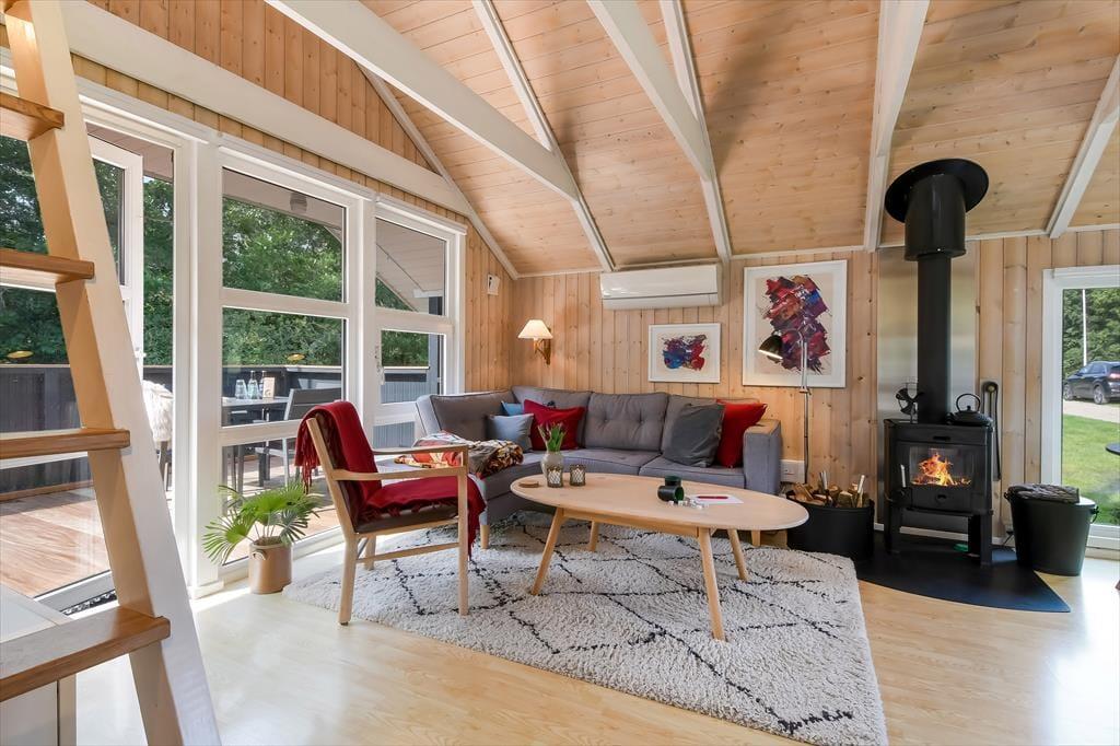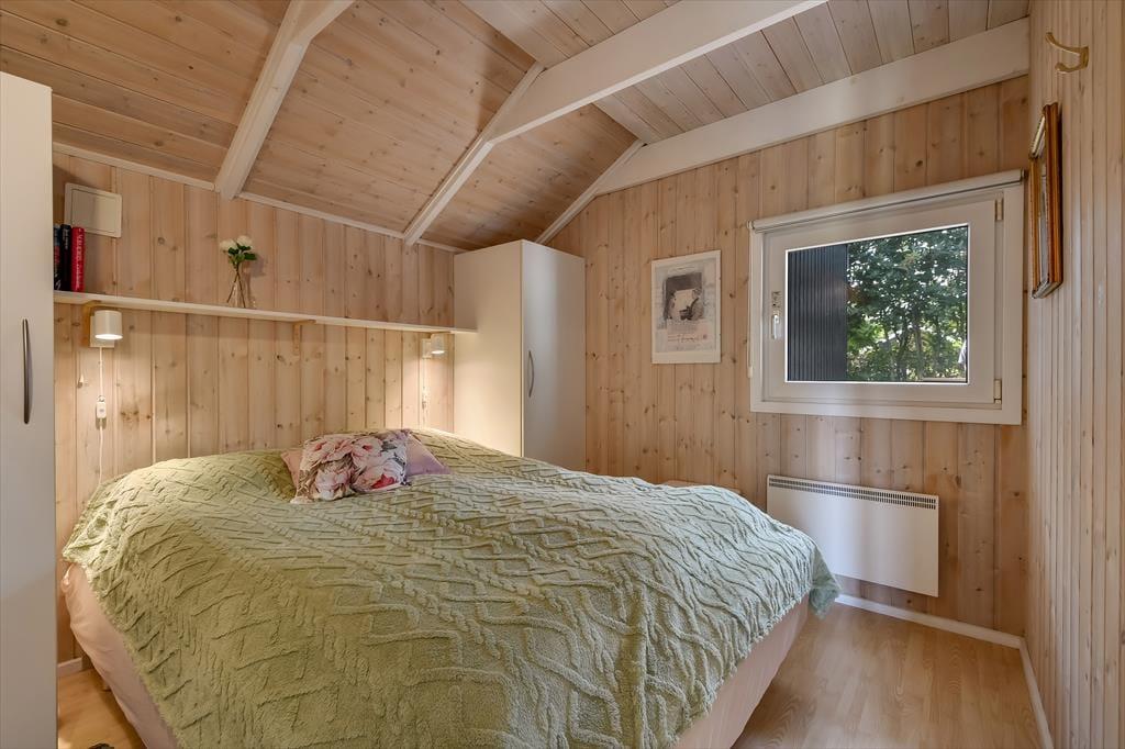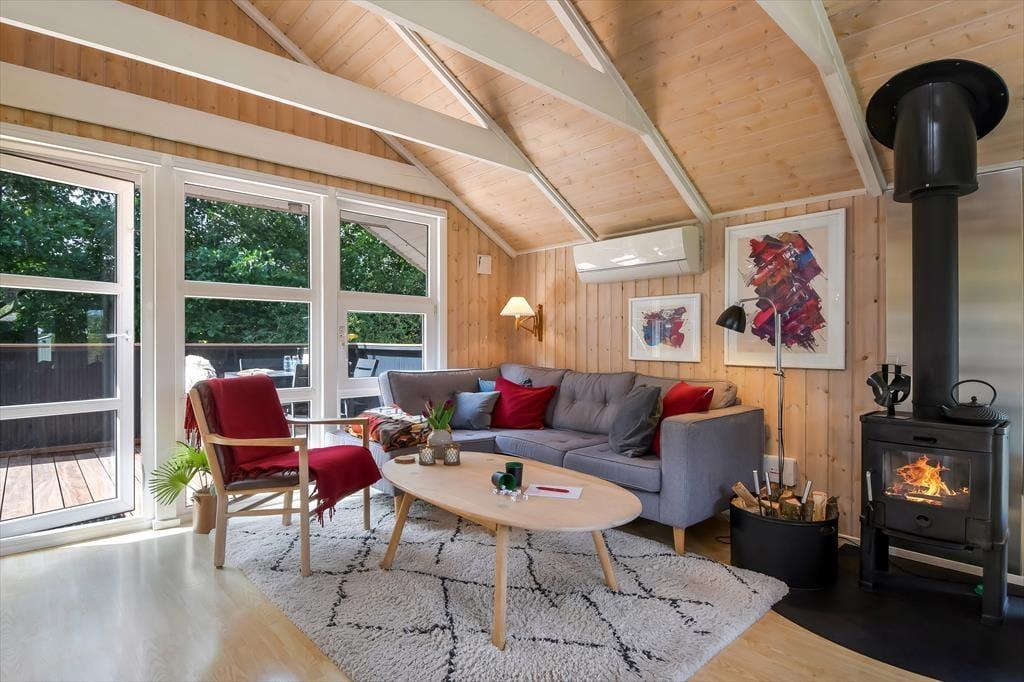 Sommerhuset er sådan et, der bare emmer af ro og afslapning, og det er et oplagt sted at holde en dejlig familieferie – og hvis du har hund, er den for øvrigt også velkommen. To soveværelser ligger side om side, og badeværelset er praktisk placeret ved entréen, mens køkkenet er integreret med stuen. Med andre ord fungerer planløsningen upåklageligt, og du får rig mulighed for at sove længe, tage velgørende brusebade, lave lækre middage og nyde tiden sammen med brætspil, krydsogtværser og filmaftener godt tilbagelænet i sofaen. Brændeovnen står klar, hvis du vil sprede ekstra varme og hyggestemning, og stuens terrassedør gør det nemt at smutte ud, så snart solen skinner.