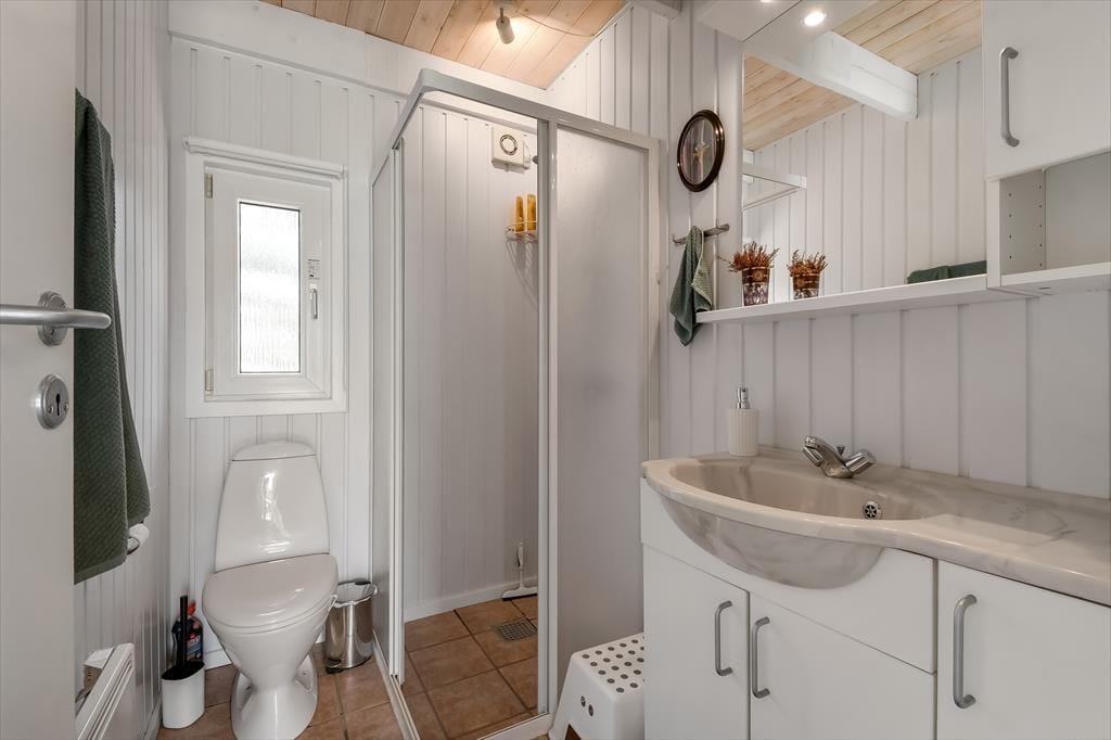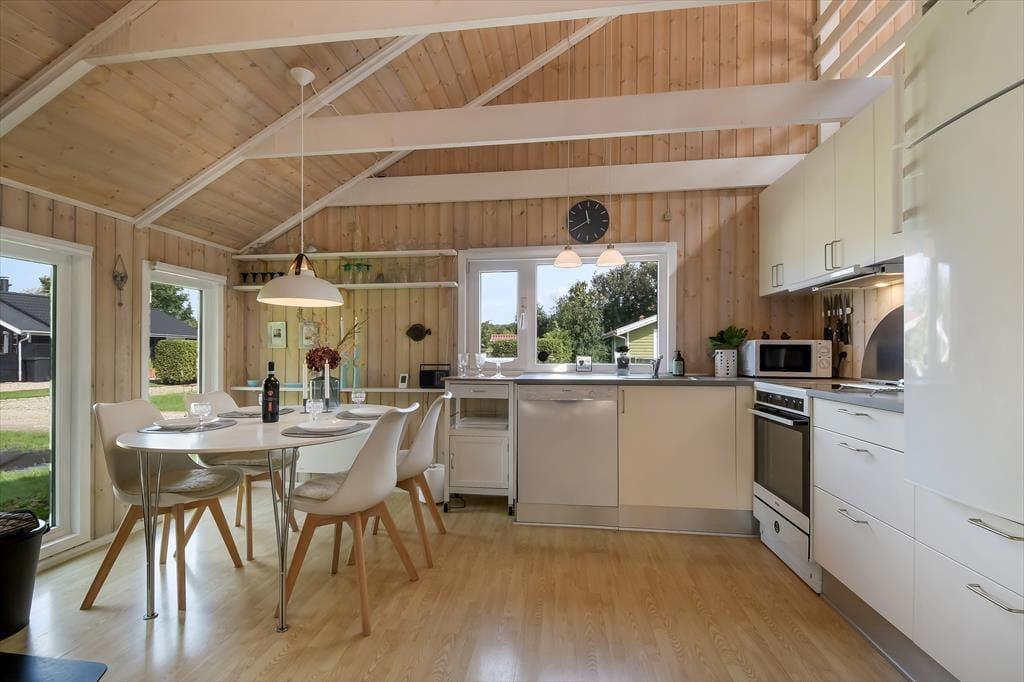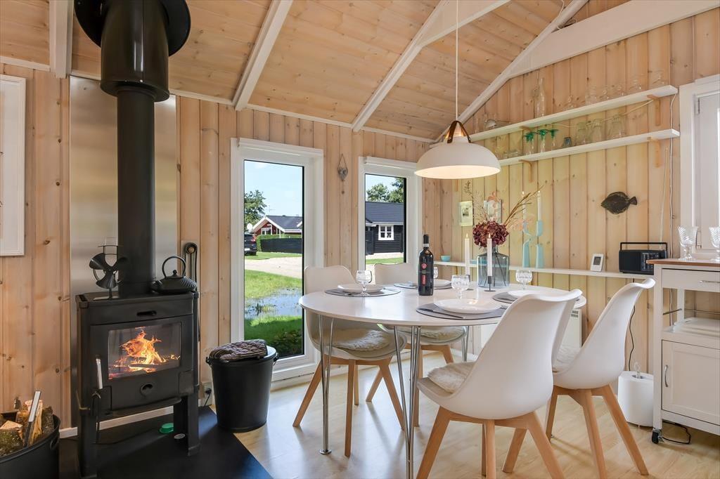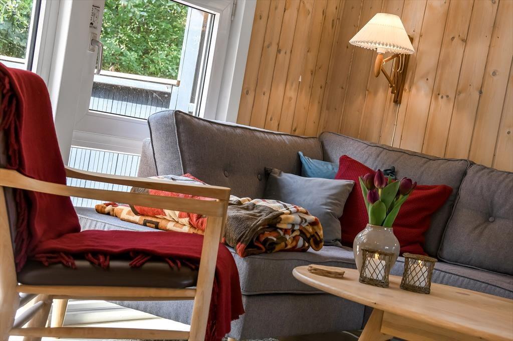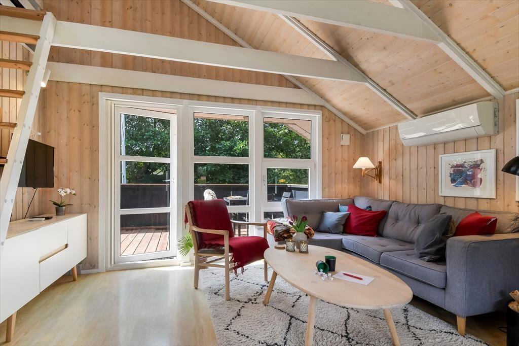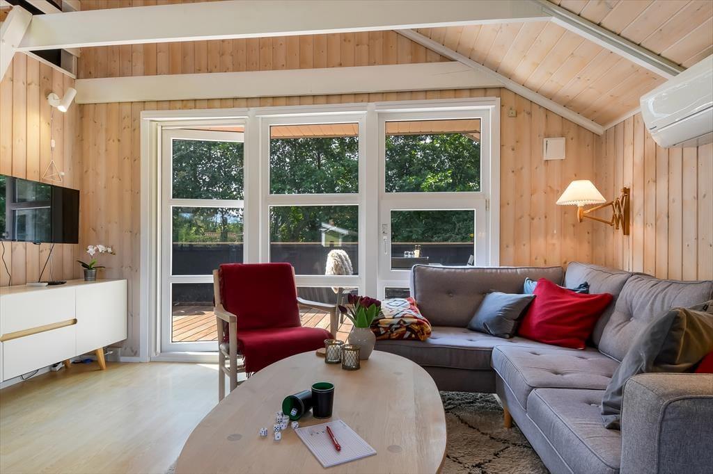 Sommerhuset er sådan et, der bare emmer af ro og afslapning, og det er et oplagt sted at holde en dejlig familieferie – og hvis du har hund, er den for øvrigt også velkommen. To soveværelser ligger side om side, og badeværelset er praktisk placeret ved entréen, mens køkkenet er integreret med stuen. Med andre ord fungerer planløsningen upåklageligt, og du får rig mulighed for at sove længe, tage velgørende brusebade, lave lækre middage og nyde tiden sammen med brætspil, krydsogtværser og filmaftener godt tilbagelænet i sofaen. Brændeovnen står klar, hvis du vil sprede ekstra varme og hyggestemning, og stuens terrassedør gør det nemt at smutte ud, så snart solen skinner.