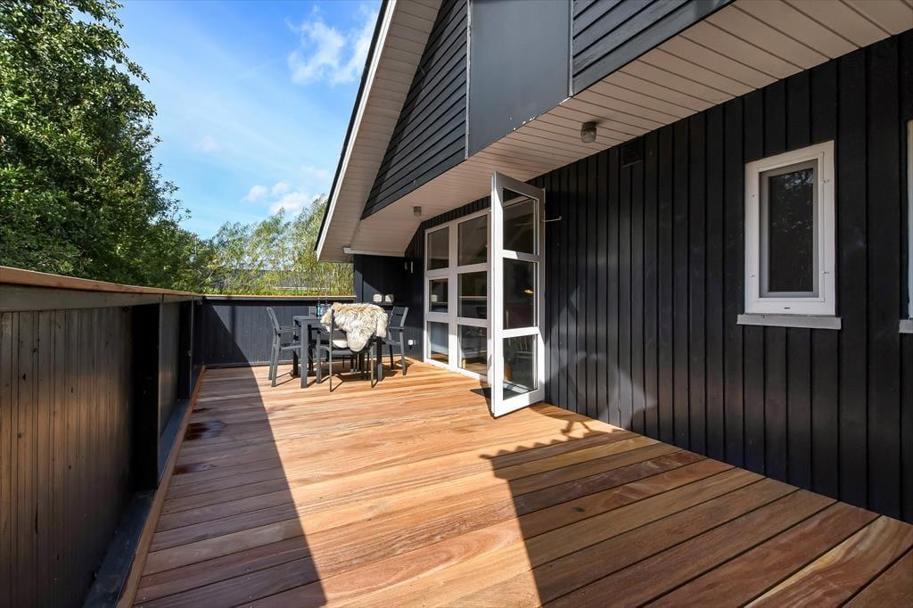 Dette lyse og velindrettede sommerhus er den helt rette base, hvis du er på udkig efter et hyggeligt og roligt sted at holde ferie. Huset ligger på en lukket vej i Bork Hytteby, så du og dine kære har nem adgang til legepladser og til områdets lille jollehavn – men det er nu også fristende at blive hjemme på husets skønne træterrasse.
