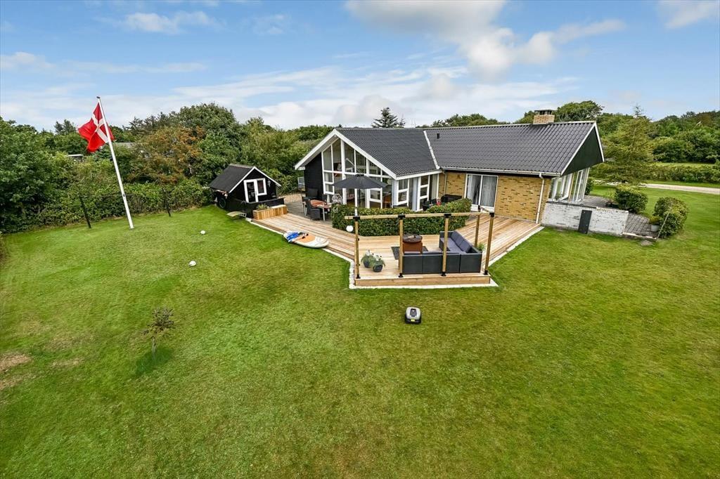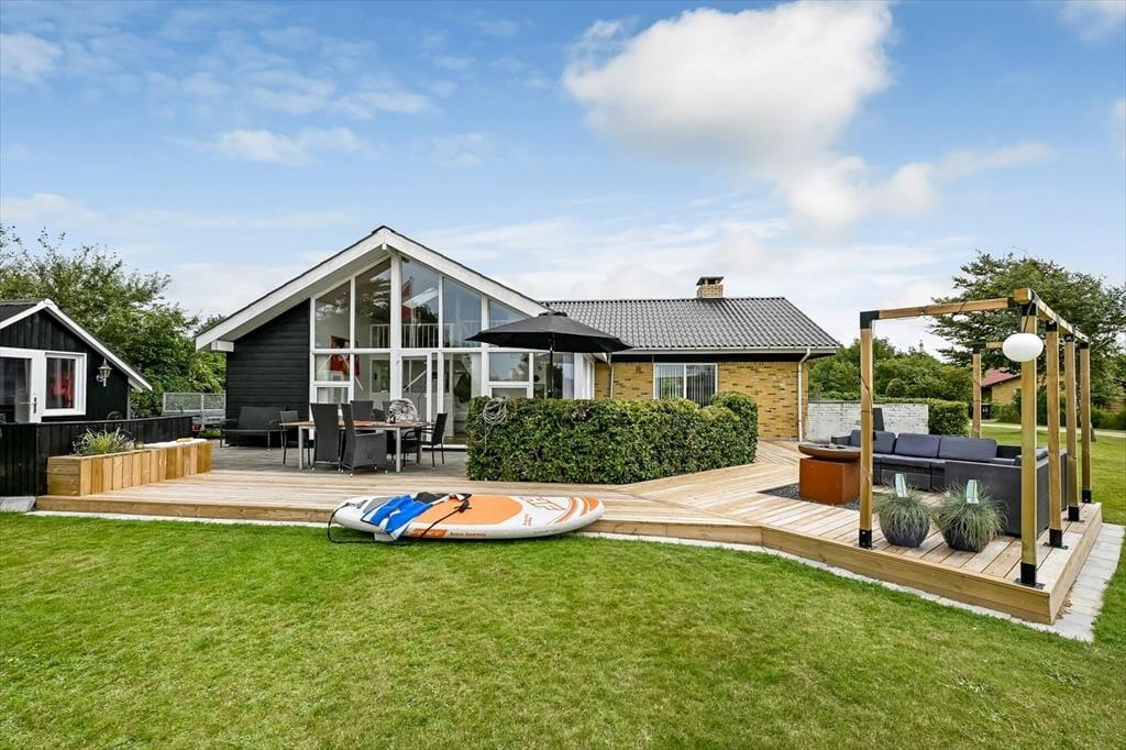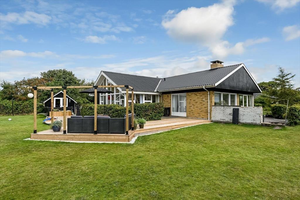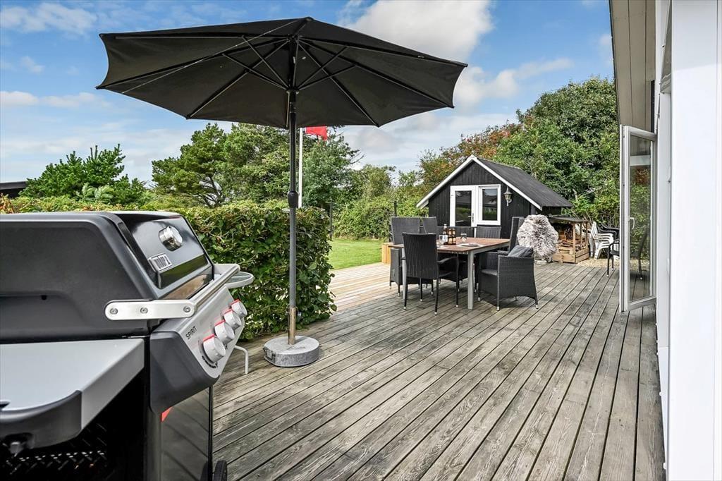 Sommerhusets grund er stor og velanlagt, og selv hvis I er mange samlet, har I godt med plads til at lege, spille bold og nyde det lune og solrige vejr på helt rolig vis. Den pæne græsplæne kan danne rammen om børnenes kolbøtter og andre fysiske udfoldelser, og omkring huset ligger der flere terrasser, så du og dine kære kan sætte jer der, hvor der er mest sol og læ. Parasollen kan du slå op, hvis I vil have skygge til sommerfrokosten, og hvis du elsker at grille, kan aftensmaden blive tilberedt i det fri hver eneste dag.