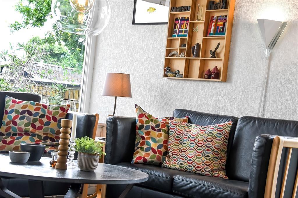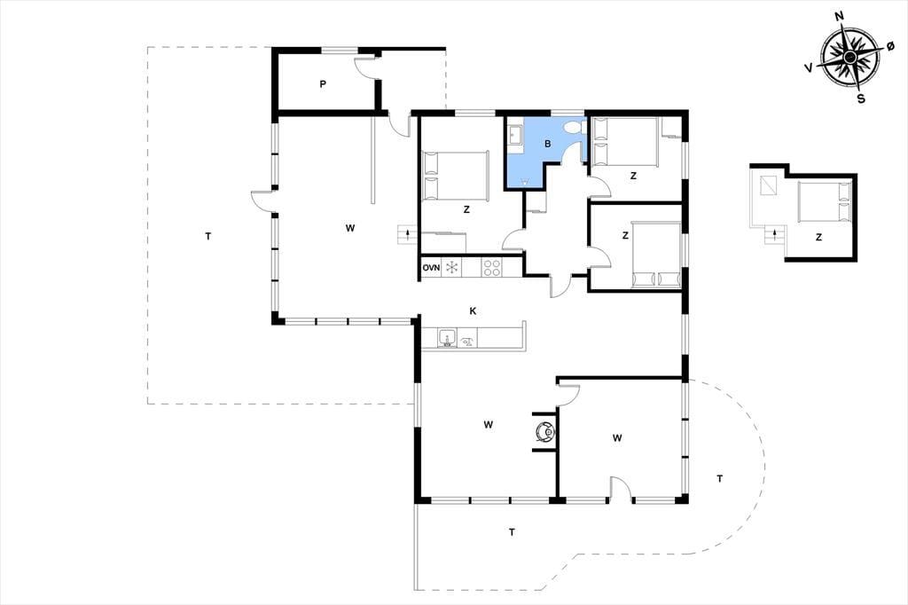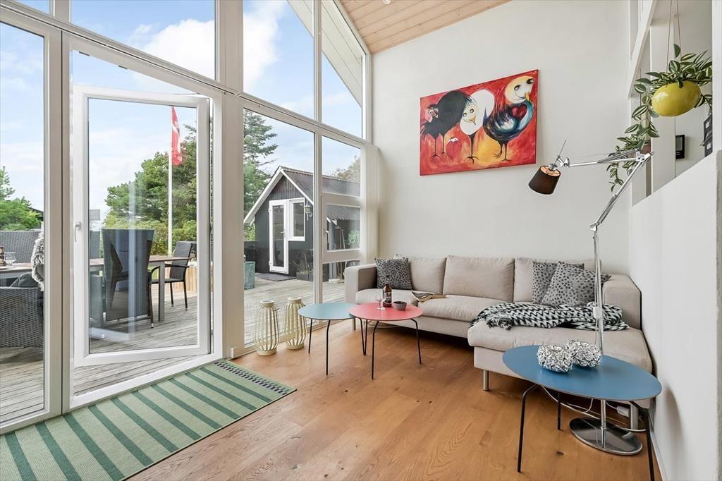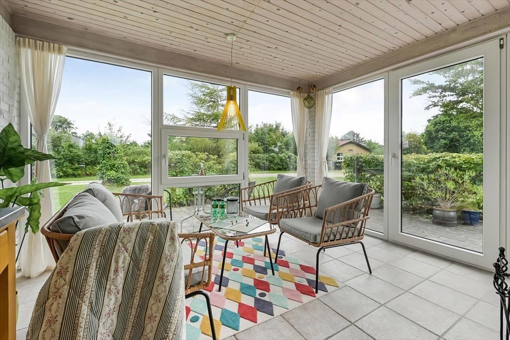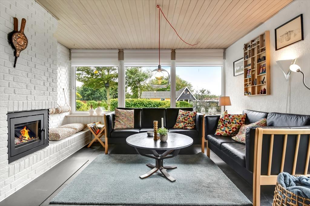 Der er mange skønne opholdspladser at vælge imellem i det 125 m2 store sommerhus, så uanset årstiden og dit humør kan du altid finde et dejligt sted at sidde. Havestuen er et hit på sommerlige dage og aftener, og på en kølig efterårsdag vil du sikkert foretrække at slappe af i en af stuens sofaafdelinger – for eksempel i nærheden af indbygningspejsen. Den hyggelige hems er også et rart sted at være, og du kan oplagt tage en kop kaffe med herop, hvis du vil sidde en stund og kigge ud på fjorden. Køkkenet ligger for øvrigt helt centralt i huset, mens tre gode værelser og et brusebadeværelse er samlet i et soveafsnit.