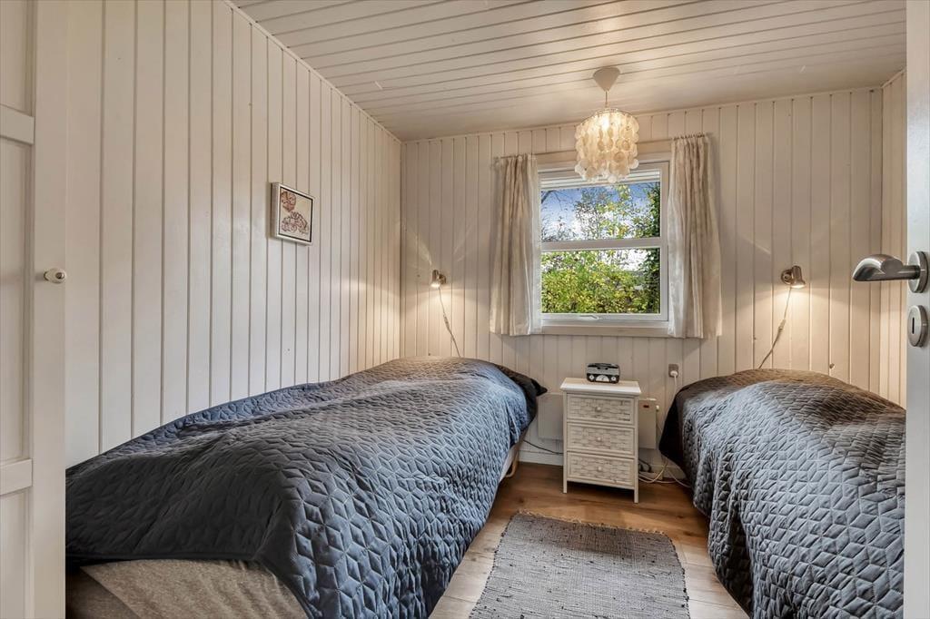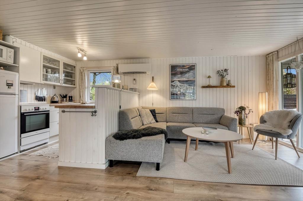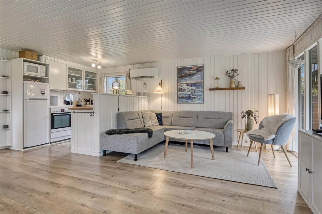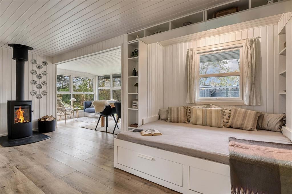 Når du træder ind i dette stemningsfulde sommerhus, bliver du mødt af en lys og indbydende atmosfære. Den hyggelige stue er indrettet med bløde møbler og en brændeovn, der skaber varme og ro på kølige dage. Det åbne køkken gør det nemt at være sammen om madlavningen, og ved spisebordet kan du nyde lange måltider i godt selskab. De tre soveværelser er komfortable og byder på god plads til afslapning efter en oplevelsesrig dag, mens badeværelset har alt, hvad I har brug for. Alt i huset er indrettet, så du straks føler dig hjemme og kan læne dig tilbage og nyde din ferie.
