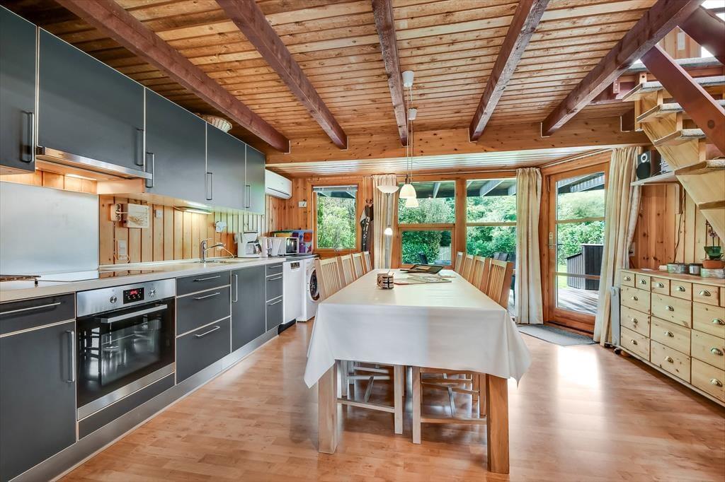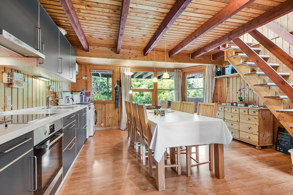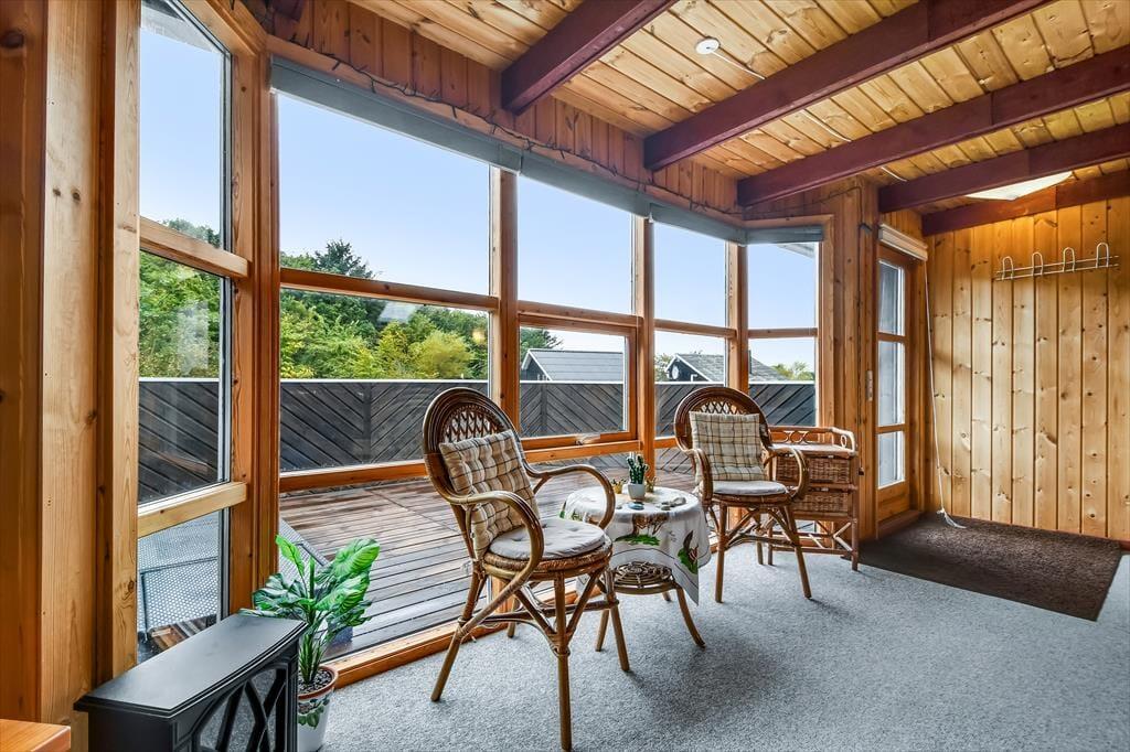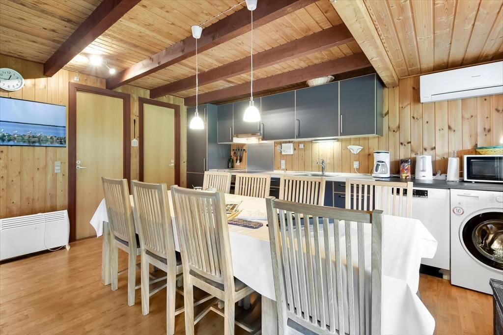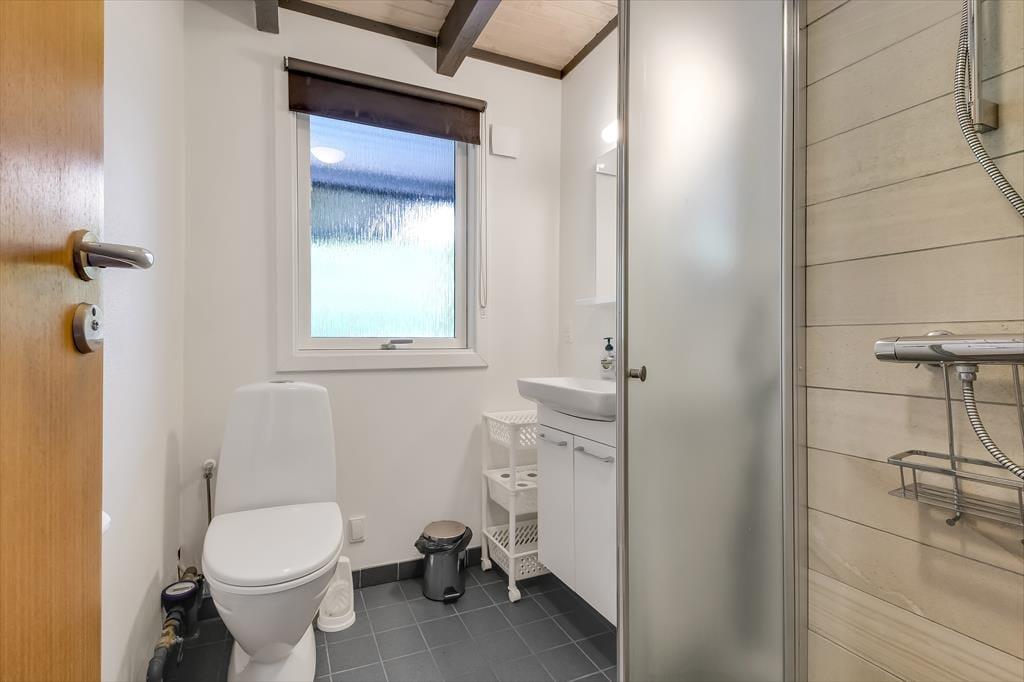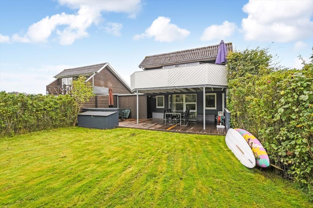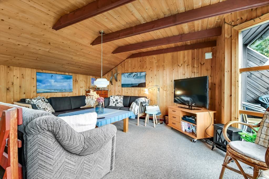 Uanset om du er på ferie med venner eller familie, får I en rar og velfungerende ramme om driverlivet her i huset. Hvis I er opsatte på at bruge størstedelen af tiden ude i det fri, fungerer huset som en god base, når I vender hjem fra surf-, fiske- eller cykelturen – men det er nu også fristende at blive inden døre i timevis for at læse, se film og spille brætspil. Der er to plan at brede sig på, og der er opholdsrum både oppe og nede: Stueetagen byder på et rummeligt spisekøkken, mens en opholdsstue med sofaer og fladskærms-tv er placeret på førstesalen. I det nederste plan ligger der også et brusebadeværelse og to soveværelser, og hvis I har brug for flere sovepladser, er der et aflukke med en ekstra seng på førstesalen.