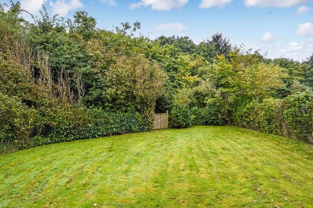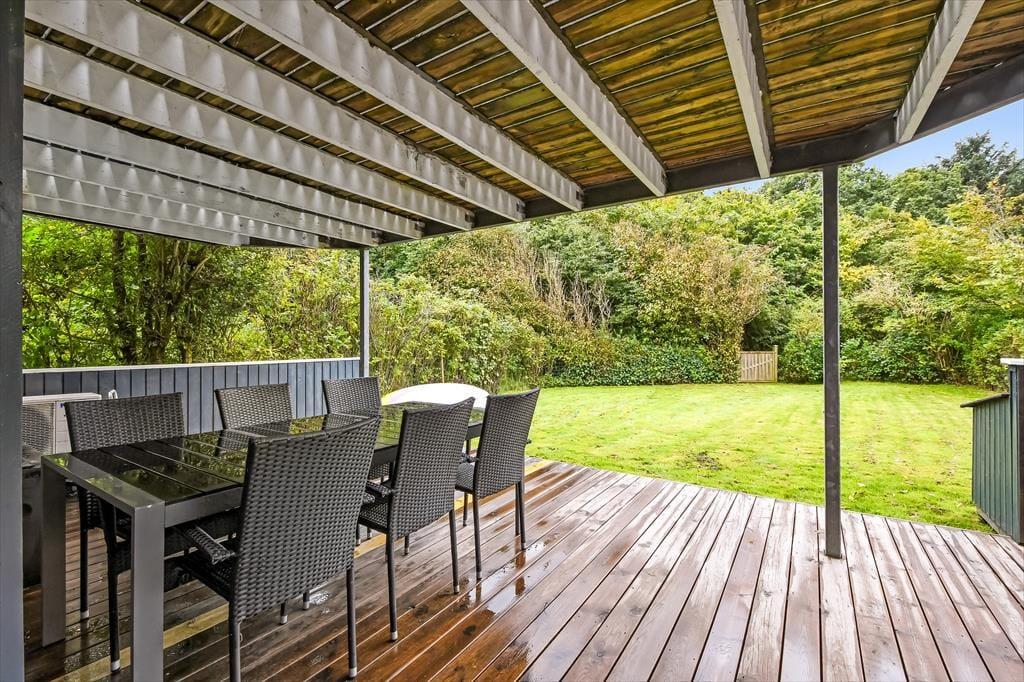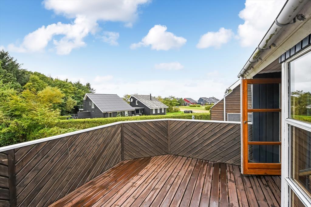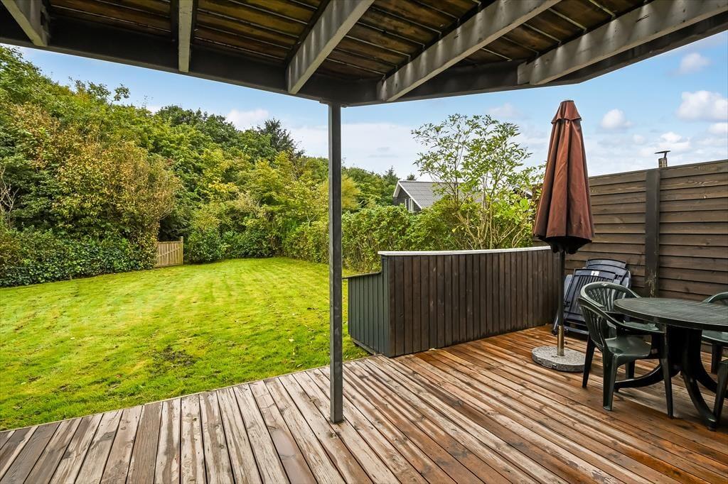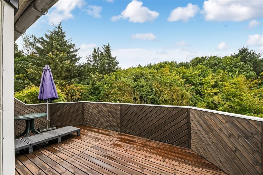 Sommerhusets sydvestvendte og delvist overdækkede terrasse er et hit, når solen skinner, men den får skarp konkurrence af førstesalens altan, for det er også et skønt sted at nyde det gode vejr. Uanset om du opholder dig oppe eller nede, har du udsigt til det lille skovstykke, der breder sig for enden af grunden, og mon ikke du også kan nyde lyden af fuglesang fra trækronerne, når du læner dig tilbage i havemøblerne. Baghavens græsplæne skærmes af randbeplantning, så I kan lege og spille bold i ugenerede og rolige omgivelser, og ud mod vejen er der et grusbelagt areal, hvor bilen kan holde.