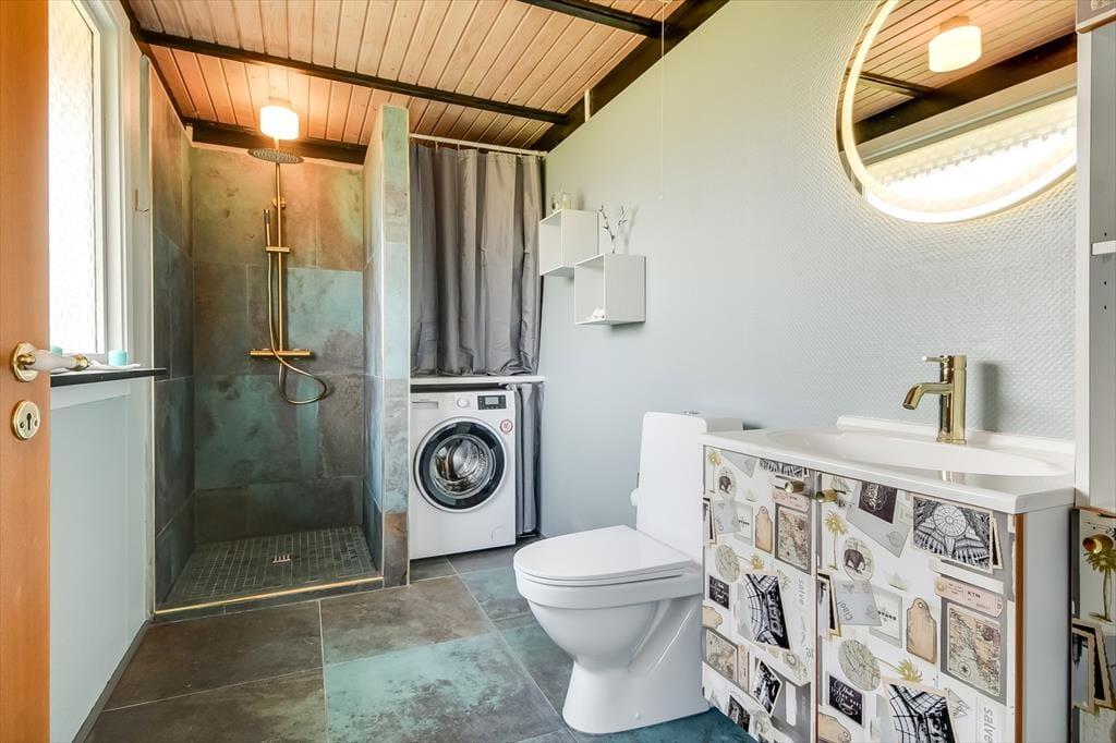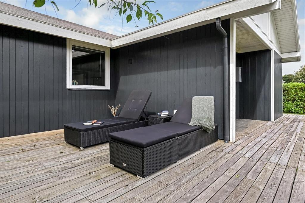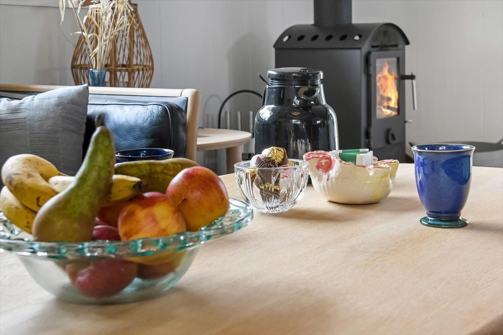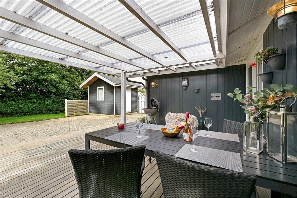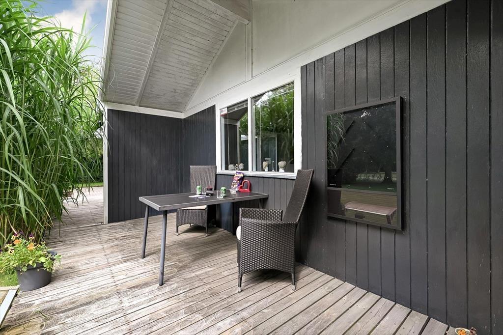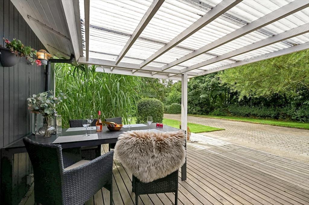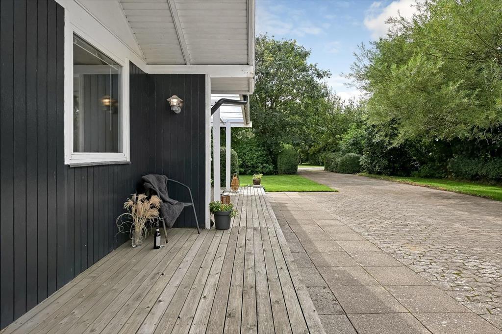 Fra stuen træder du direkte ud på en dejlig træterrasse, der inviterer til solrige dage og hyggelige grillmiddage. Terrassen er afskærmet, så både børn og hunde kan lege trygt, mens de voksne nyder en kølig drink i skyggen. Haven er stor og grøn med plads til leg og boldspil, og den korte afstand til fjorden gør det nemt at tage en aftentur og nyde solnedgangen eller blot gå en tur langs vandet med hundene.
