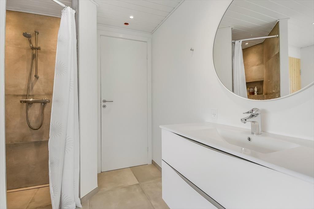 Sommerhuset byder på en lys og indbydende atmosfære, hvor den hyggelige indretning straks får dig til at føle dig hjemme. Den åbne planløsning mellem stue og køkken skaber et naturligt samlingspunkt, hvor familien kan nyde hinandens selskab, hvad enten det er over en lækker middag eller en brætspilsaften. De store vinduespartier lader dagslyset strømme ind og giver en dejlig udsigt til de naturskønne omgivelser.